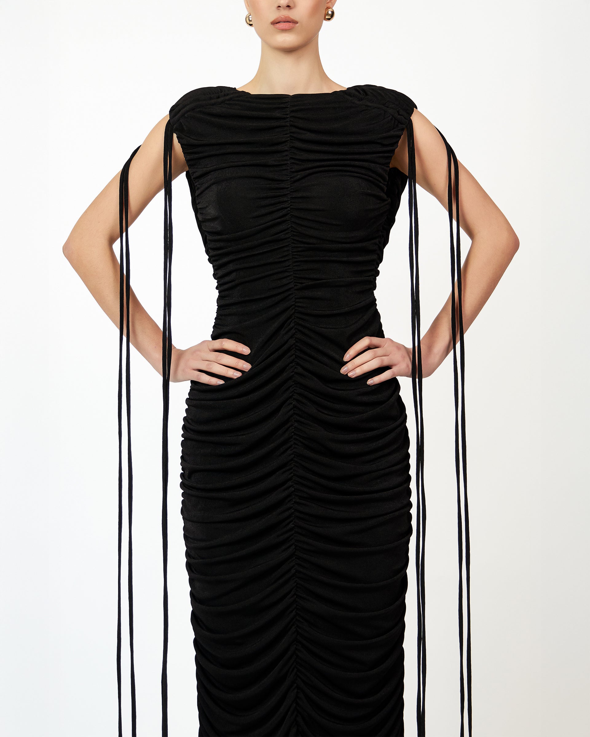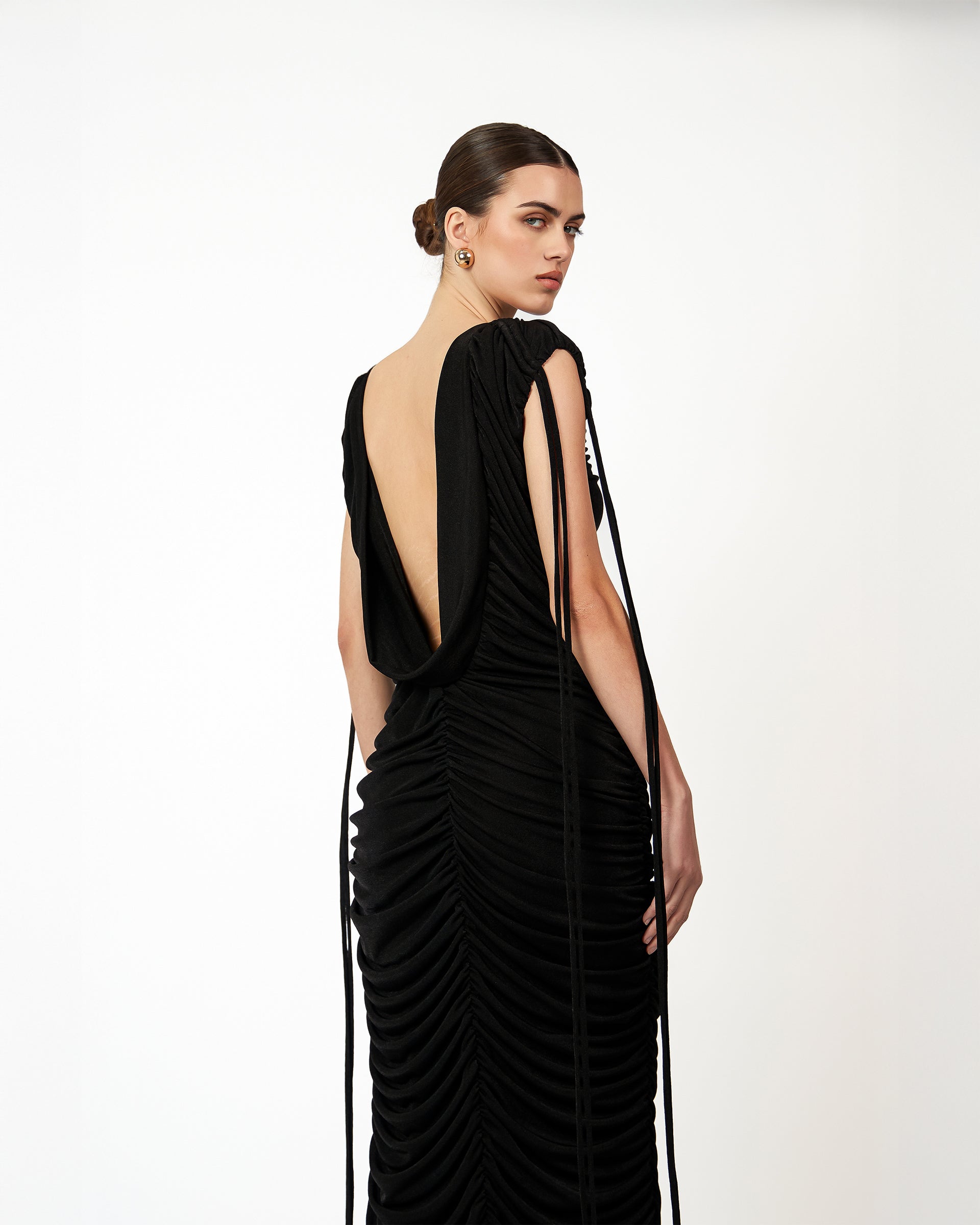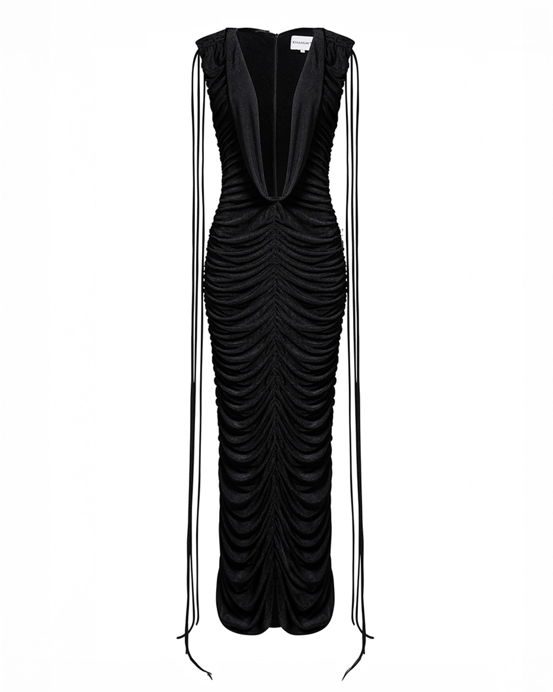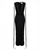 The Kaeli Maxi Dress is the epitome of effortless luxury, designed with versatility in mind. Crafted from a sumptuously soft, flowing fabric, this statement piece features elegant ruched gathering that creates a flattering, sculpted silhouette. Fully reversible, Kaeli offers two distinct looks: a sophisticated boatneck for timeless elegance or a draped cowl front, accentuated by an adjustable drawstring at the shoulder seam for a customizable fit. Whether you’re sipping cocktails with your girls or stealing the spotlight on a romantic night out, Kaeli moves with confidence and grace—because unforgettable moments deserve an unforgettable dress.