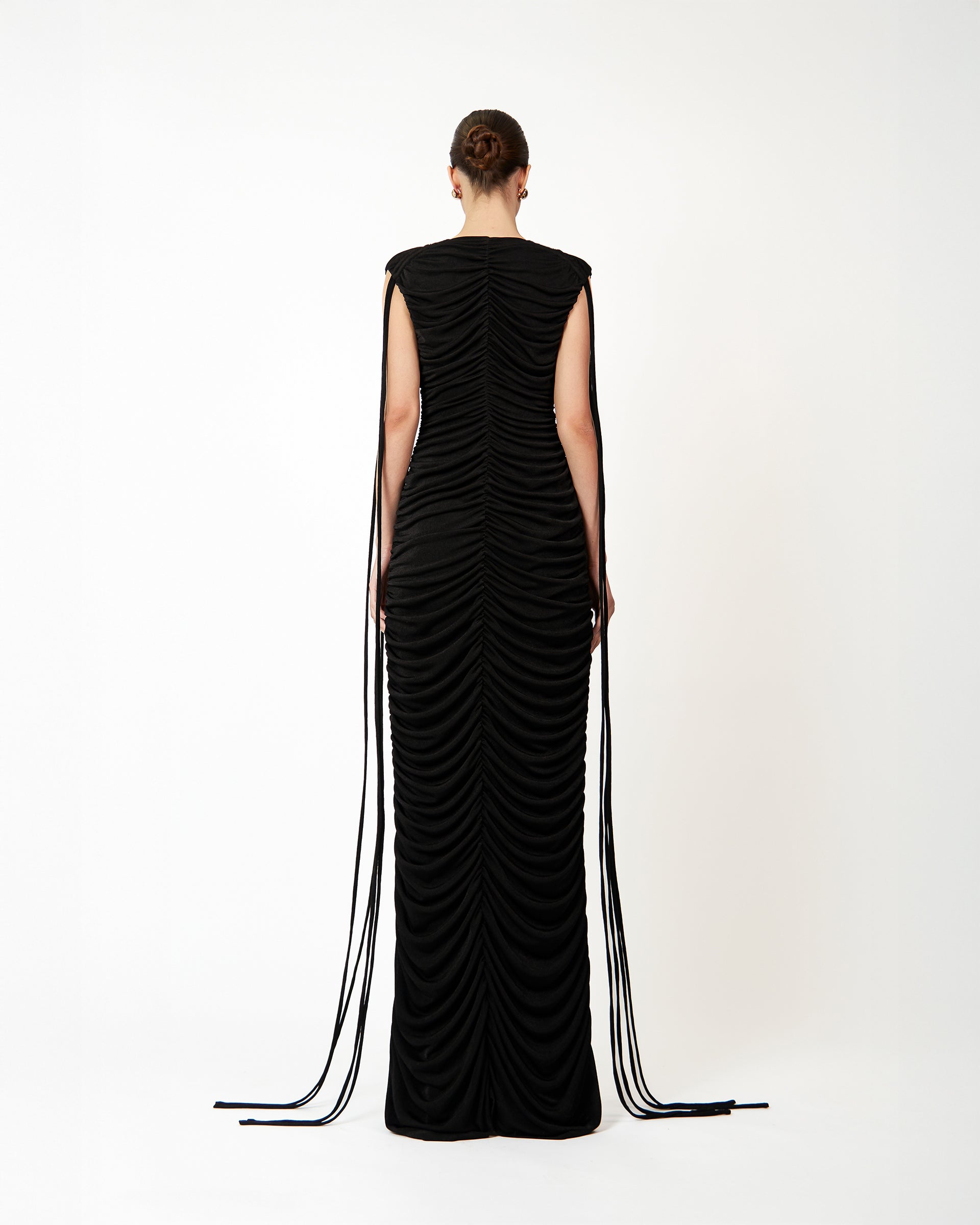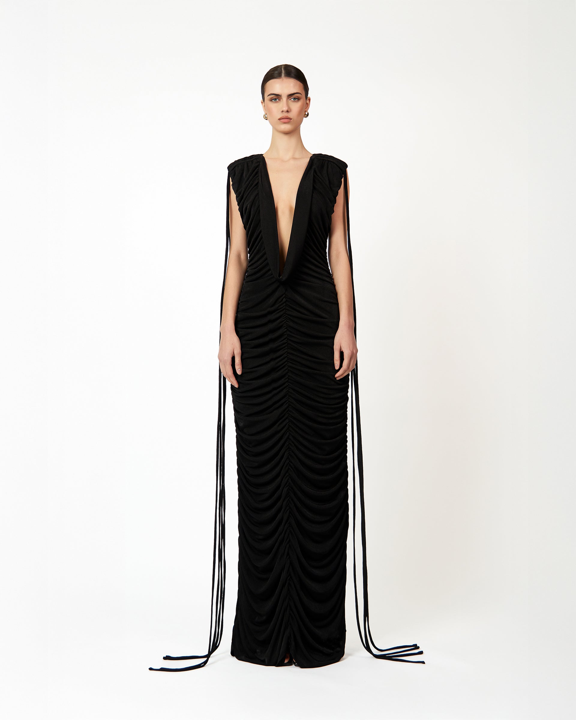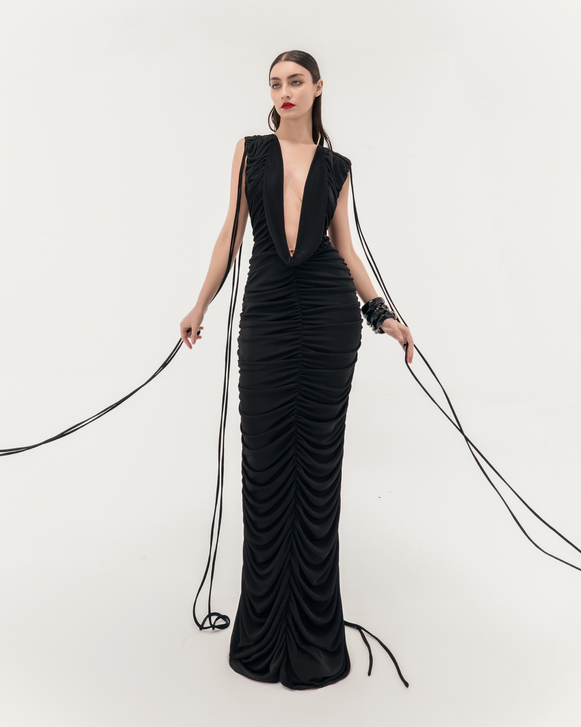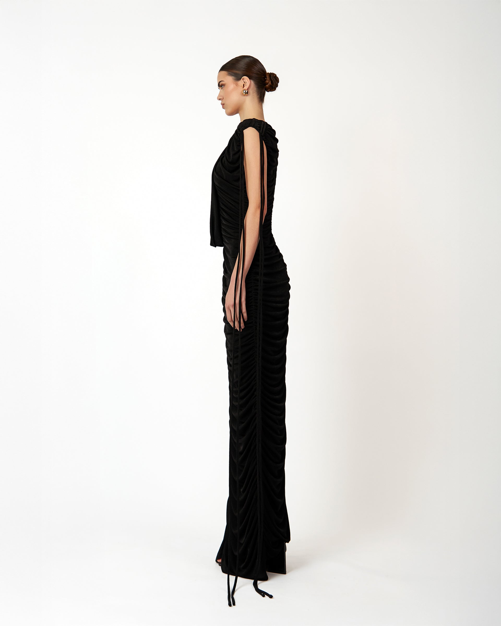 The Kaeli Maxi Dress is the epitome of effortless luxury, designed with versatility in mind. Crafted from a sumptuously soft, flowing fabric, this statement piece features elegant ruched gathering that creates a flattering, sculpted silhouette. Fully reversible, Kaeli offers two distinct looks: a sophisticated boatneck for timeless elegance or a draped cowl front, accentuated by an adjustable drawstring at the shoulder seam for a customizable fit. Whether you’re sipping cocktails with your girls or stealing the spotlight on a romantic night out, Kaeli moves with confidence and grace—because unforgettable moments deserve an unforgettable dress.