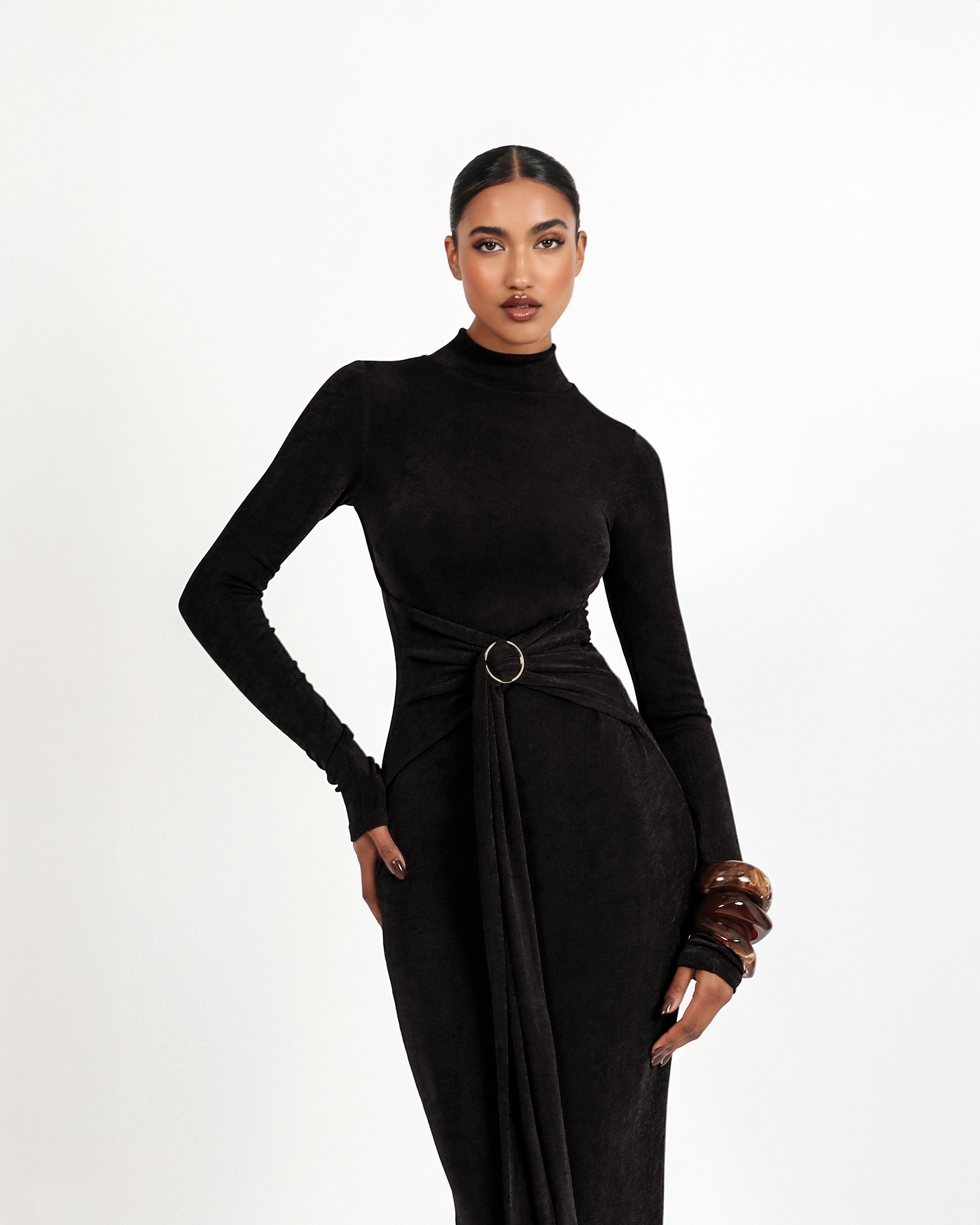 The Khrissy dress takes inspiration from the timeless elegance of the '60s and '70s, making it an ideal choice for the party season. Crafted in London by skilled artisans, it’s made from slinky textured lycra that elegantly drapes over your frame, creating a sleek and sophisticated silhouette. Perfect for evening events or New Year's celebrations, the Khrissy dress shines when paired with statement earrings or bold accessories. Get ready to turn heads and light up the night.