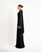 The Krace dress is the epitome of timeless elegance and refined beauty. Crafted from crepe scuba, it features slightly flared sleeves and an A-line silhouette that skims the figure perfectly. The attached scarf is finished with a delicate pearl trim, imparting a touch of exquisite luxury. Pair with heels to allow the floor-length hem to sweep with poise and grace.