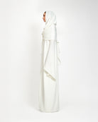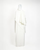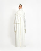 The Katima scarf exudes elegance with its soft, flowing georgette fabric, designed for effortless wrapping and draping. Delicately adorned with hand-stitched pearls along the borders, it perfectly complements the Kayesha abaya, adding a touch of refined luxury to any ensemble.