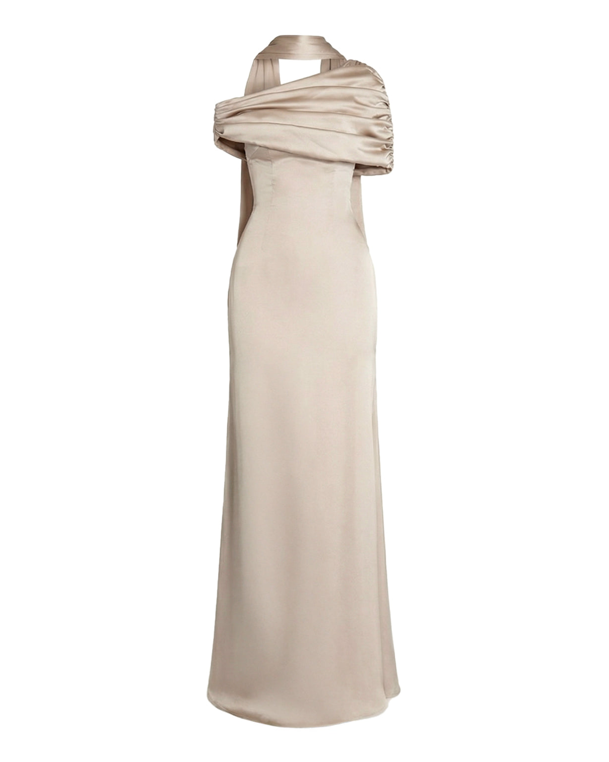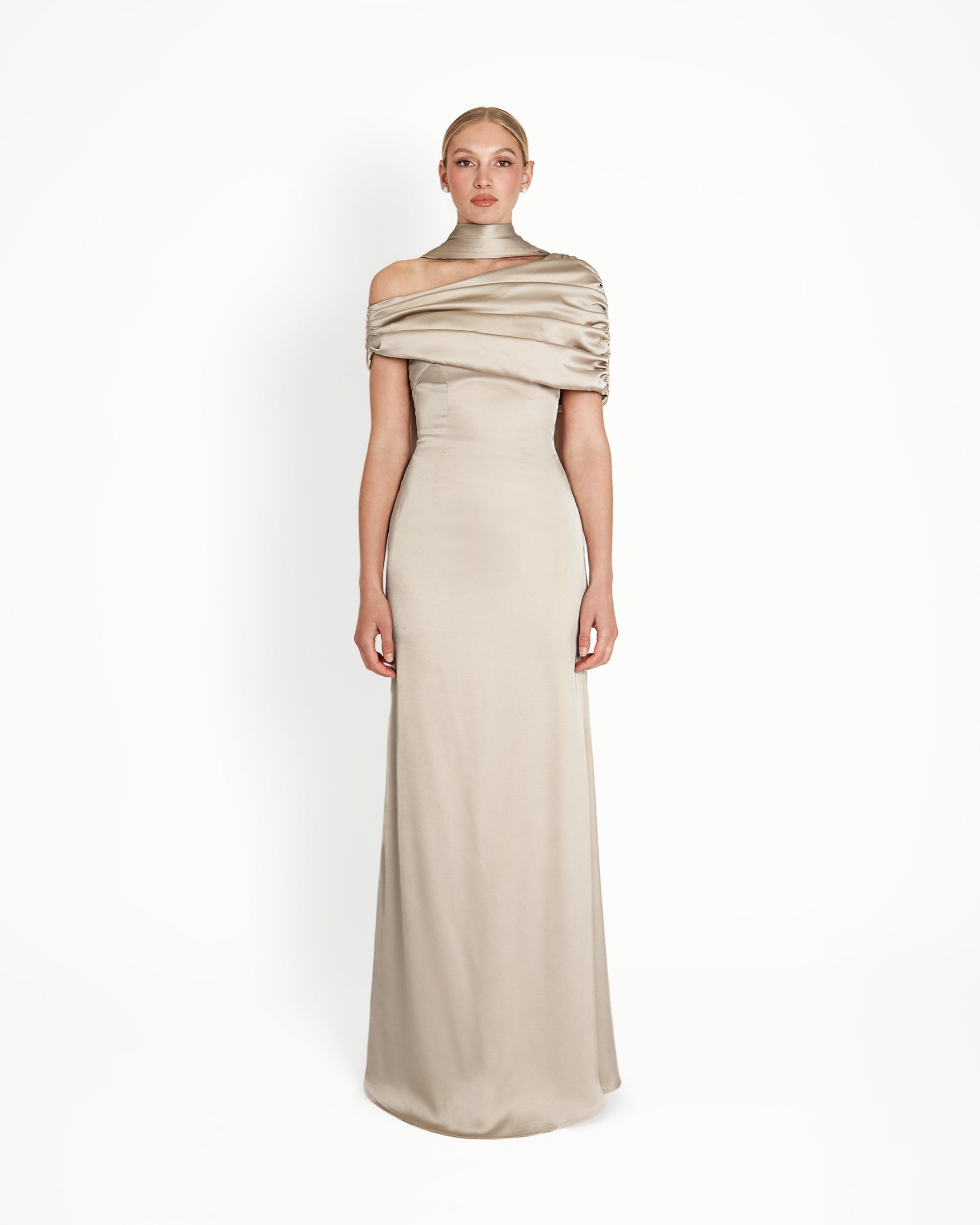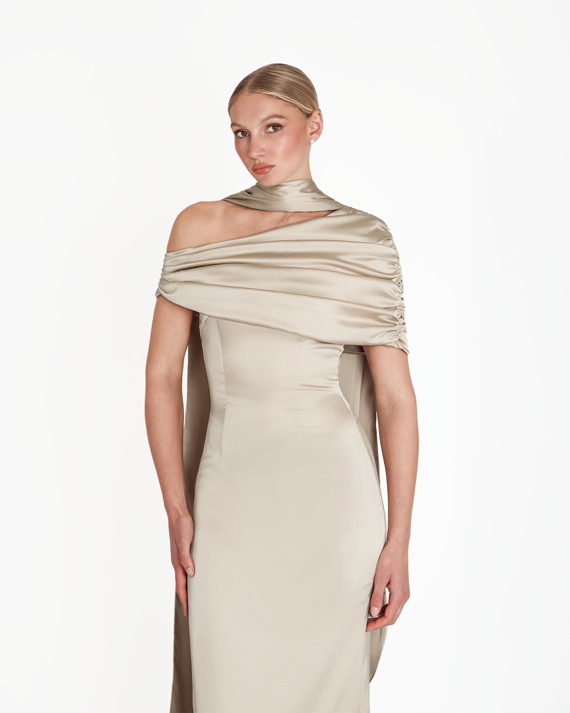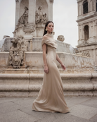 The Kiris Dress in champagne features a gathered Bardot neckline and flowing A-line silhouette for a flattering, elegant fit. Its timeless yet modern design moves gracefully, making it perfect for bridesmaids, weddings, dinner dates, cocktail parties, and holidays, combining effortless sophistication with versatile, standout style.