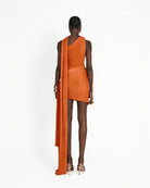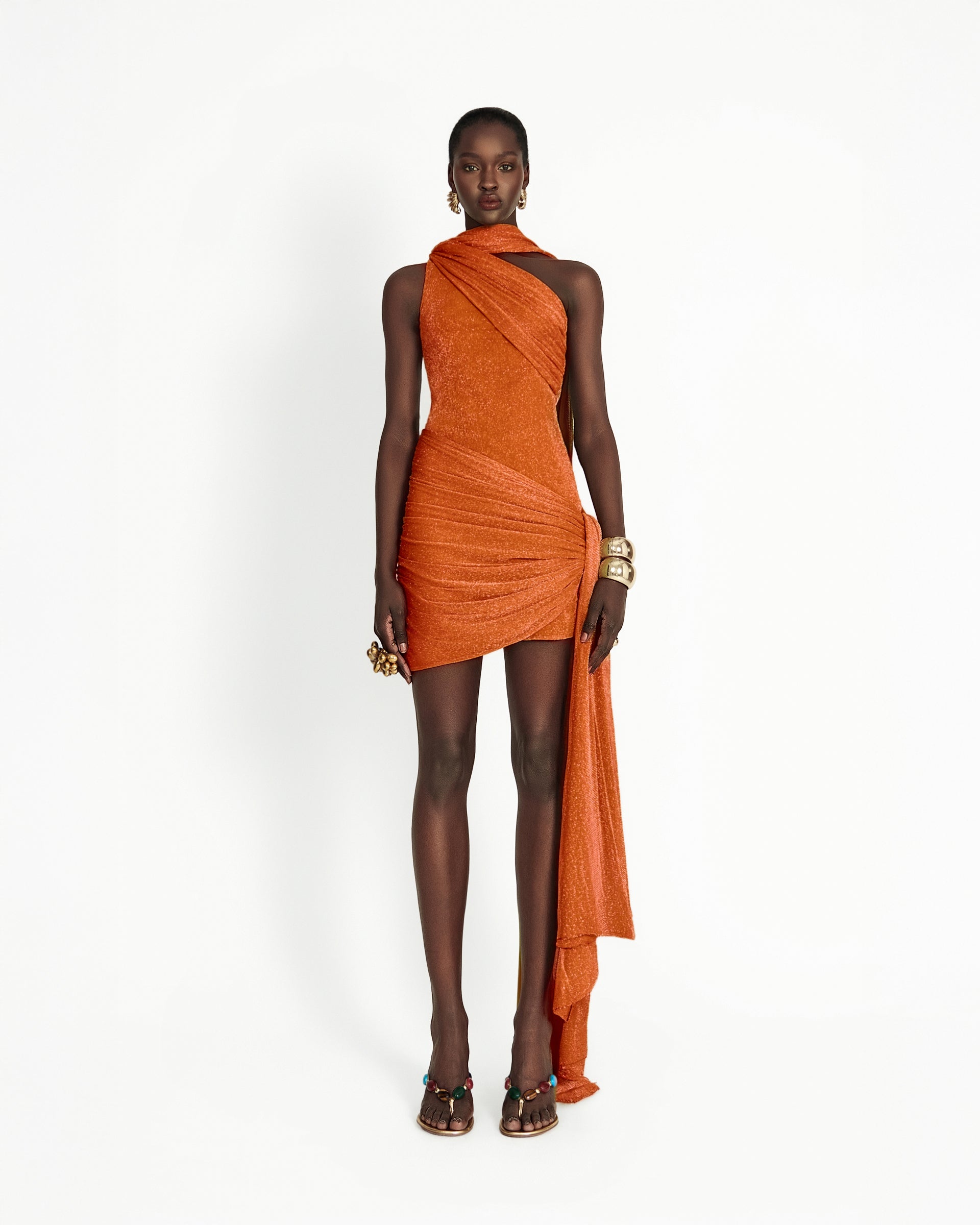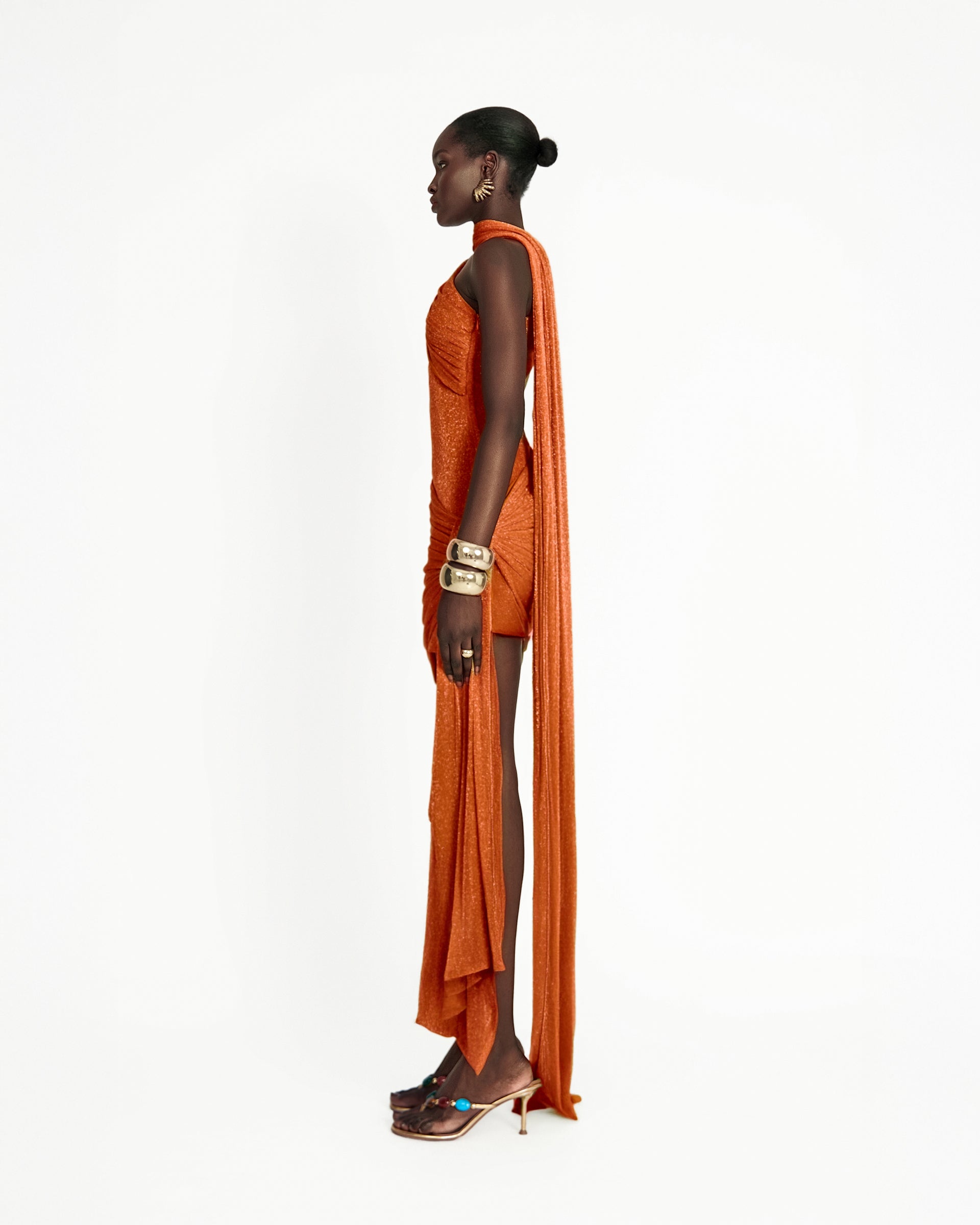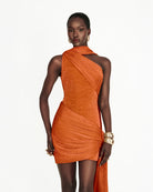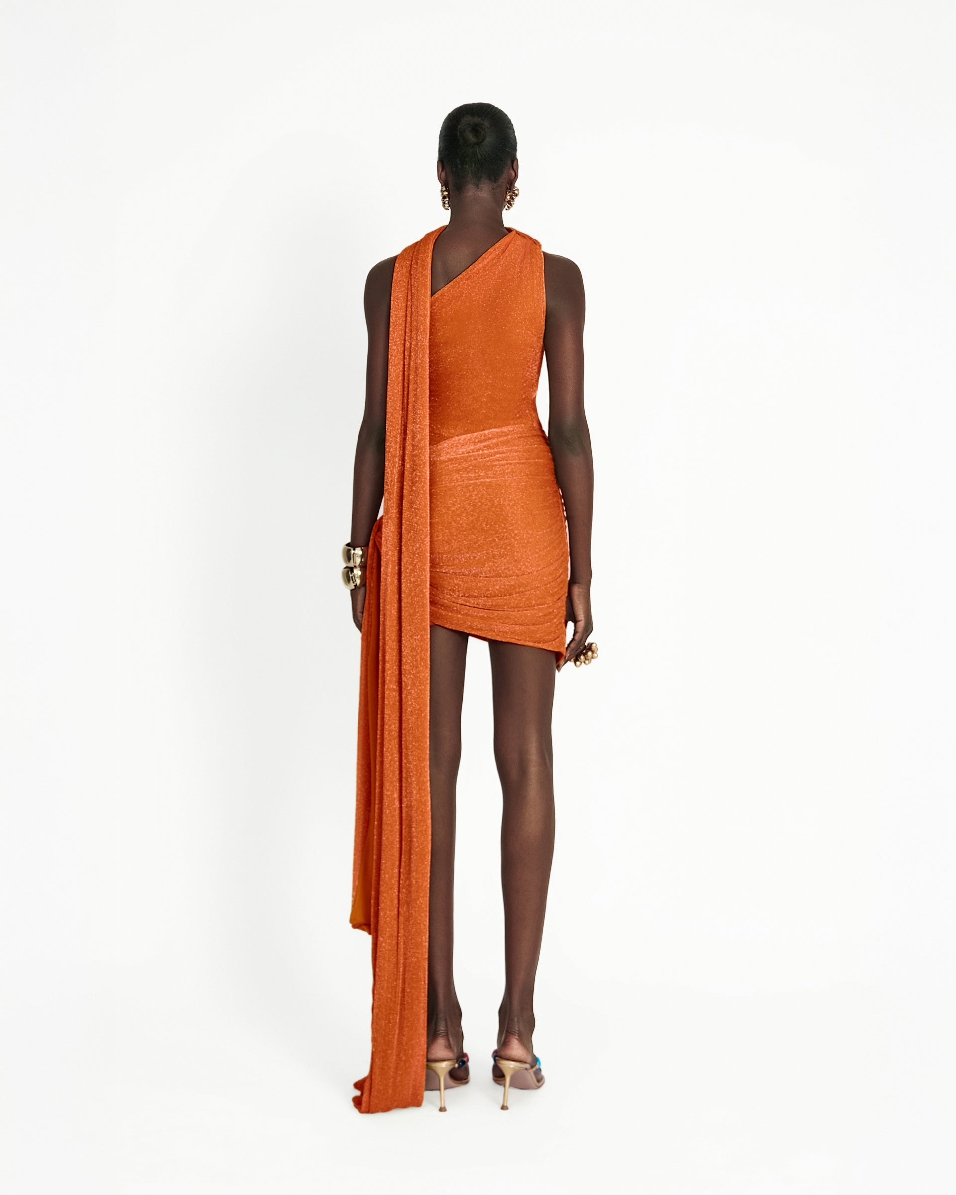 Crafted from shimmering stretch mesh, the Kruz Mini Dress is intentionally sheer, designed for versatility, it can be worn with the gathered panel draped across the shoulder for added drama, or reversed for a cleaner silhouette. Finished with a floor-length sash and matching shoulder scarf, it’s the perfect statement piece for evenings when you want to stand out.