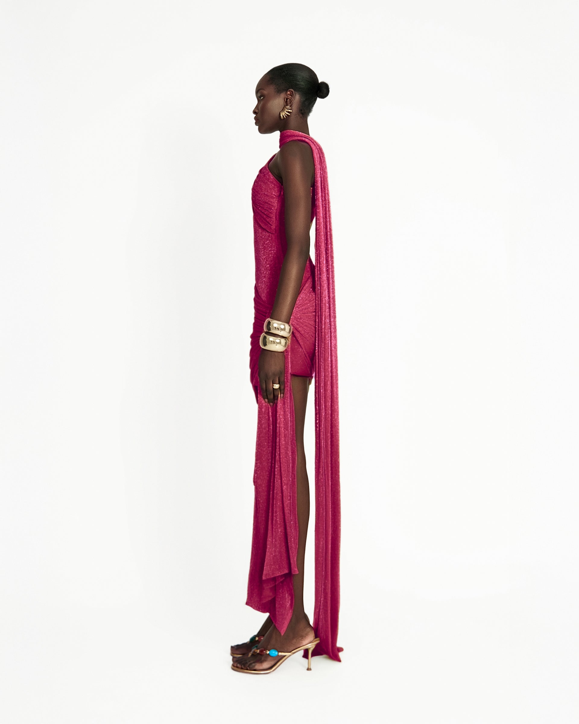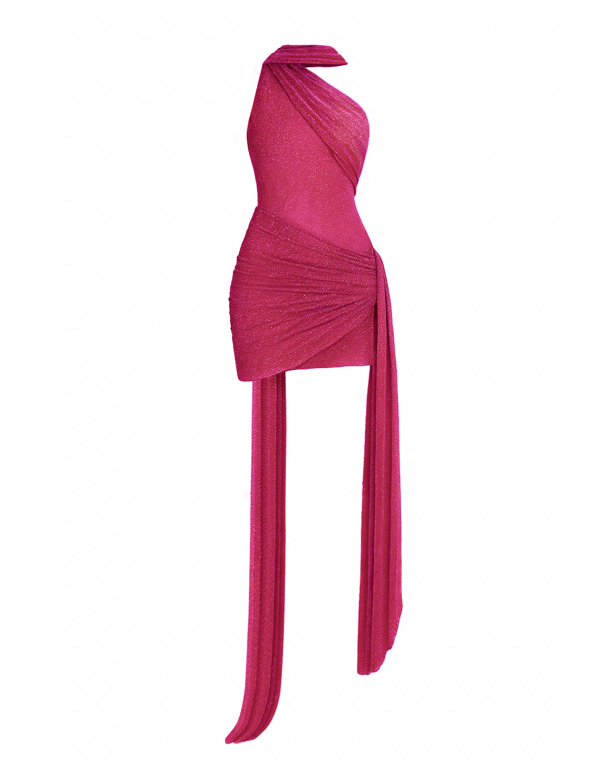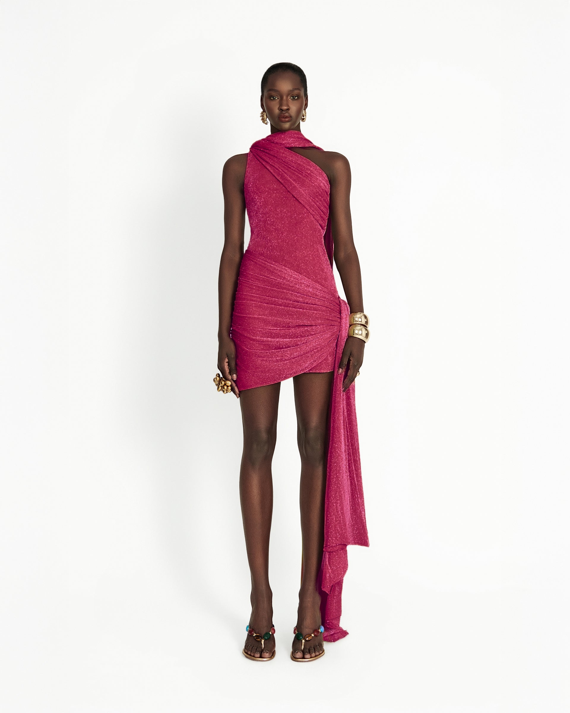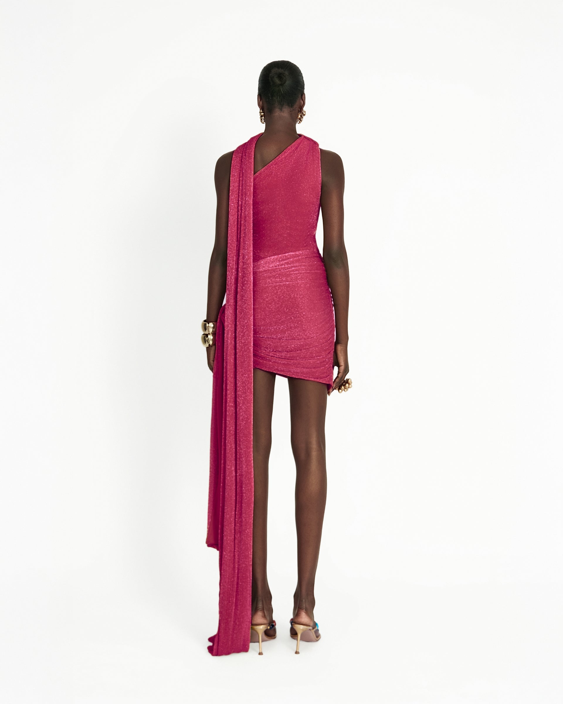 Crafted from shimmering stretch mesh, the Kruz Mini Dress is intentionally sheer, designed for versatility, it can be worn with the gathered panel draped across the shoulder for added drama, or reversed for a cleaner silhouette. Finished with a floor-length sash and matching shoulder scarf, it’s the perfect statement piece for evenings when you want to stand out.