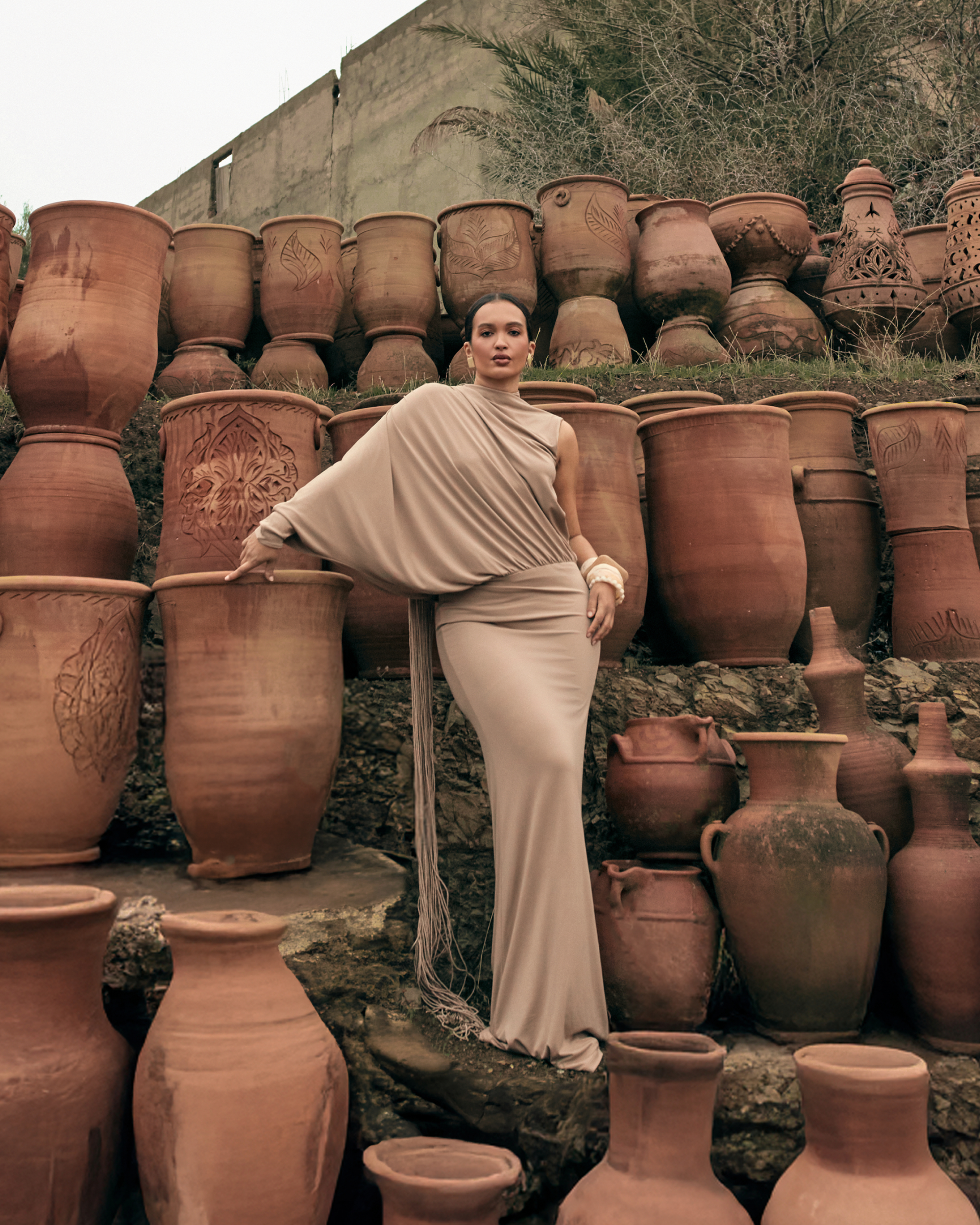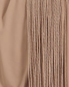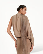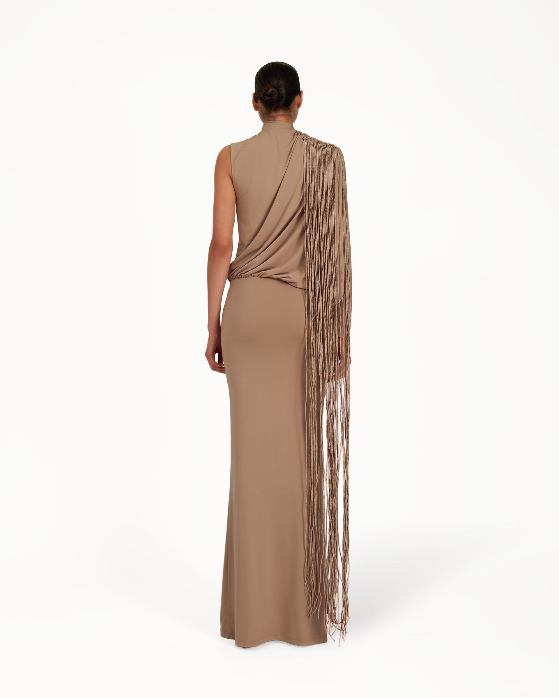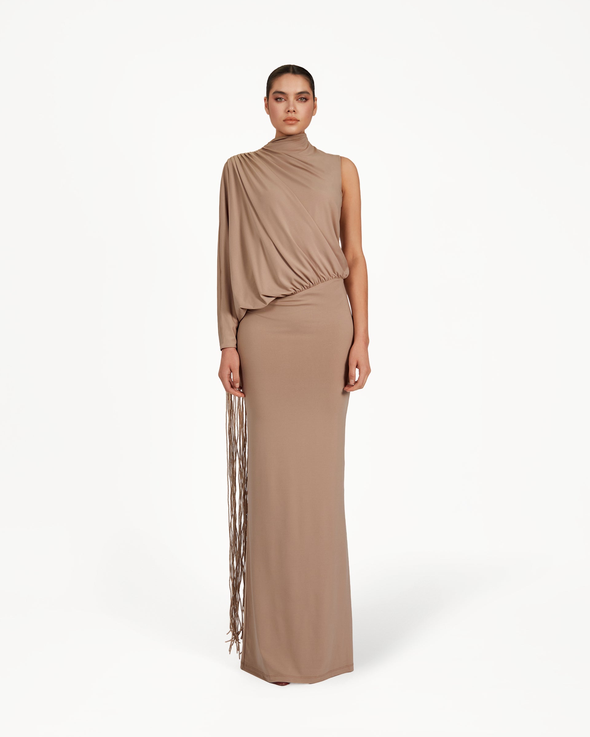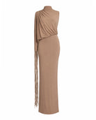 The Kanim Dress is a taupe one-shoulder occasion dress where cascading fringes and sculpted draping create movement-led elegance. Featuring a gathered waist and statement balloon sleeve, it delivers playful sophistication, ideal for summer soirées, fashion-forward dinners, and holiday evenings with a couture-inspired feel.