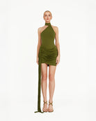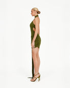 The Karelle Mini Dress in khaki green is a striking one-shoulder design made from recycled jersey with a gathered sarong detail at the waist. Delicate fringes cascade from the waist, adding movement and a playful, elegant edge. The fitted silhouette flatters the figure while combining modern sophistication with effortless glamour, making it a standout piece for evening events or special occasions.
