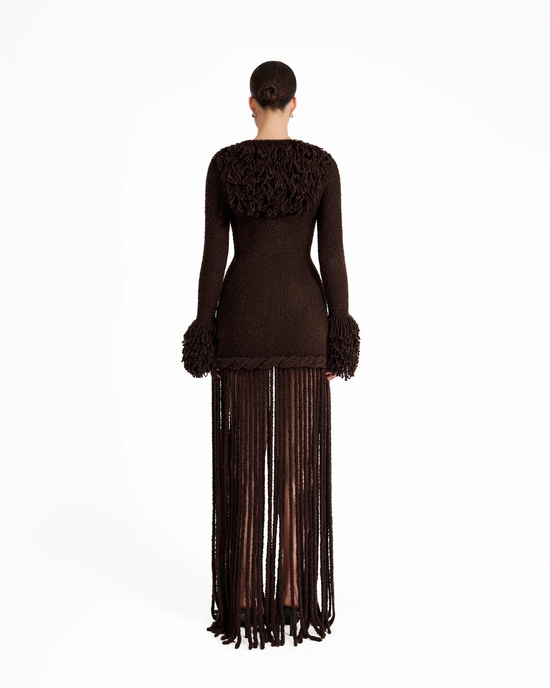 The Kaye Dress in brown is a chic yet effortless design, crafted from a soft knit fabric that flatters the body while keeping you cozy. Finished with floor-sweeping fringed detailing for movement and attitude, this piece blends laid-back elegance with a modern, fashion-forward edge. Perfect for stylish girls who love comfort with impact, it offers versatility, texture, and statement appeal in one refined silhouette.