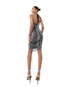 There's more than first meets the eye with the Kleo dress. Spun from layers and layers of bugle bead detailing, this statement style has a low back cutout that's tied in with a adjustable strap halter neck. The chandelier style geometric and monochrome embellishment detail reveal flashes of intricacy which guarantees to gets any head turning. Style your look with diamanté's studs and some leather boots for a edgy twist to a classic look.