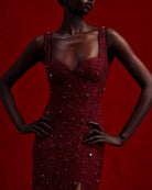 The Kroon dress is the definition of opulence. She's a showstopper and should only be worn if you're after something not many others have. Cut from burgundy soft stretch mesh, this design is embellished with crystal bugle beads and covered with diamanté's. Style yours with stilettos or pumps to let everyone know, you're the woman of the show.