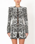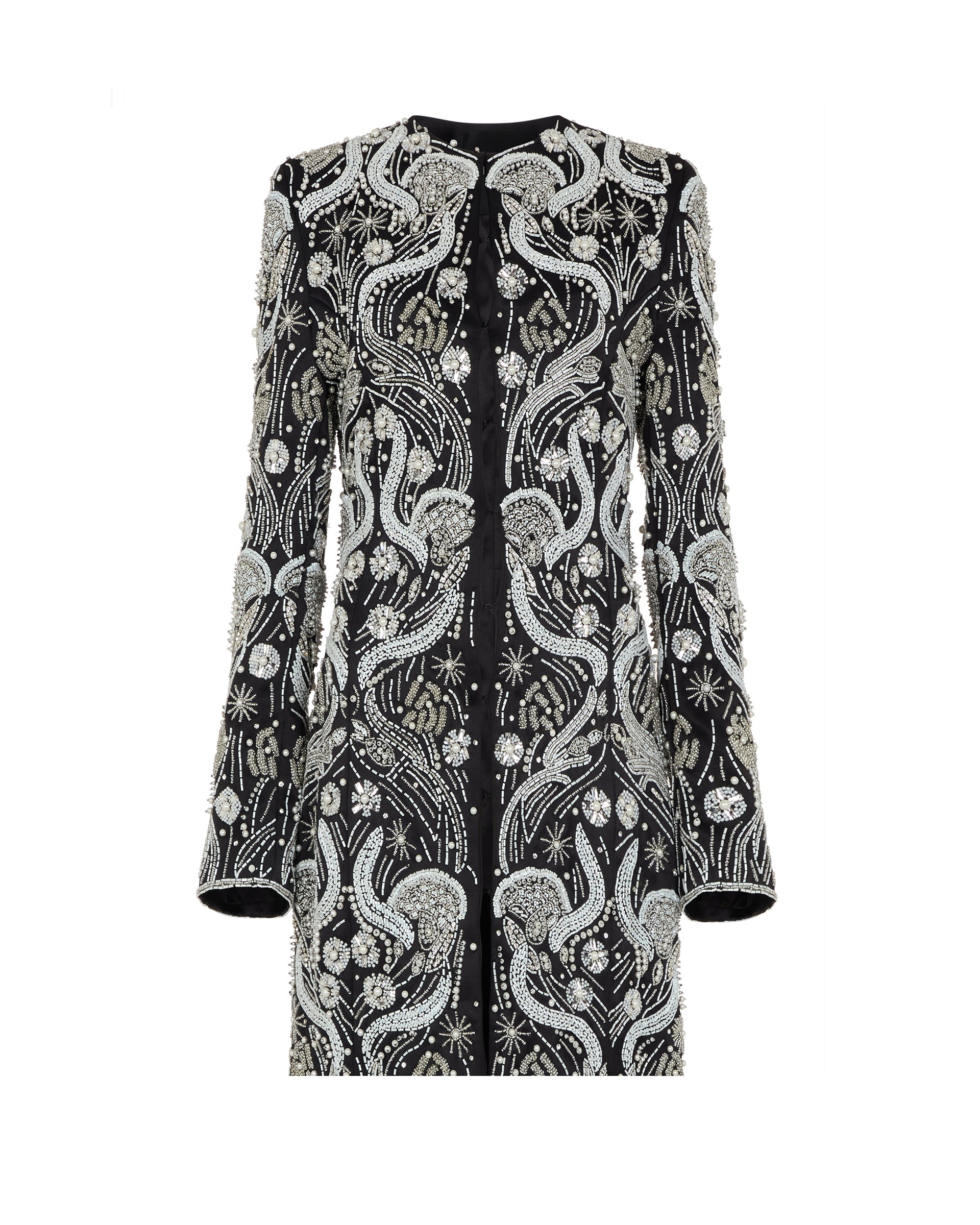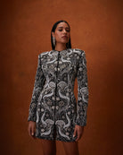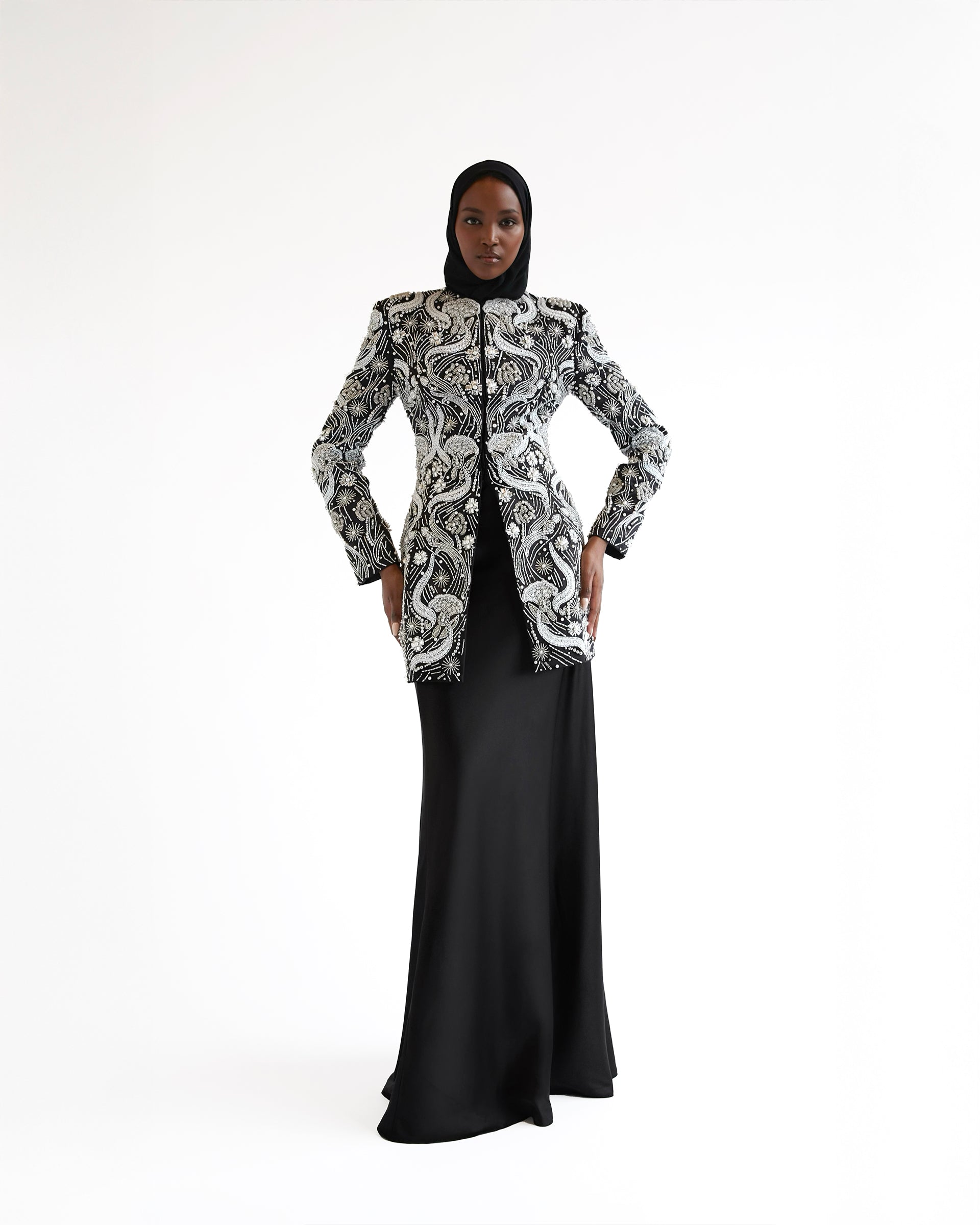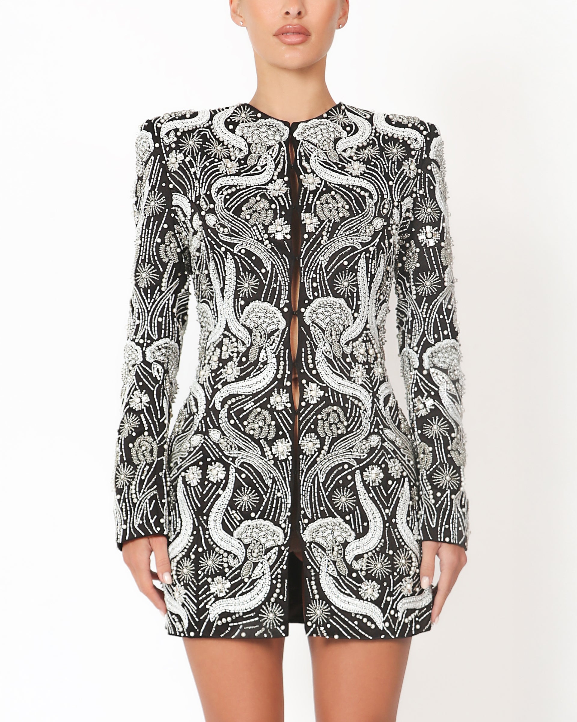 Our Kamla Blazer injects our love of traditional South Asian craftmanship with even more ornate details - this interpretation is hand embellished with clusters of it's hand embellished with thousands of scintillating details such as faux pearls and sparkling crystals. Made from duchess satin. This blazer dress is a showstopper and can be worn in several ways.