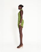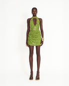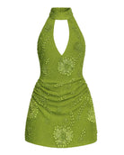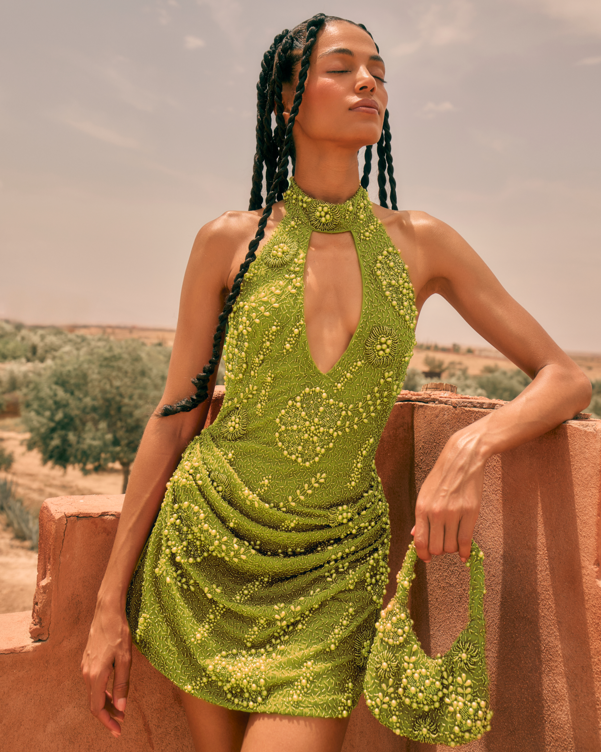 The Kumta Dress is the essence of modern sophistication and artisanal detail. Made using stretch power mesh, it features a v neckline that beautifully frames the silhouette. Intricately embellished with rhinestones, bugle beads, and pearls, this fitted and structured dress is accented by ruched cowl detailing at the hip for a flattering finish. Crafted to combine exquisite craftsmanship with refined elegance, this dress is perfect for unforgettable evenings. Pair it with statement heels and delicate accessories to complete a look that commands attention and exudes confidence.