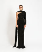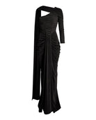 The Kemmiye Dress exudes refined luxury and modern elegance. Featuring a dramatic one-sleeve design, it is highlighted by a beautifully draped scarf detail that cascades elegantly at the neckline. The dress is designed with rouching throughout, sculpting the figure and accentuating every curve, with its asymetric neckline and texture, the Kemmiye Dress offers the perfect balance of sensuality and high-end refinement, making it an unforgettable choice for those seeking a bold yet sophisticated statement.