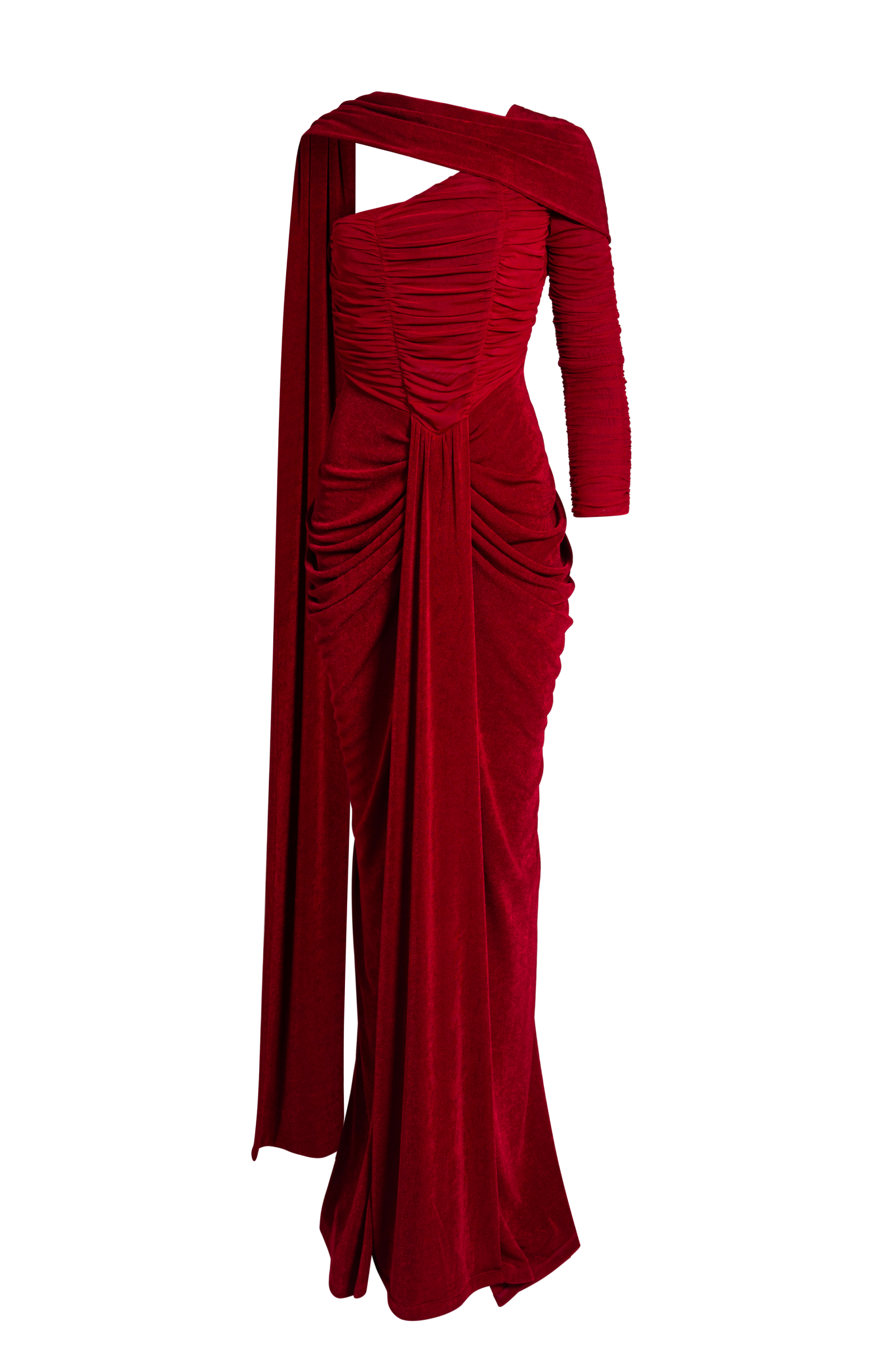 The Kemmiye Dress exudes refined luxury and modern elegance. Featuring a dramatic one-sleeve design, it is highlighted by a beautifully draped scarf detail that cascades elegantly at the neckline. The dress is designed with ruching throughout, sculpting the figure and accentuating every curve, with its asymmetric neckline and texture, the Kemmiye Dress offers the perfect balance of sensuality and high-end refinement, making it an unforgettable choice for those seeking a bold yet sophisticated statement.