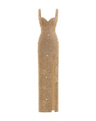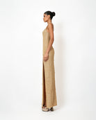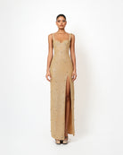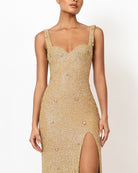 The Kroon dress is the definition of opulence. This embellished gold dress is a showstopper and should only be worn if you're after something not many others have. Cut from champagne gold, soft stretch mesh, this design is embellished with crystal bugle beads and covered with diamanté's. Style yours with stilettos or pumps to let everyone know, you're the woman of the show.