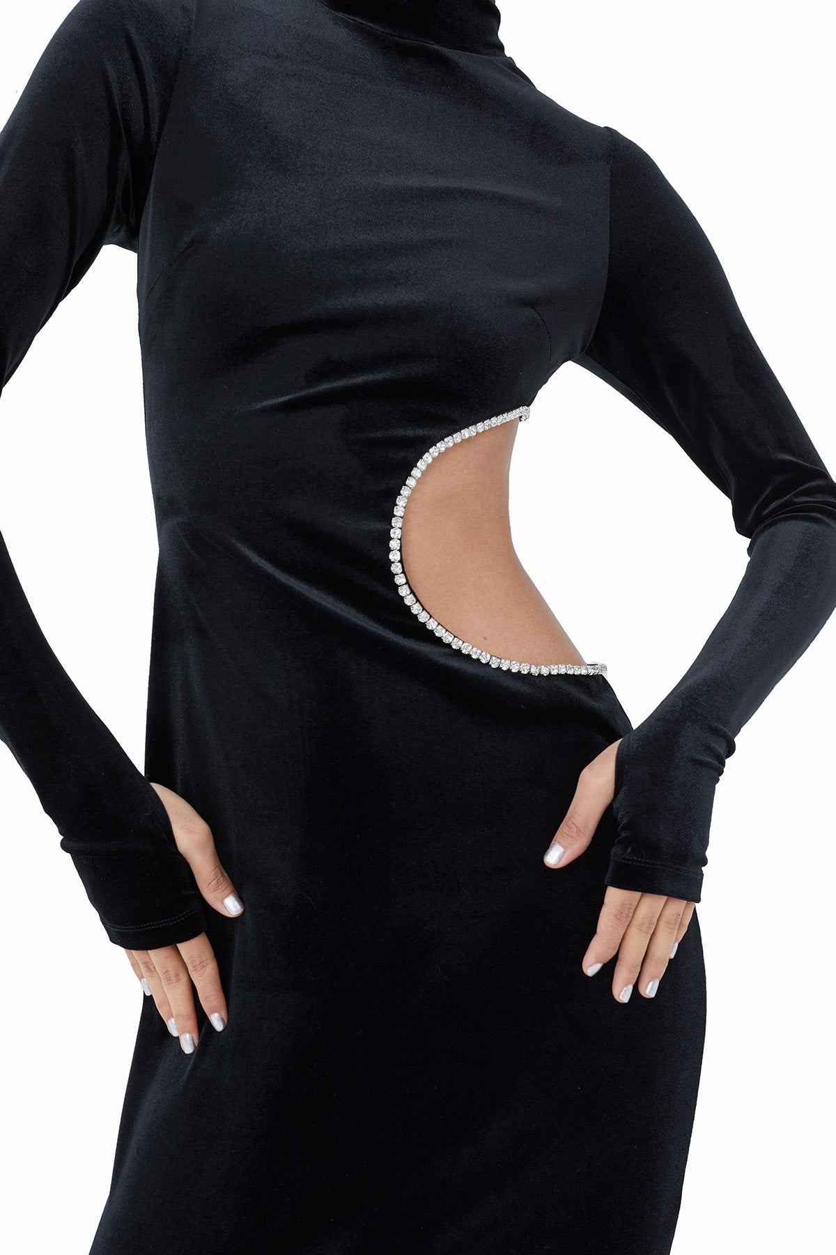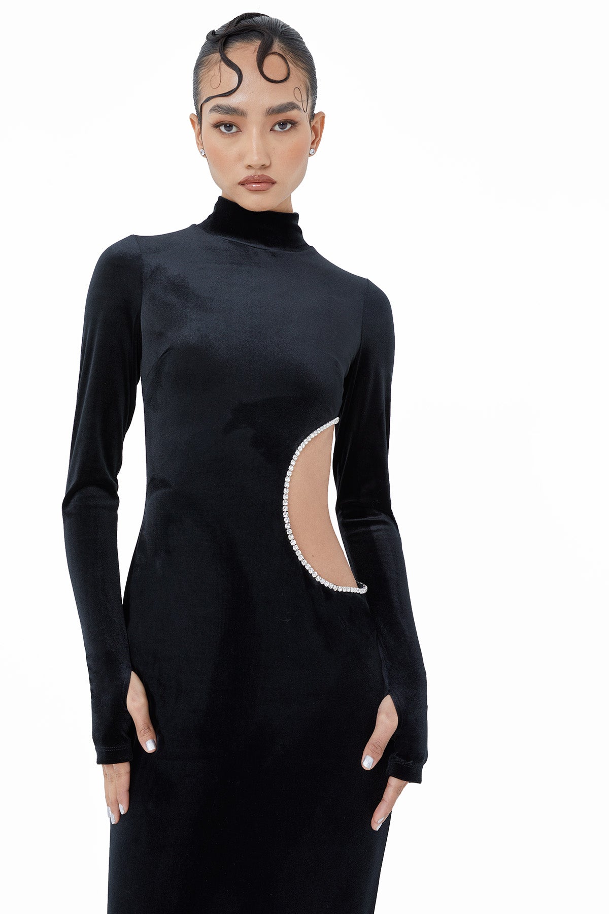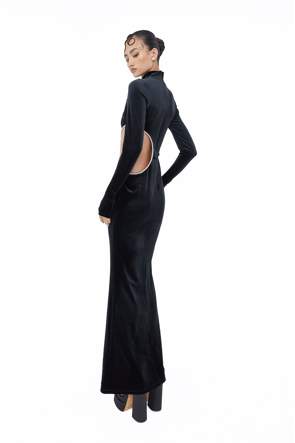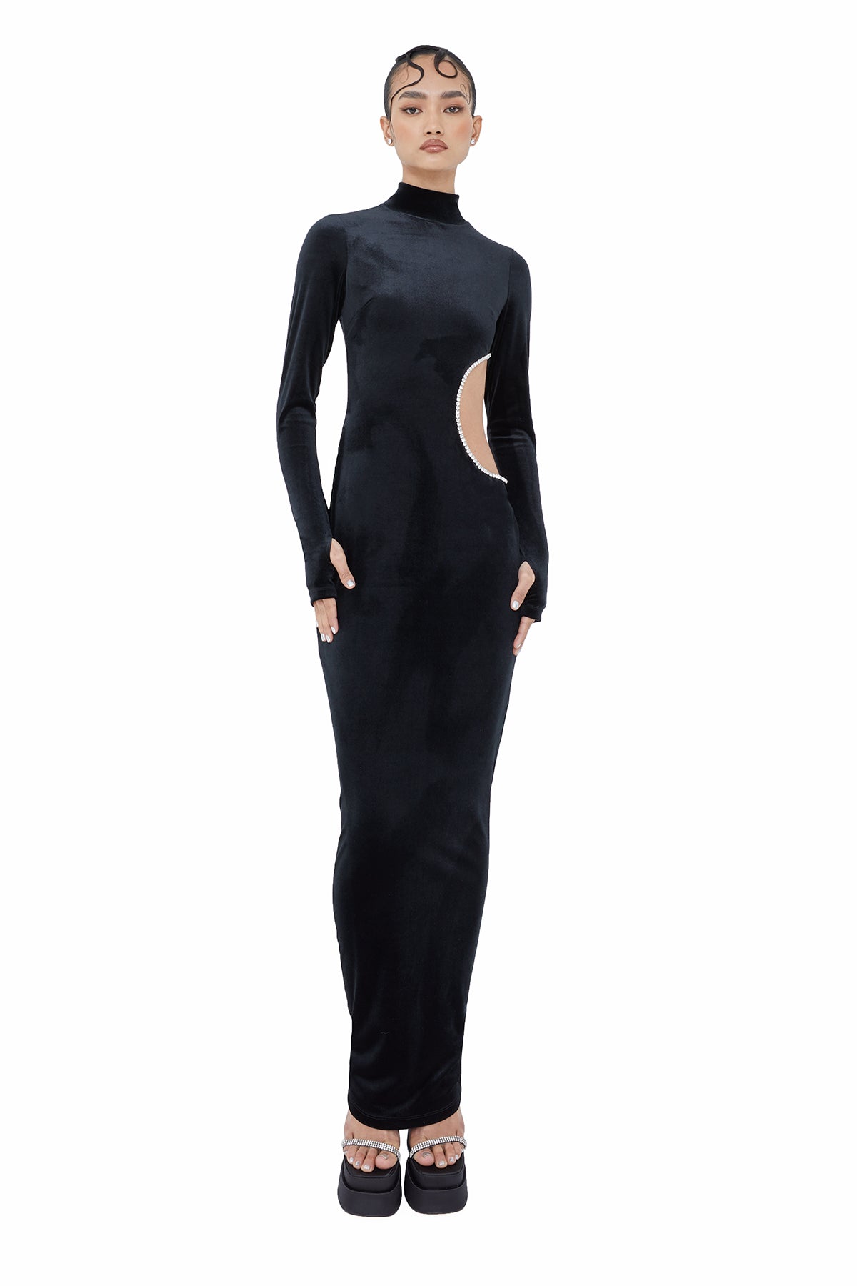 Our Kaudrey dress was designed with a confident, classy woman in mind. A classic floor length silhouette, with a cut out adorned in diamanté's, this dress is a timeless masterpiece perfect for any occasion. wear yours with statement diamanté's earrings to finish the look.