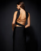 The 'Kivia' dress is made from panels of double lined lycra that are wrapped to create beautiful design. Designed for a figure-hugging fit, it has a halterneck, gold buckles and cutouts that reveal subtle peeks of skin.