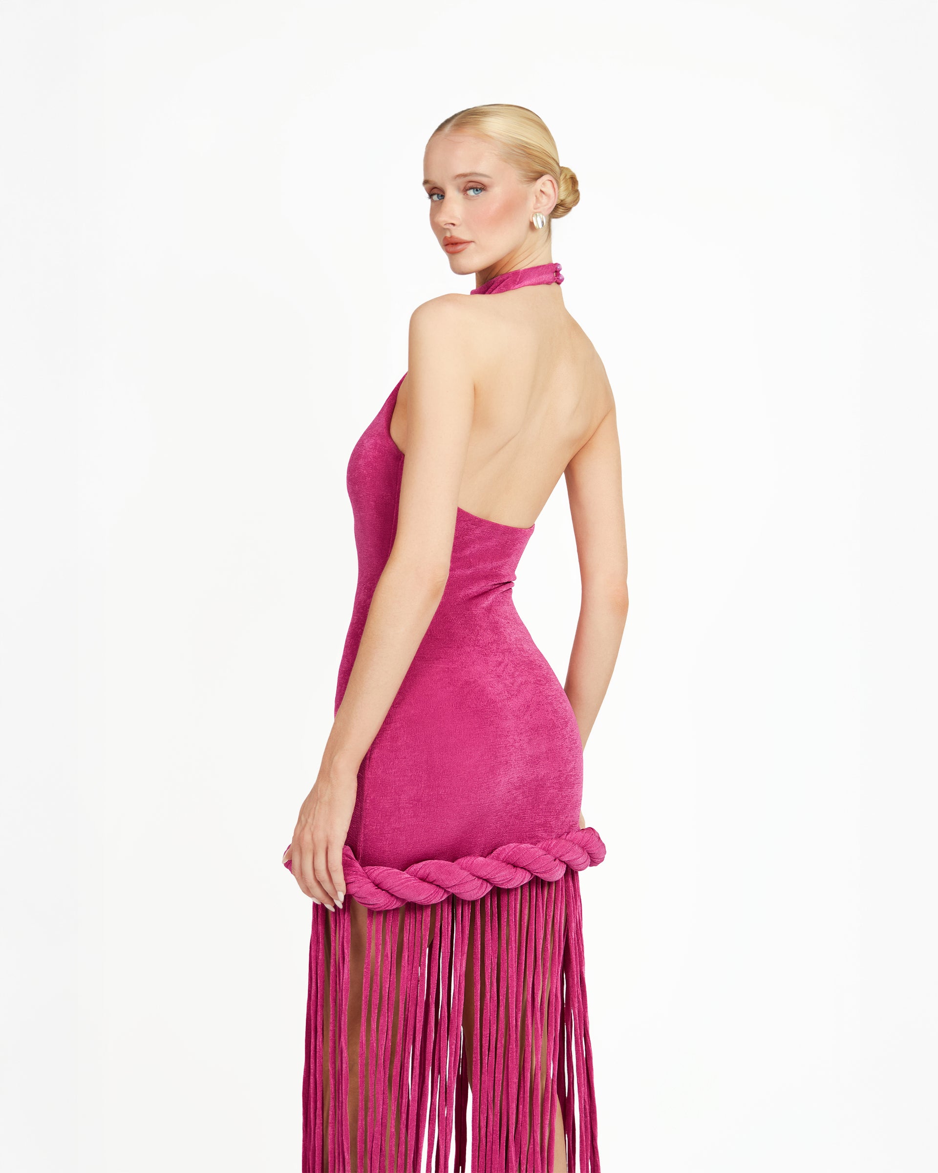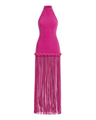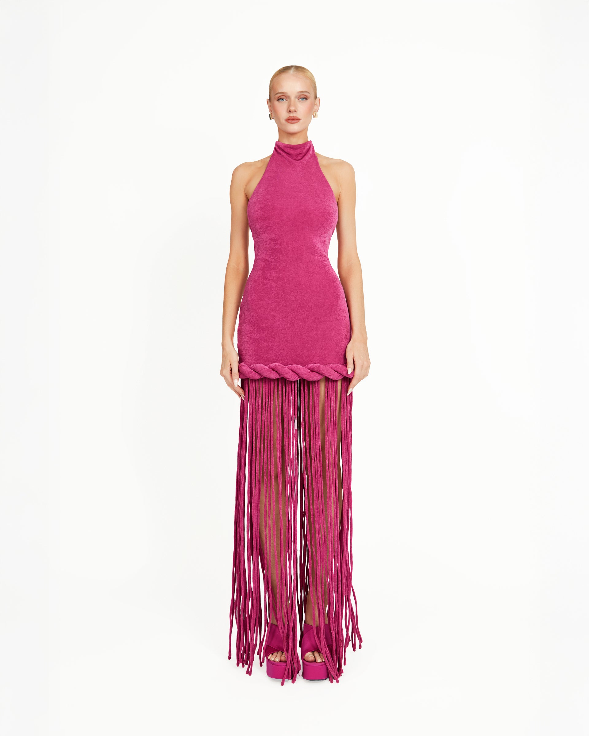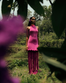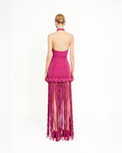 The Kiran Dress channels heritage with a bold, modern edge. Crafted from slinky textured jersey it features a high halter neck, open back, and floor-length fringe that flows with every step, complemented by rope detailing. The Kiran offers a sculpted yet comfortable fit that hugs the body in all the right places. Designed to move with ease and elegance, it’s a piece that turns heads from every angle. Ideal for evening events or special celebrations, the Kiran Dress is the embodiment of bold sophistication.