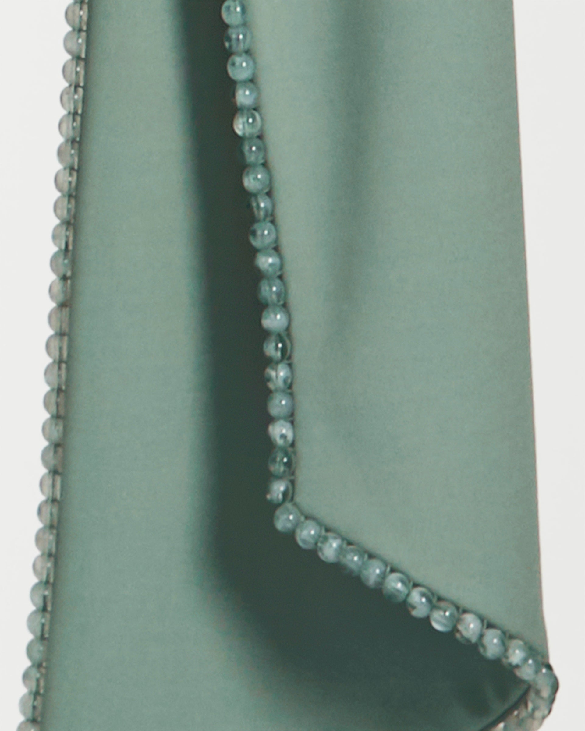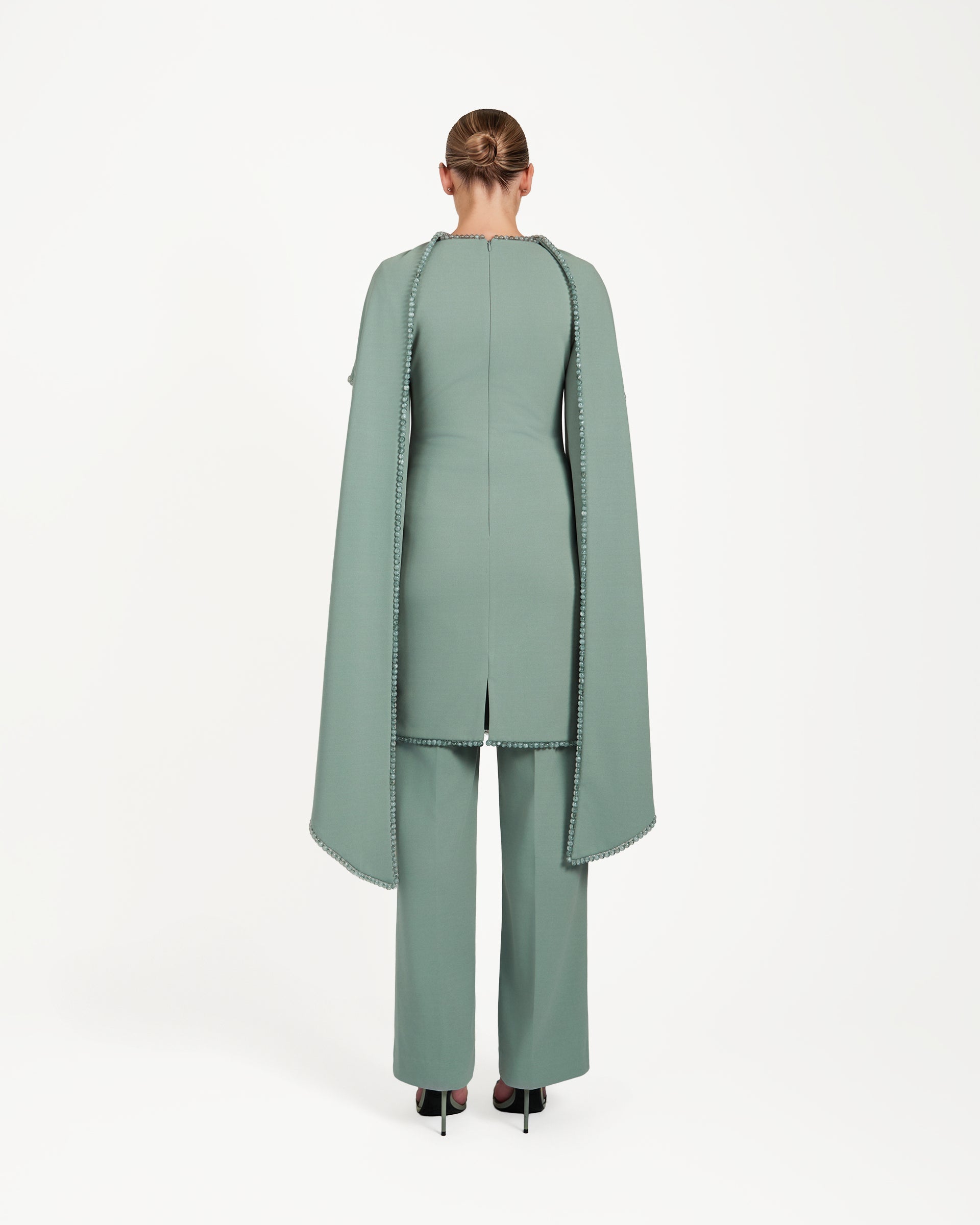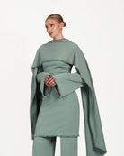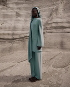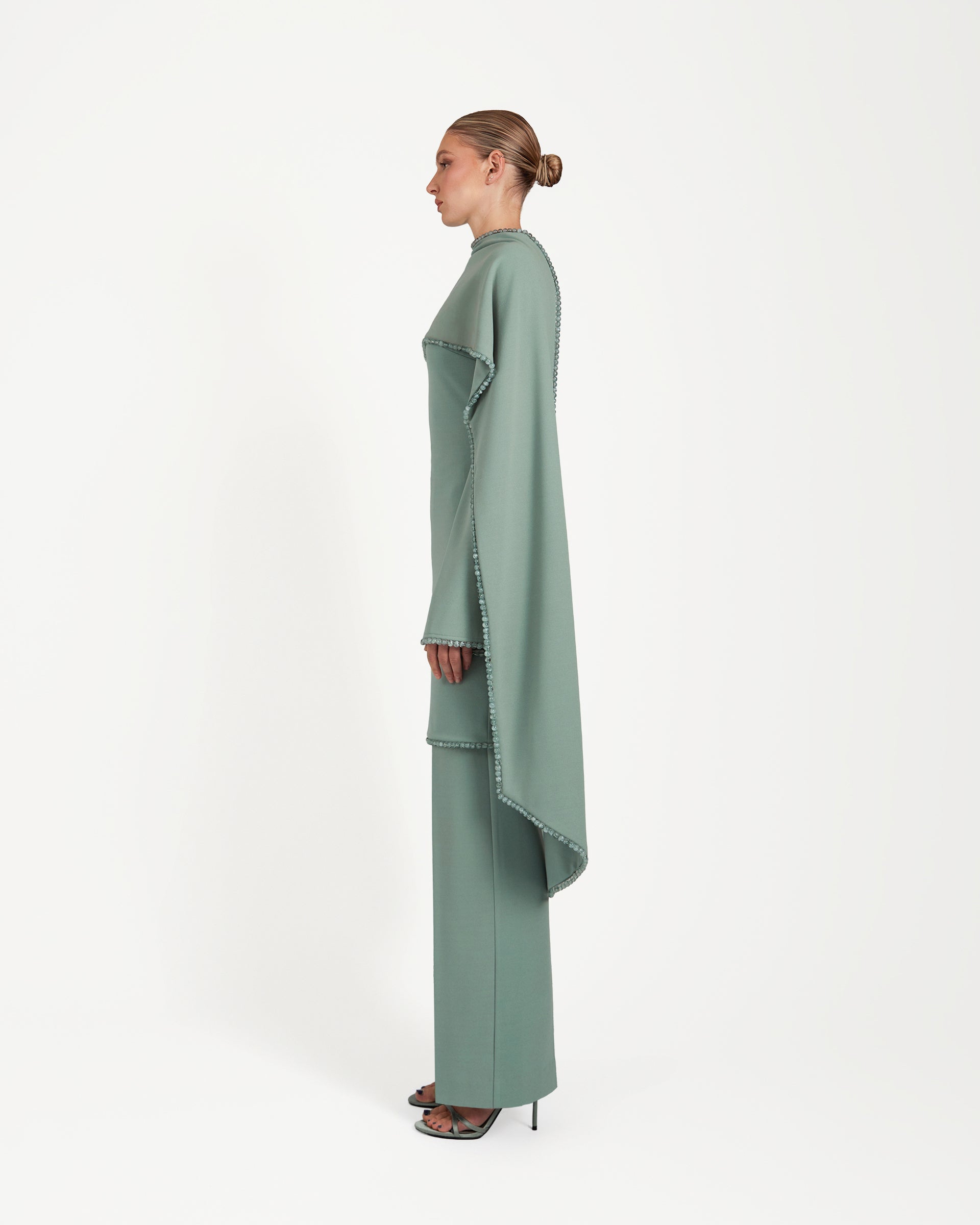 The Kahlaa Top is a jade green modest co-ord top designed for sophisticated, full-coverage occasion dressing. With a long, flowing silhouette and detachable beaded scarf, it pairs seamlessly with matching Kahlaa Trousers to create a polished modest co-ord set perfect for formal dinners and elegant evening events.