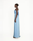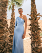 The Kodil dress in powder blue is crafted from a luxurious satin fabric that drapes beautifully, offering a sleek and polished look. Inspired by modern elegance, this one-shoulder design features a satin sash attached to the shoulder seam, adding a touch of sophistication and movement. The dress is tailored fit highlights the feminine silhouette, while the flowy design provides comfort and ease of wear. With its rich blue colour and timeless style, the Kodil dress effortlessly combines chicness and versatility, making it an essential piece for any special occasion.