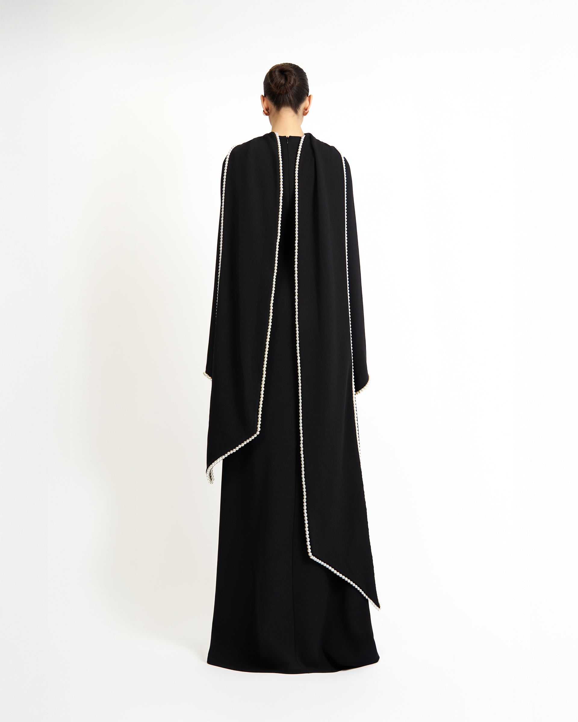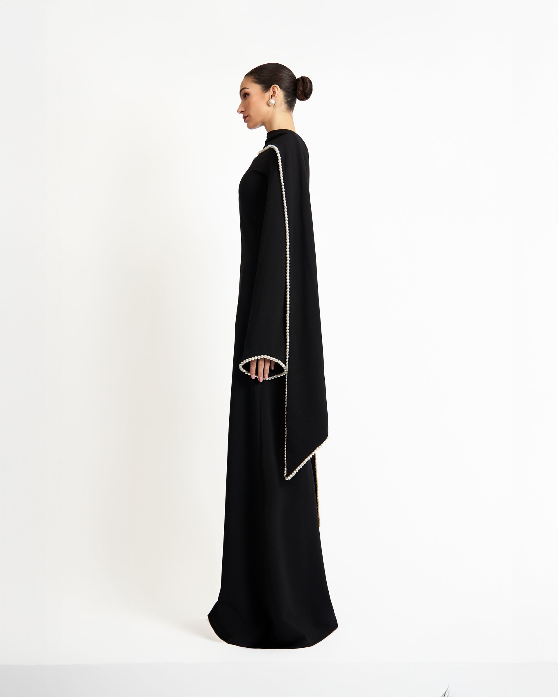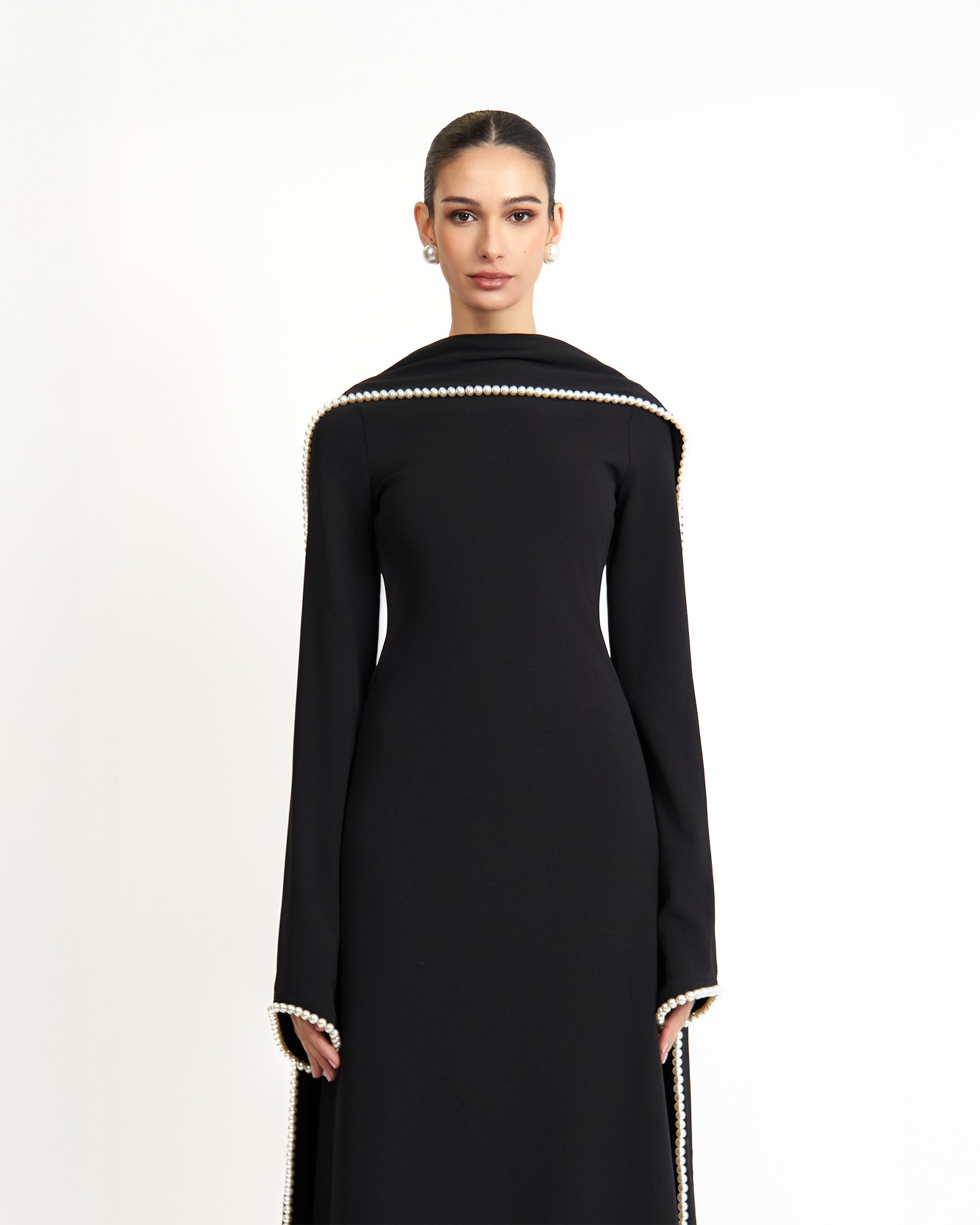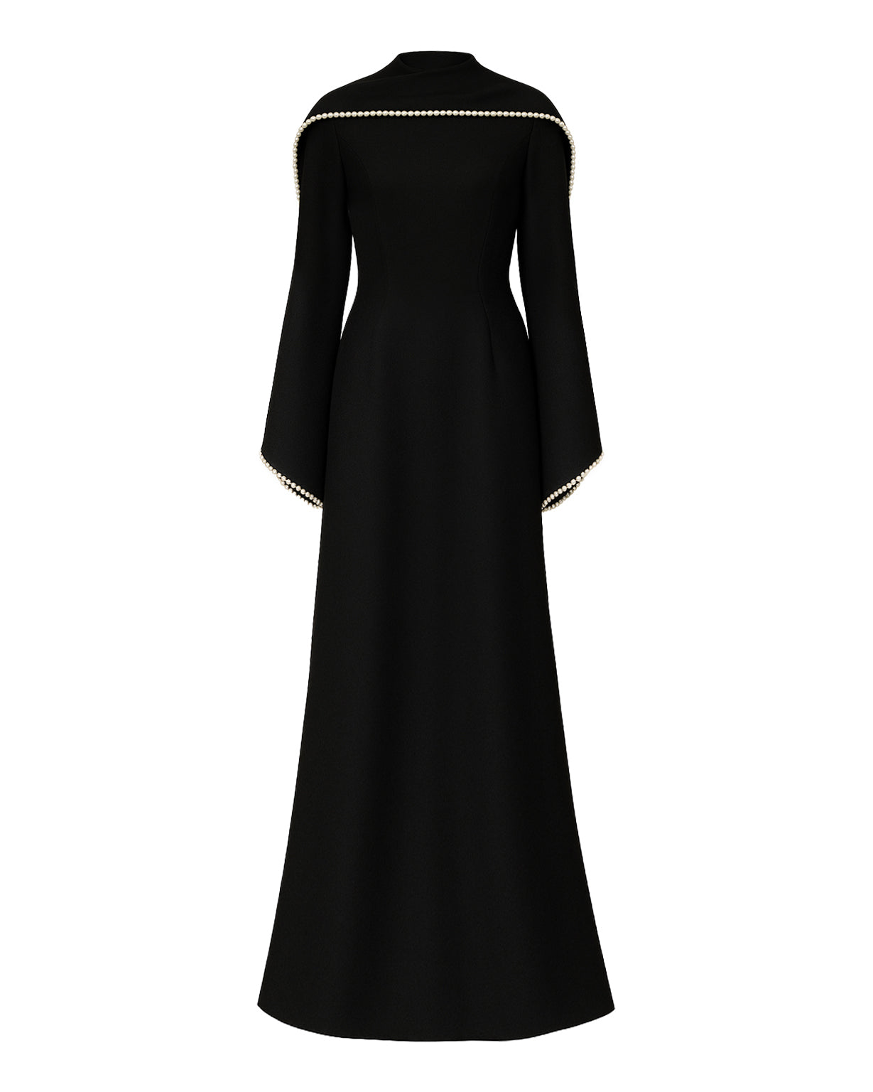 The Krace dress is the epitome of timeless elegance and refined beauty. Crafted from crepe scuba, it features slightly flared sleeves and an A-line silhouette that skims the figure perfectly. The attached scarf is finished with a delicate pearl trim, imparting a touch of exquisite luxury. Pair with heels to allow the floor-length hem to sweep with poise and grace.