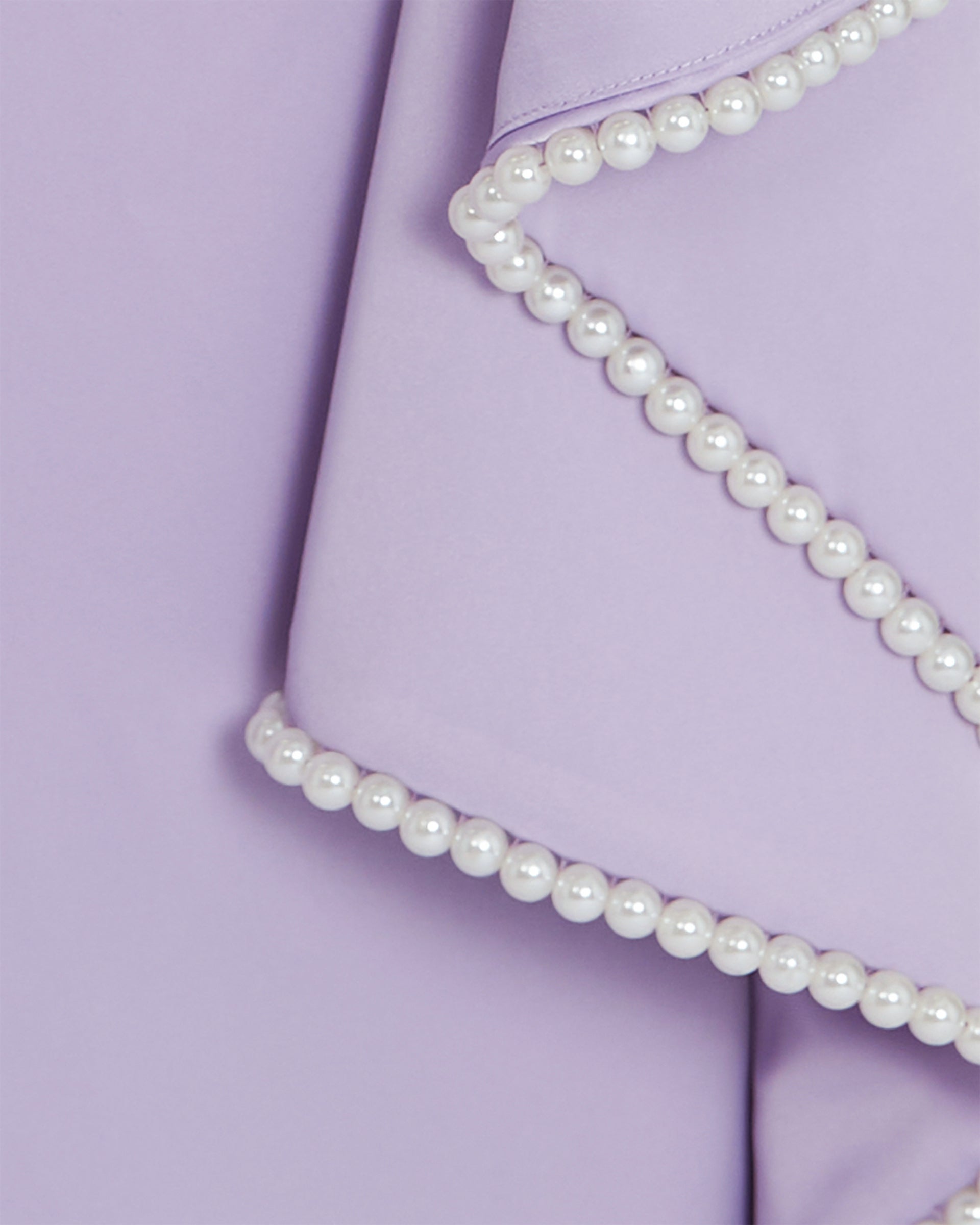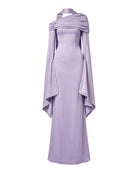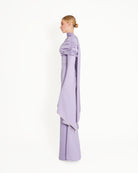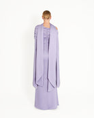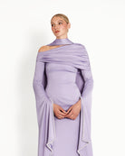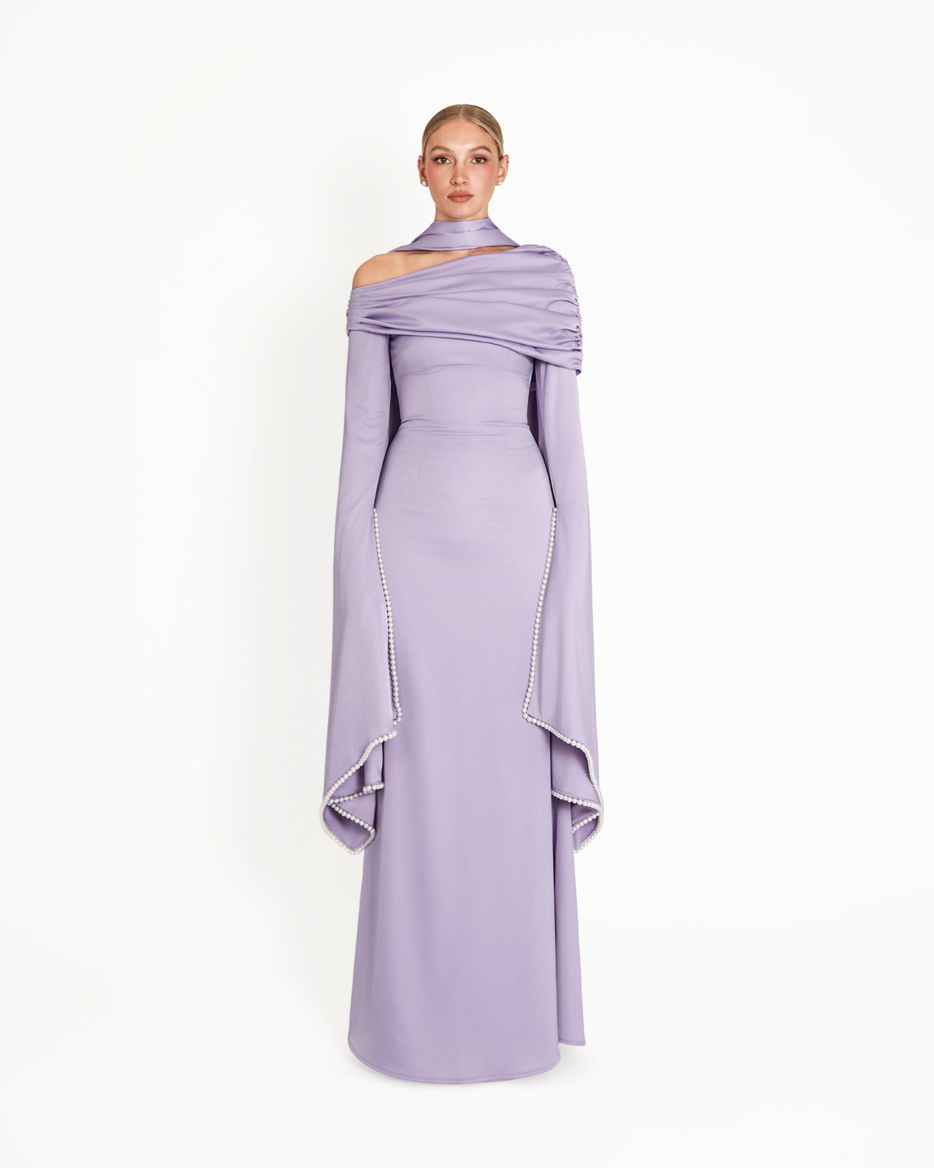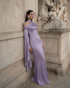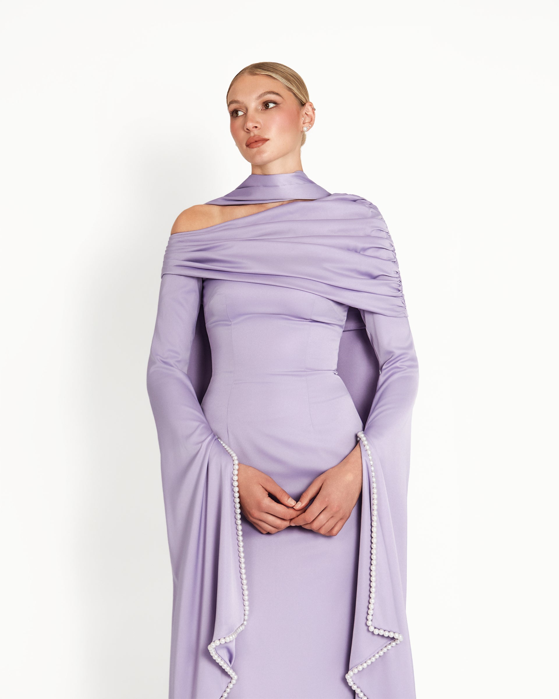 The Kyra Dress in lilac is a satin A-line dress with a gathered Bardot neckline and hand-stitched pearl-trimmed sleeves. Its flattering silhouette moves beautifully, making it ideal for weddings, evening events, cocktail parties, and elegant daytime celebrations.