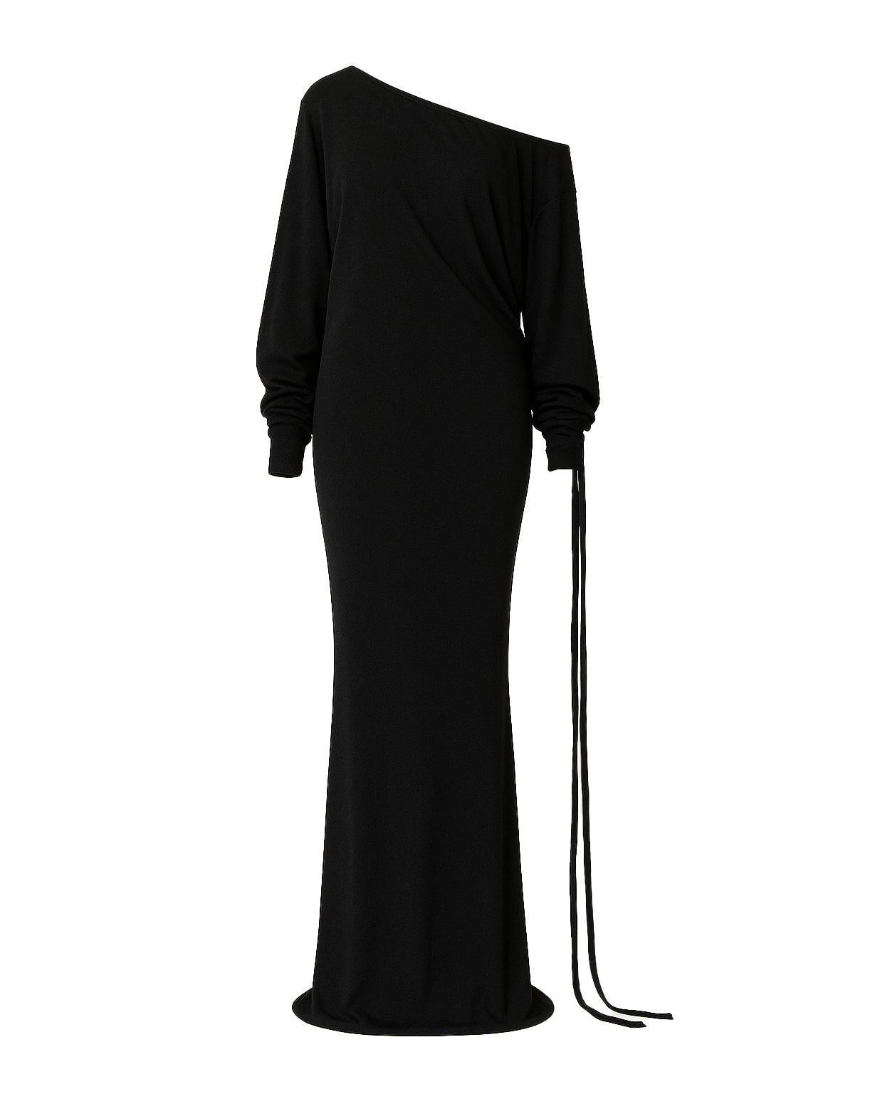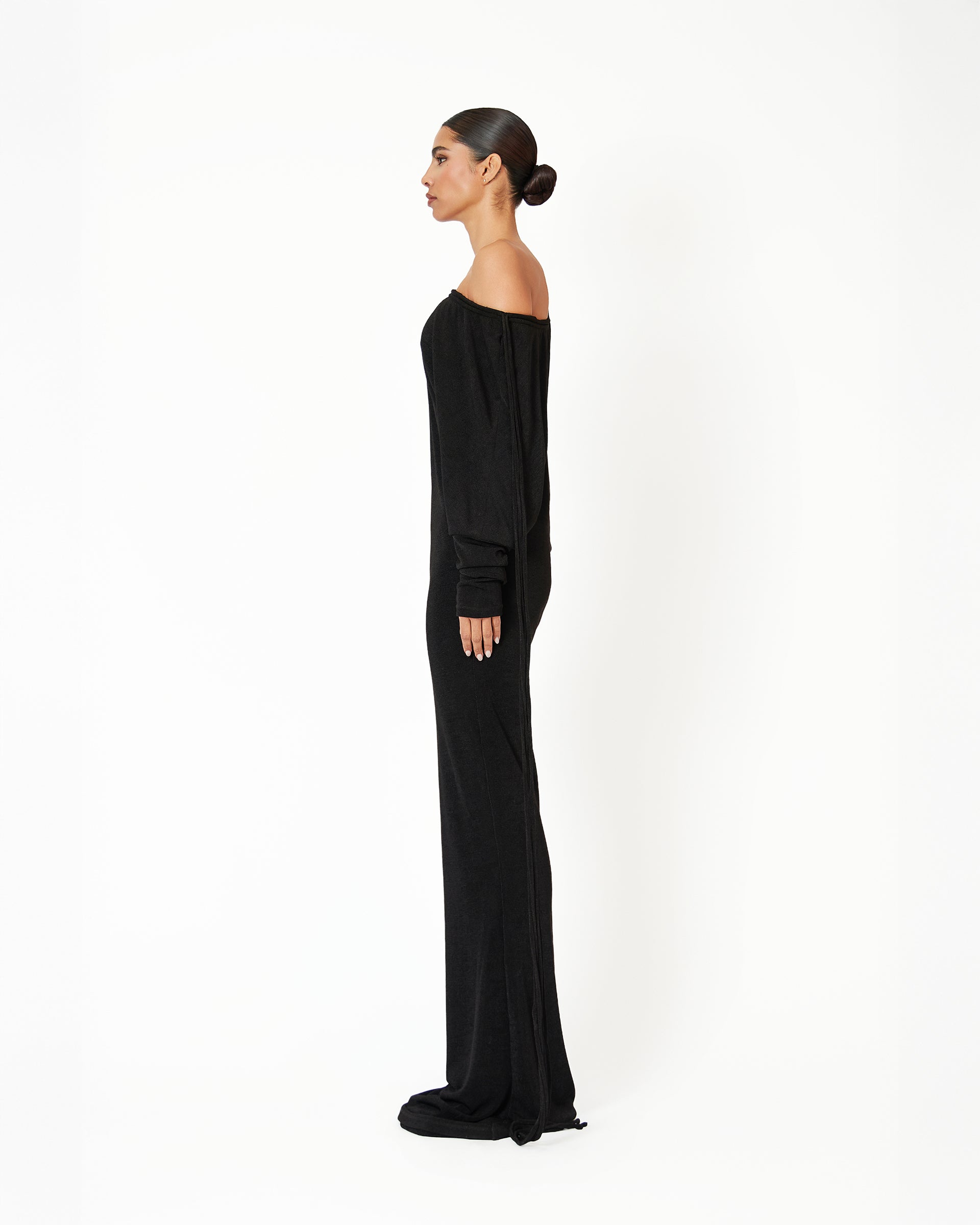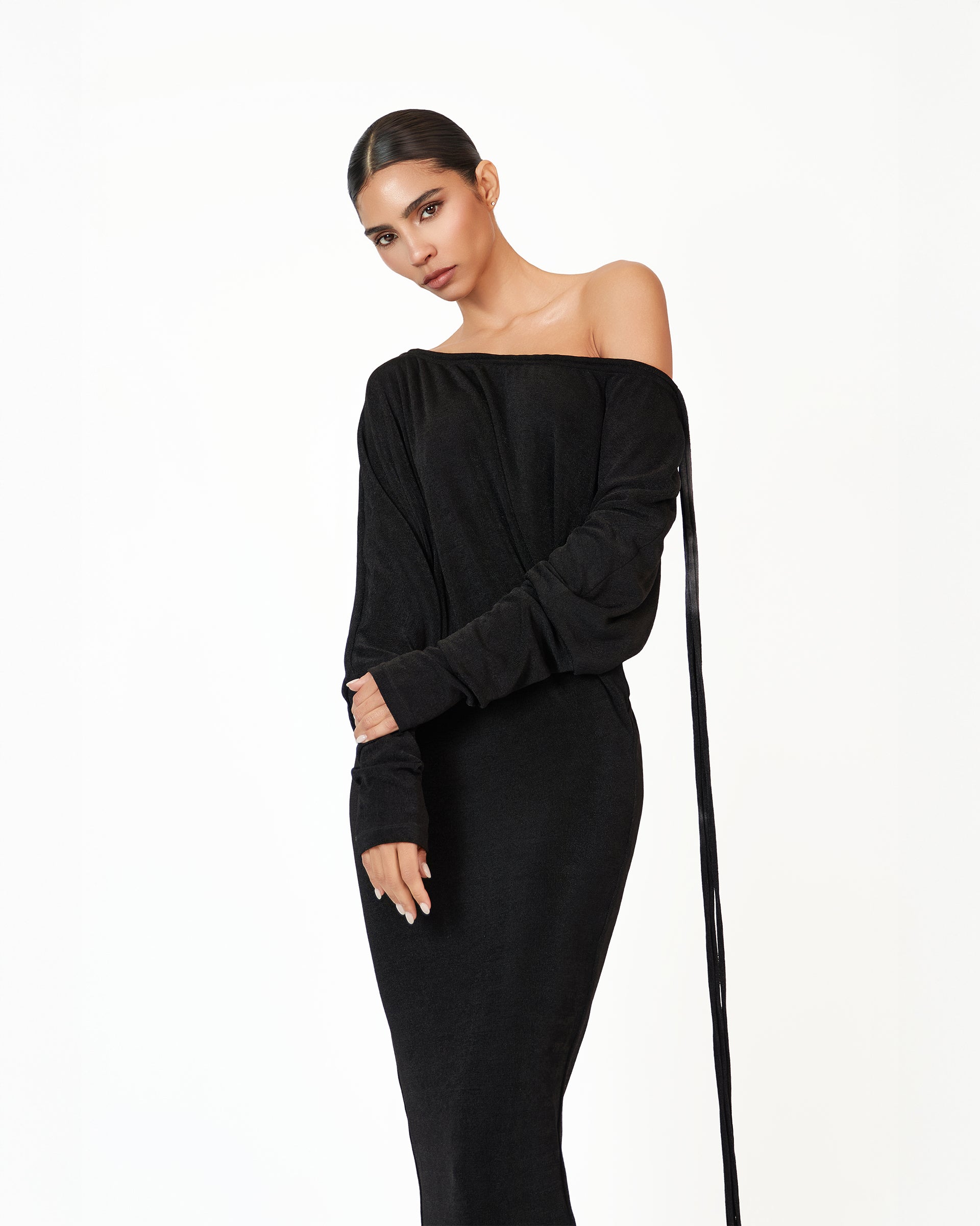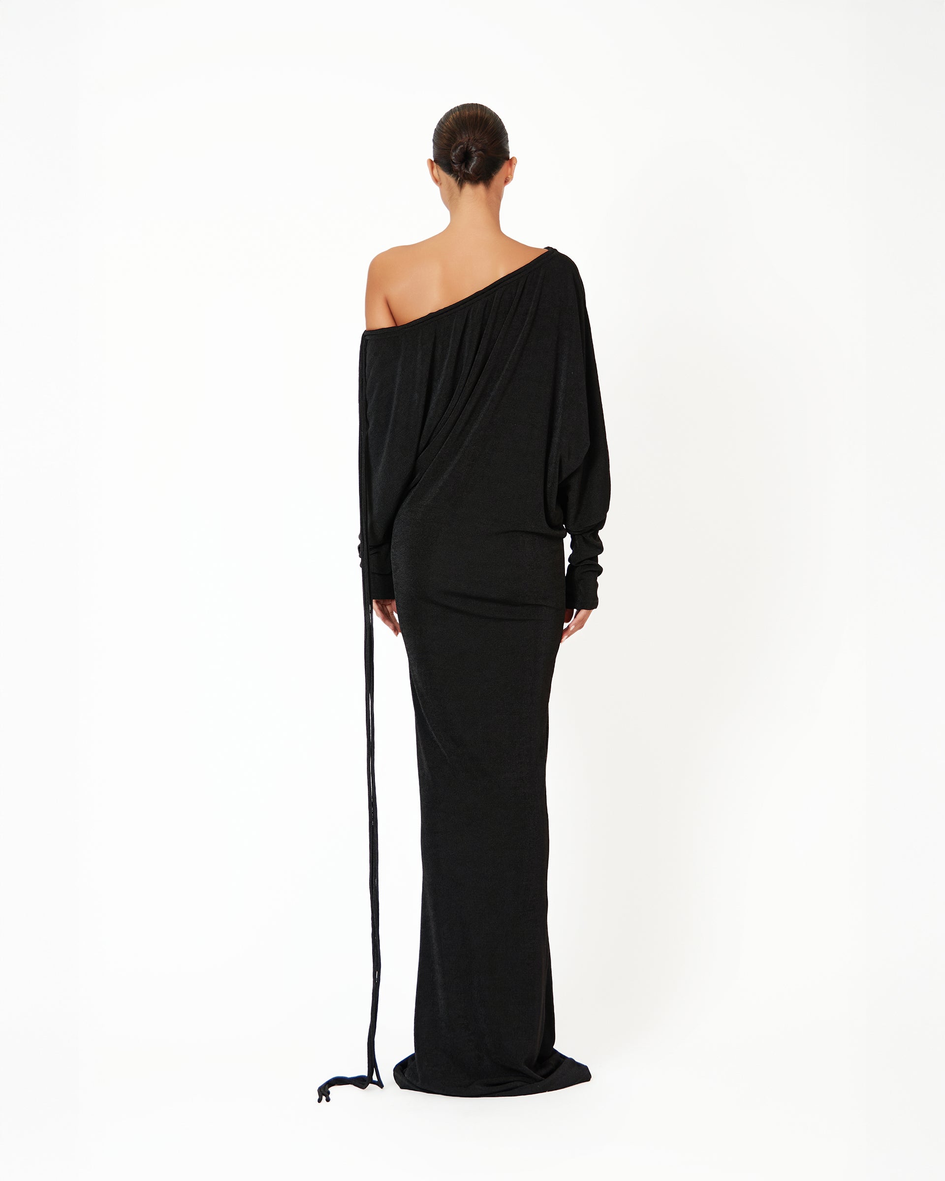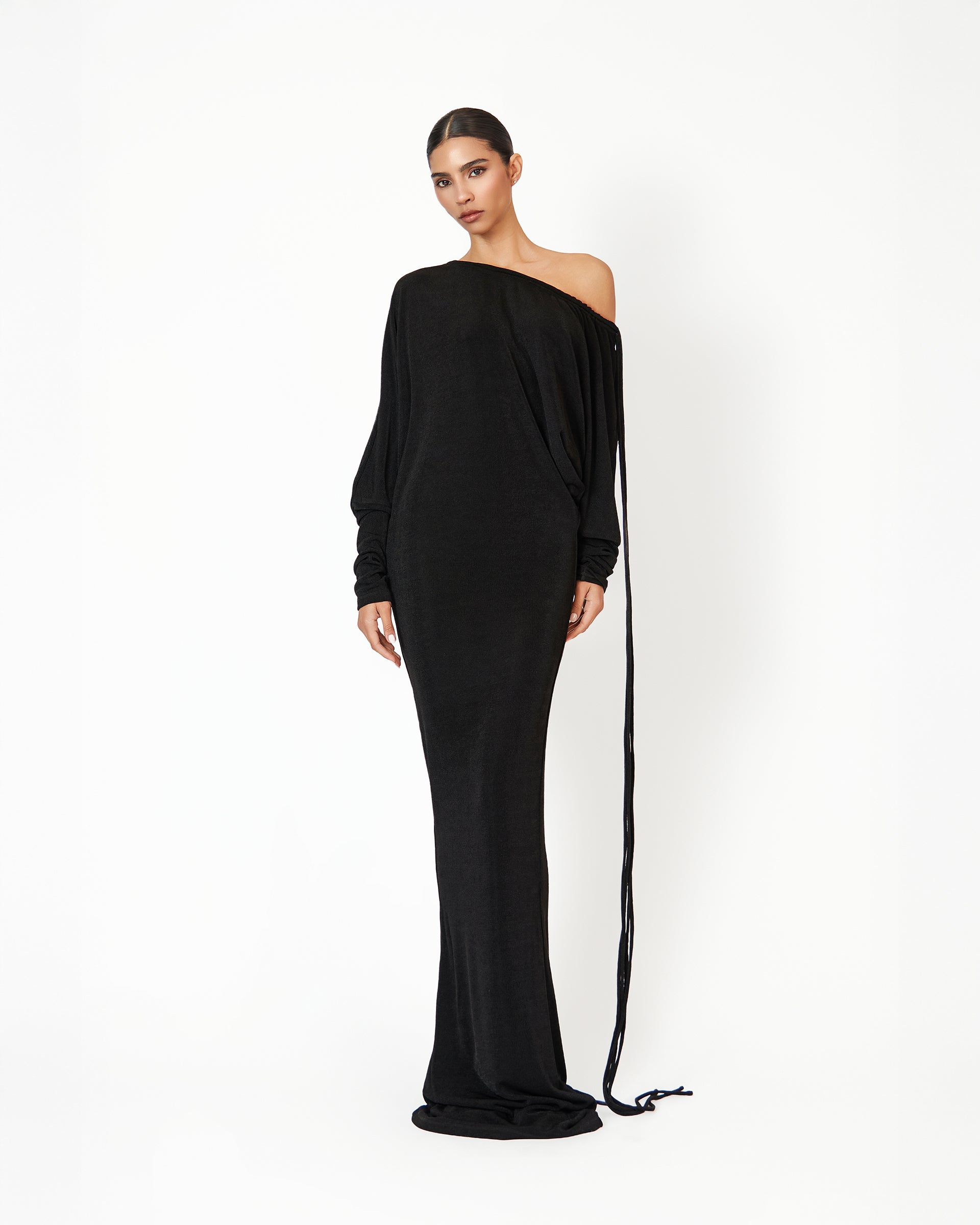 The Kestelle dress in black is a flawless blend of elegance and modern sophistication. Designed with an off-the-shoulder neckline and adjustable string tassels, it brings a refined yet contemporary edge to your wardrobe. The fitted mermaid silhouette beautifully sculpts the body, flaring out at the hem for an effortlessly graceful finish. Complete the look with our luxurious gold bangles and strappy heels, adding an elevated touch of glamour. Perfect for any special occasion, the Kestelle dress exudes timeless luxury with a modern, understated allure.
