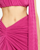 The Kalika Co-ord redefines luxury for the modern muse. Designed for the woman who commands attention without saying a word, this two-piece set is crafted from our signature slinky textured jersey. The top is artfully ruched throughout and the skirt mirrors this intention, detailed with delicate ruching and a floor-grazing sash. The sash is designed to be styled multiple ways, wrapped, draped, or across your neck offering a custom finish with every wear. Kalika is an ode to refined sensuality, style with sculptural earrings, layered bangles, and slip on heels.