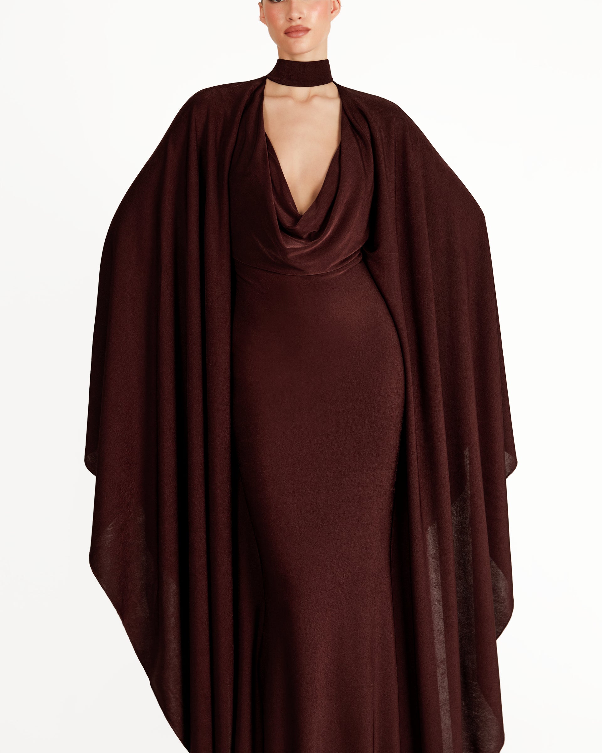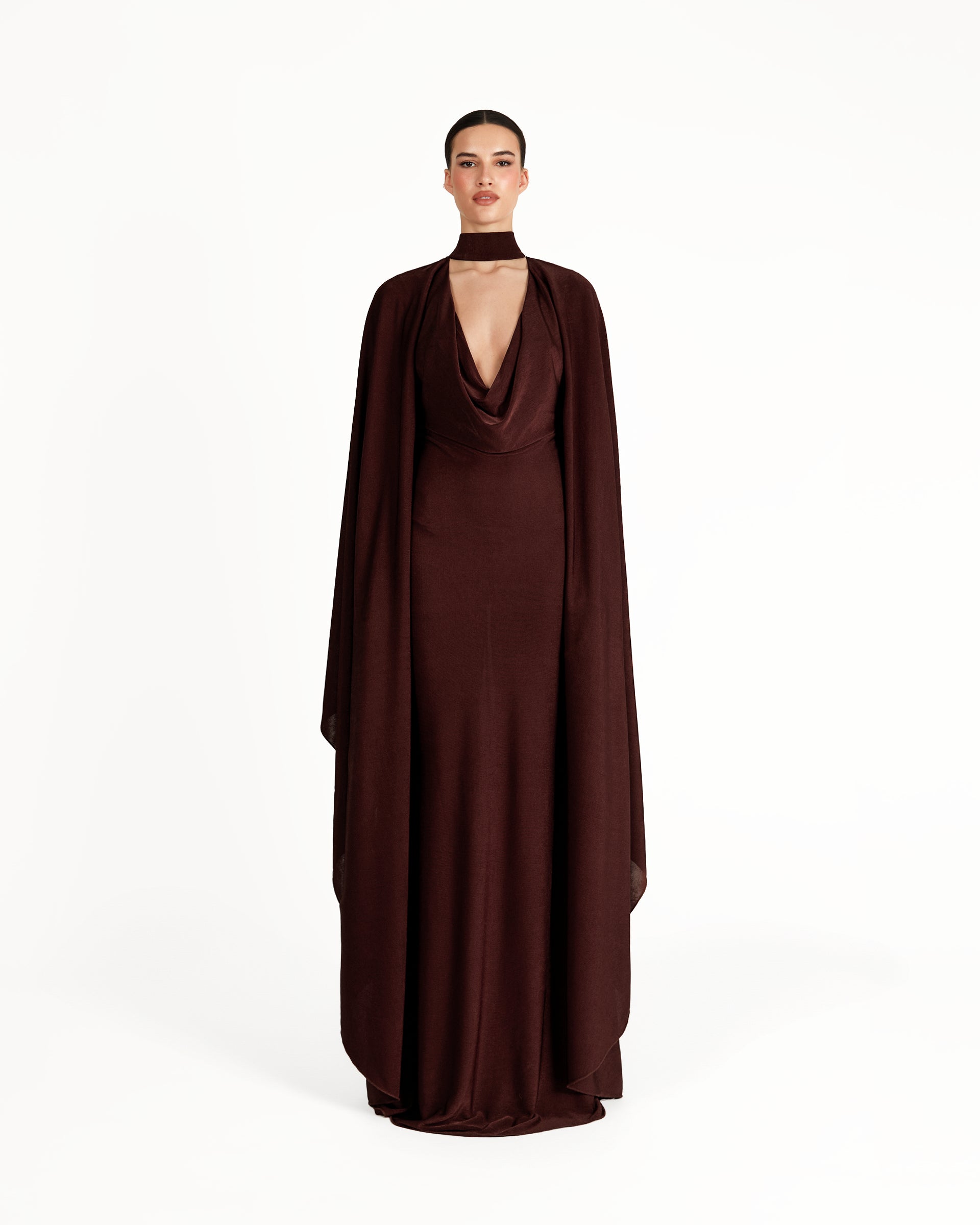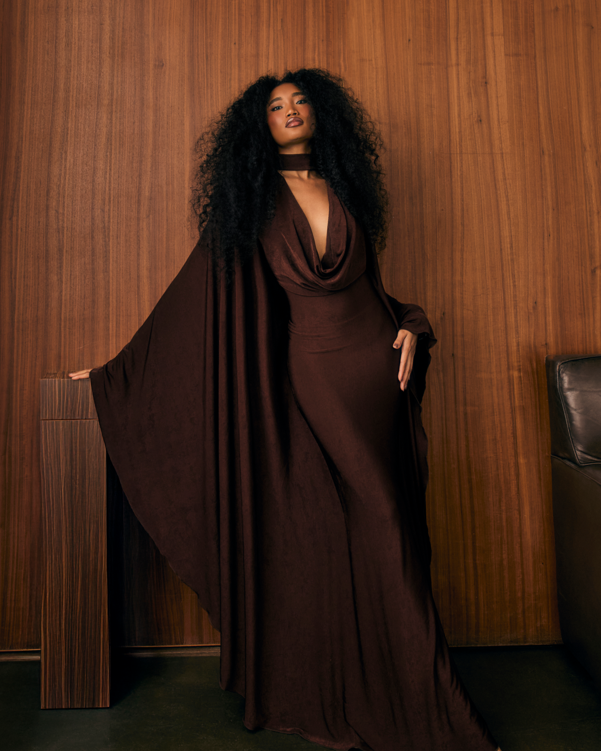 The Klara Dress in brown is a sultry yet sophisticated design, crafted from slinky textured fabric that drapes beautifully over the body. Featuring batwing sleeves for effortless movement and an attached neck scarf detail, this dress exudes modern elegance with a sexy edge. Perfect for evening events or occasions where you want to make a statement, it combines fluidity, style, and confidence in one striking silhouette.