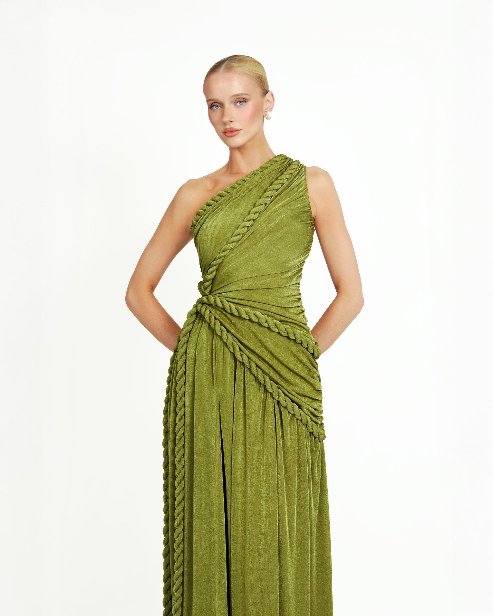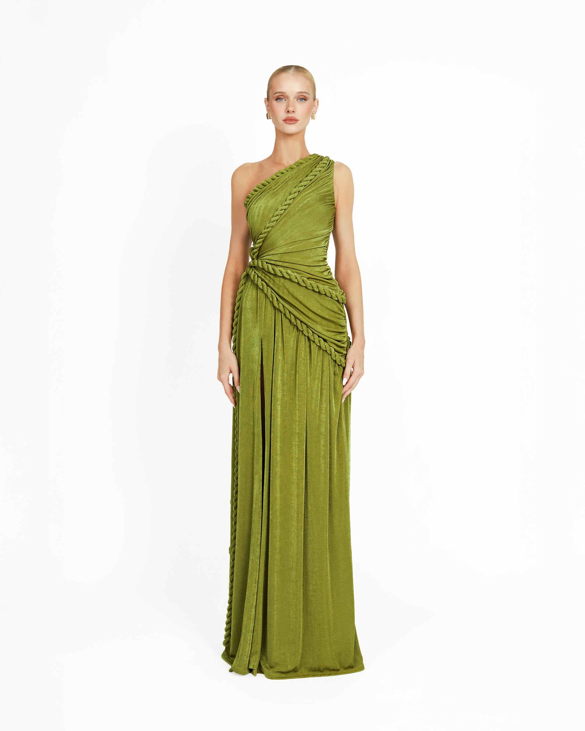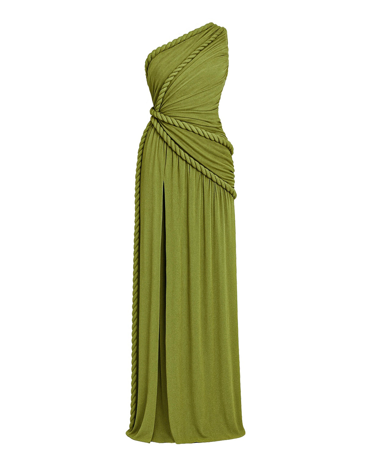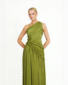 The Kajol Dress is a one of a kind piece that blends sensual structure with artisanal detail. Crafted from stretchy, slinky textured jersey, this dress sculpts the body while allowing effortless movement. The intricate gathering and decorative rope accents are placed throughout the dress, creating a visually striking texture. Each panel is ruched to flatter and contour, while the ropes add an artful touch, giving the piece a sculptural edge inspired by traditional craft techniques. The fitted silhouette hugs the body before cascading into a flowy hem, with a daring side slit that elongates the leg and invites fluidity with every step. Perfect for evenings where you want to stand out, feel powerful, and wear something truly unforgettable.