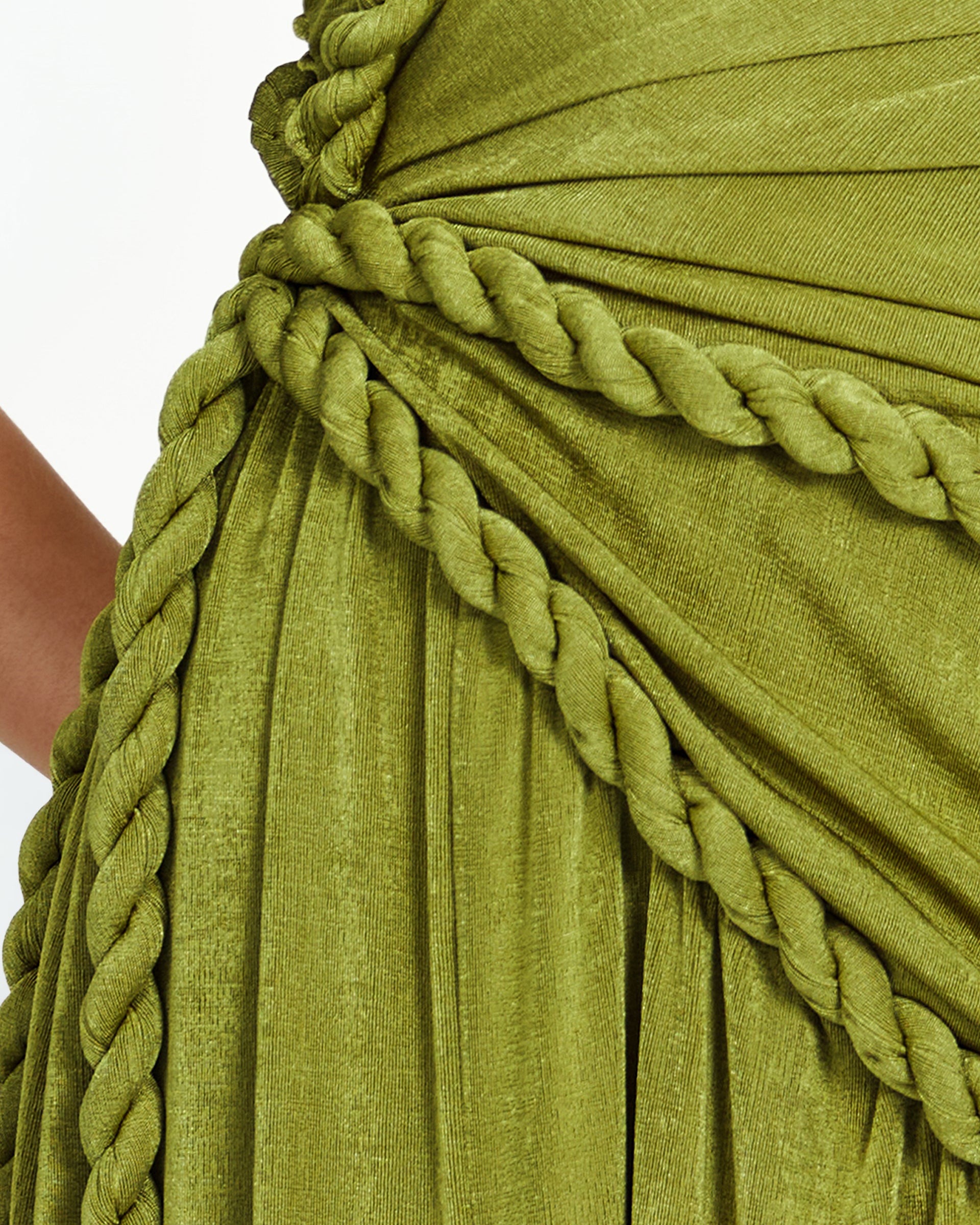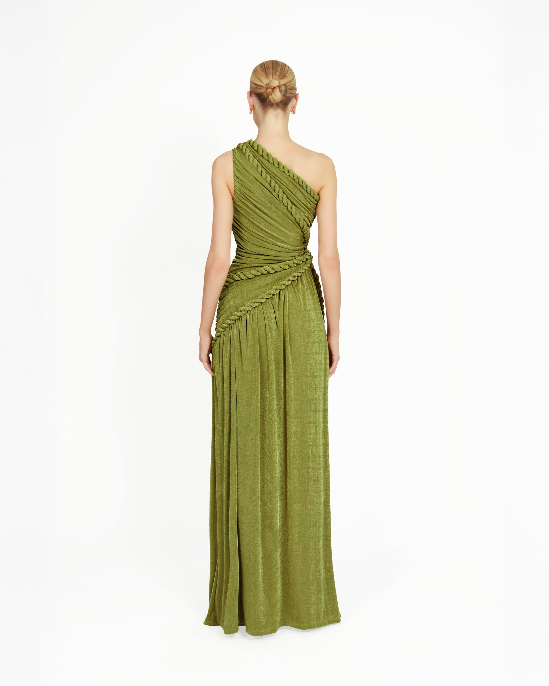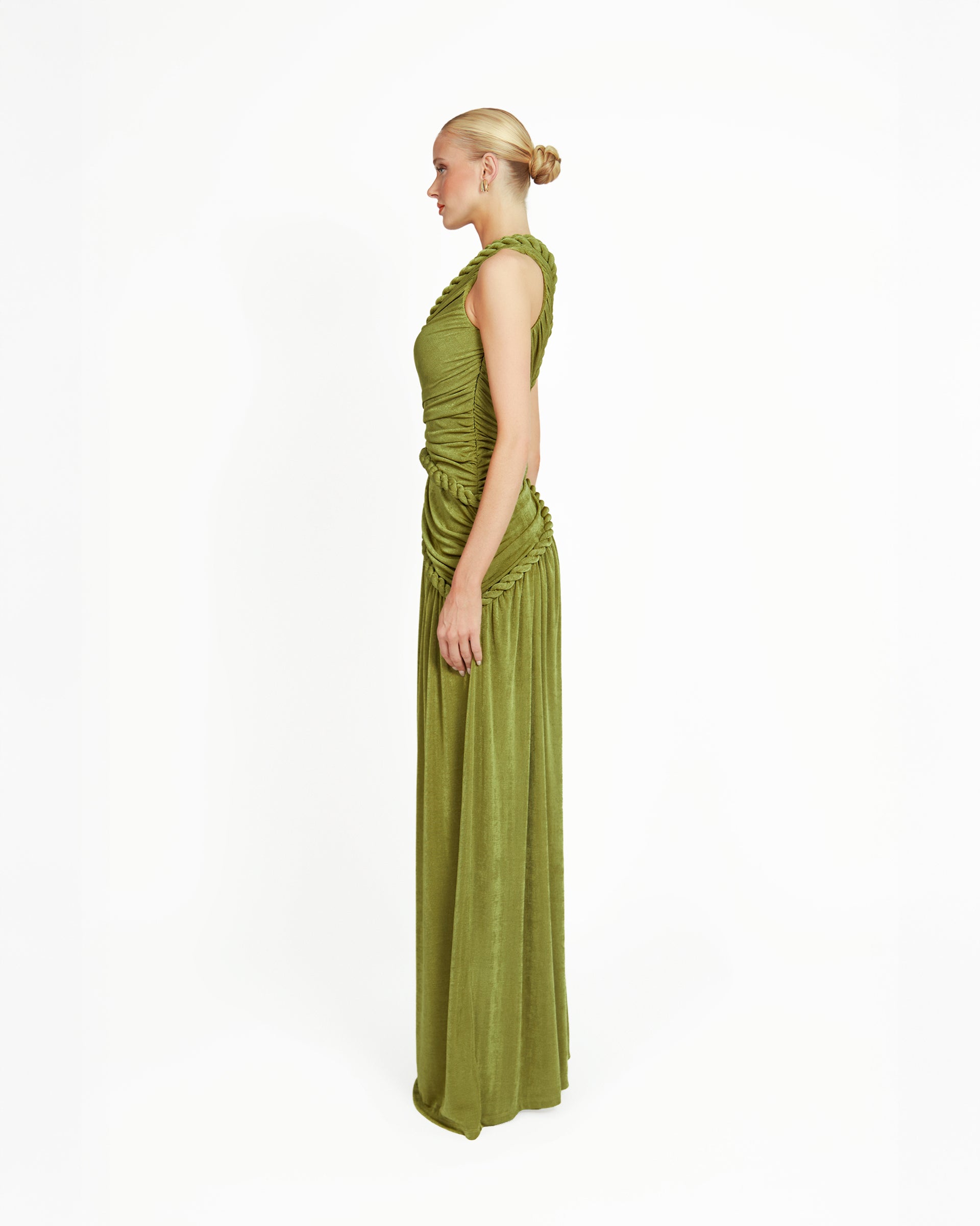 The Kajol Dress is a one of a kind piece that blends sensual structure with artisanal detail. Crafted from stretchy, slinky textured jersey, this dress sculpts the body while allowing effortless movement. The intricate gathering and decorative rope accents are placed throughout the dress, creating a visually striking texture. Each panel is ruched to flatter and contour, while the ropes add an artful touch, giving the piece a sculptural edge inspired by traditional craft techniques. The fitted silhouette hugs the body before cascading into a flowy hem, with a daring side slit that elongates the leg and invites fluidity with every step. Perfect for evenings where you want to stand out, feel powerful, and wear something truly unforgettable.