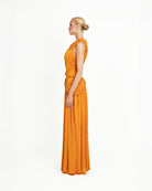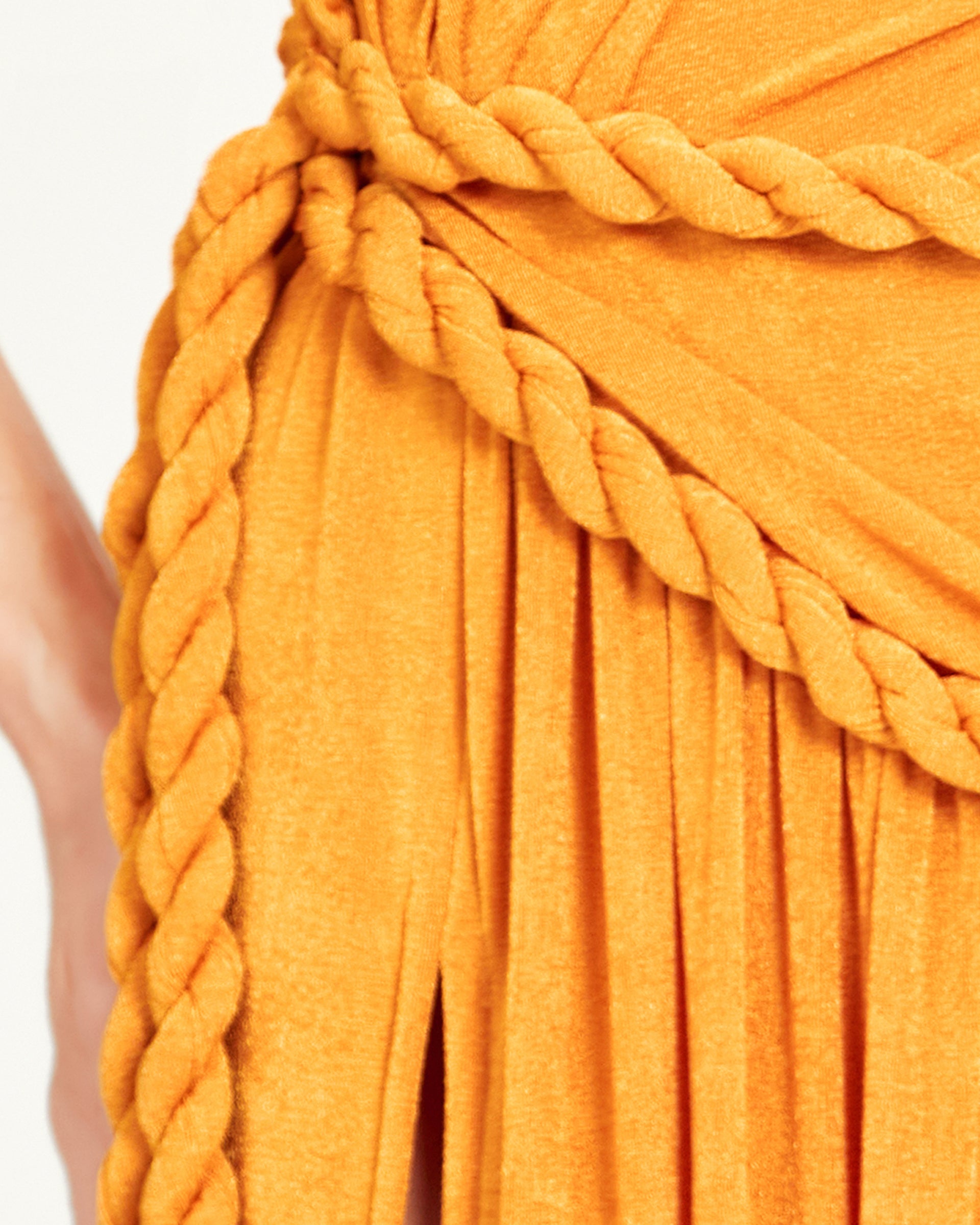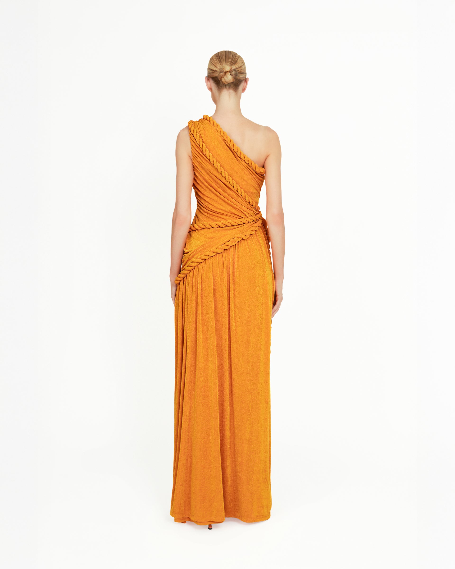 The Kajol Dress is a one of a kind piece that blends sensual structure with artisanal detail. Crafted from stretchy, slinky textured jersey, this dress sculpts the body while allowing effortless movement. The intricate gathering and decorative rope accents are placed throughout the dress, creating a visually striking texture. Each panel is ruched to flatter and contour, while the ropes add an artful touch, giving the piece a sculptural edge inspired by traditional craft techniques. The fitted silhouette hugs the body before cascading into a flowy hem, with a daring side slit that elongates the leg and invites fluidity with every step. Perfect for evenings where you want to stand out, feel powerful, and wear something truly unforgettable.