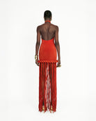 The Kiran Dress channels heritage with a bold, modern edge. Crafted from slinky textured jersey it features a high halter neck, open back, and floor-length fringe that flows with every step, complemented by rope detailing. The Kiran offers a sculpted yet comfortable fit that hugs the body in all the right places. Designed to move with ease and elegance, it’s a piece that turns heads from every angle. Ideal for evening events or special celebrations, the Kiran Dress is the embodiment of bold sophistication.
