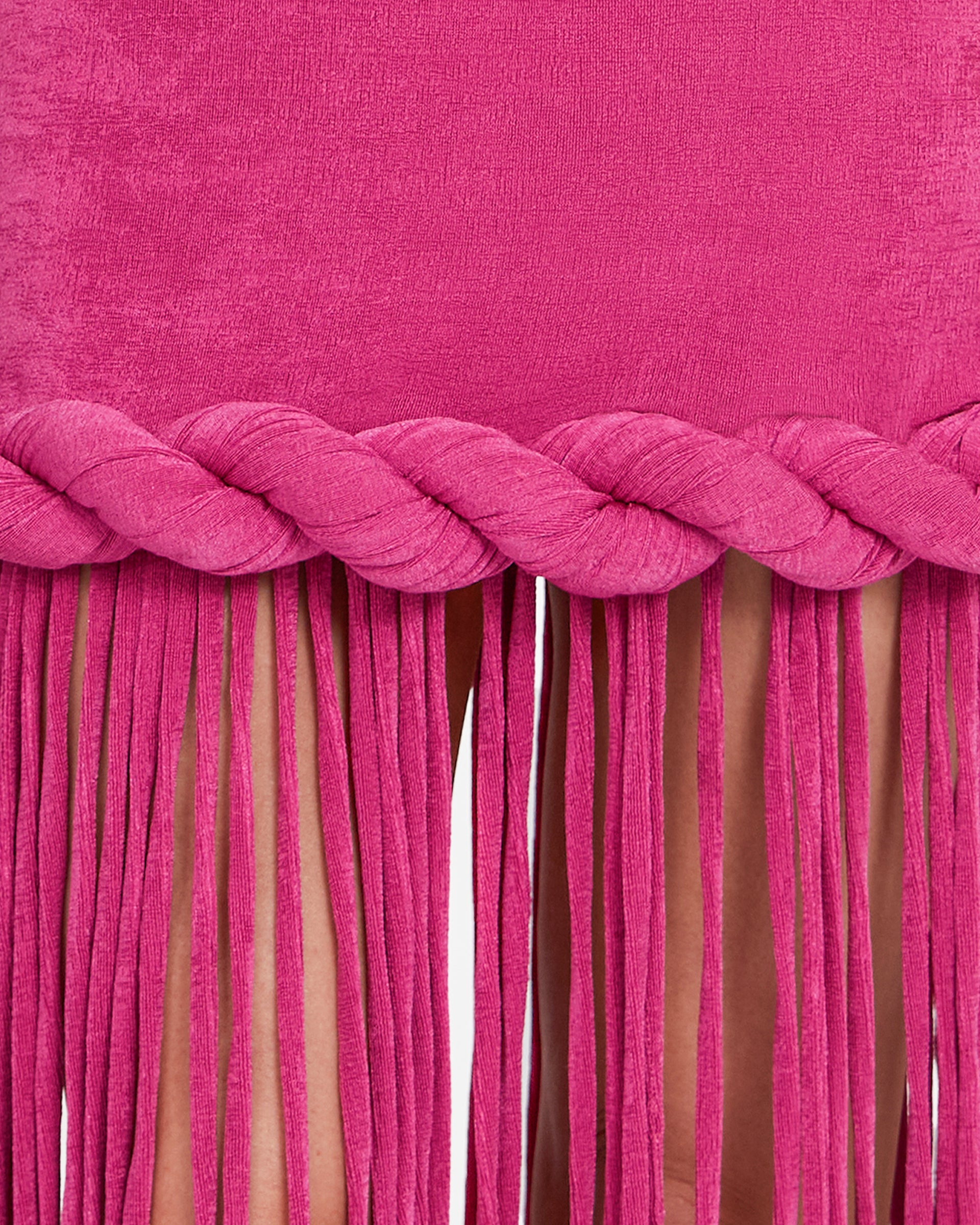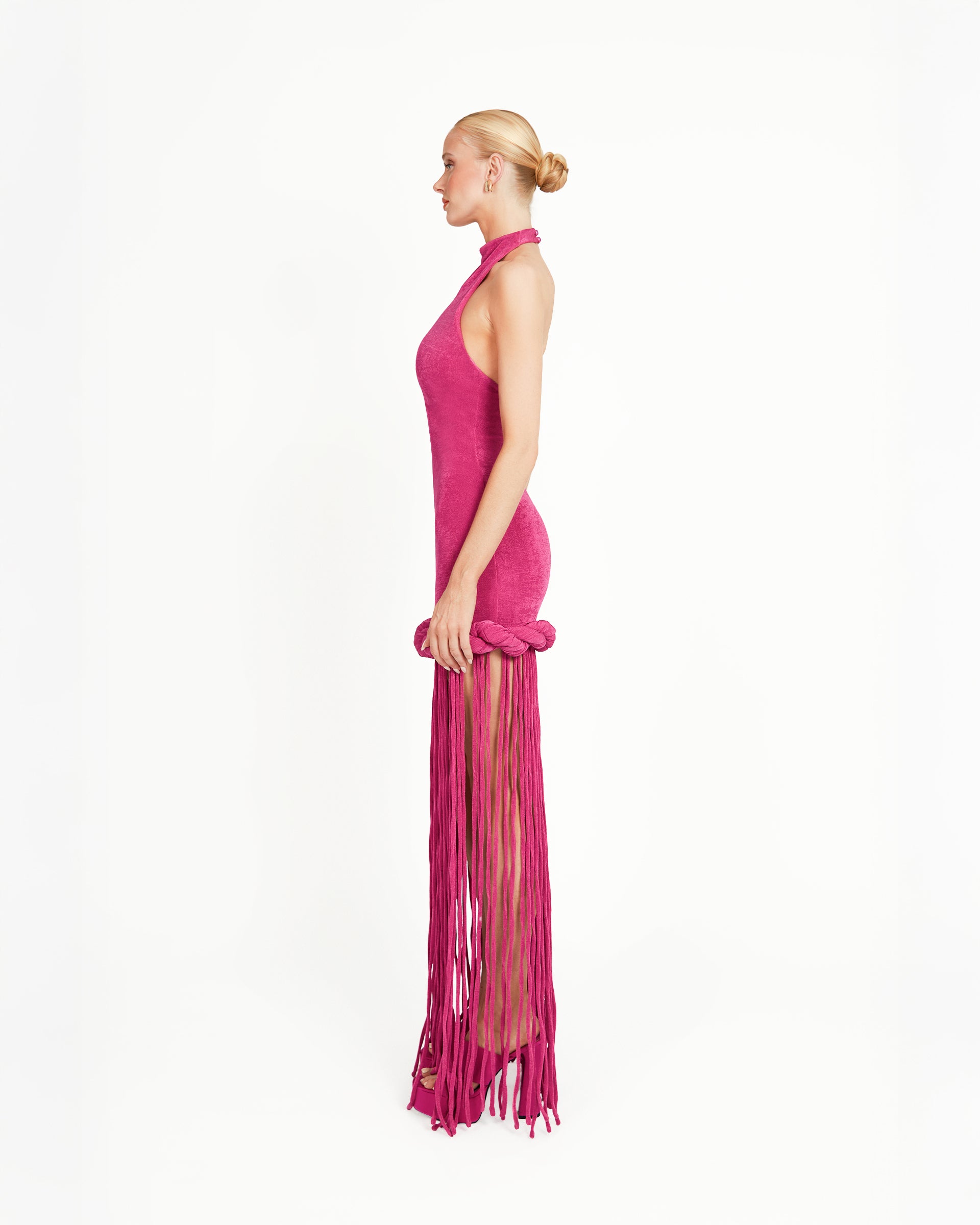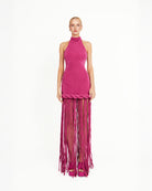 The Kiran Dress channels heritage with a bold, modern edge. Crafted from slinky textured jersey it features a high halter neck, open back, and floor-length fringe that flows with every step, complemented by rope detailing. The Kiran offers a sculpted yet comfortable fit that hugs the body in all the right places. Designed to move with ease and elegance, it’s a piece that turns heads from every angle. Ideal for evening events or special celebrations, the Kiran Dress is the embodiment of bold sophistication.