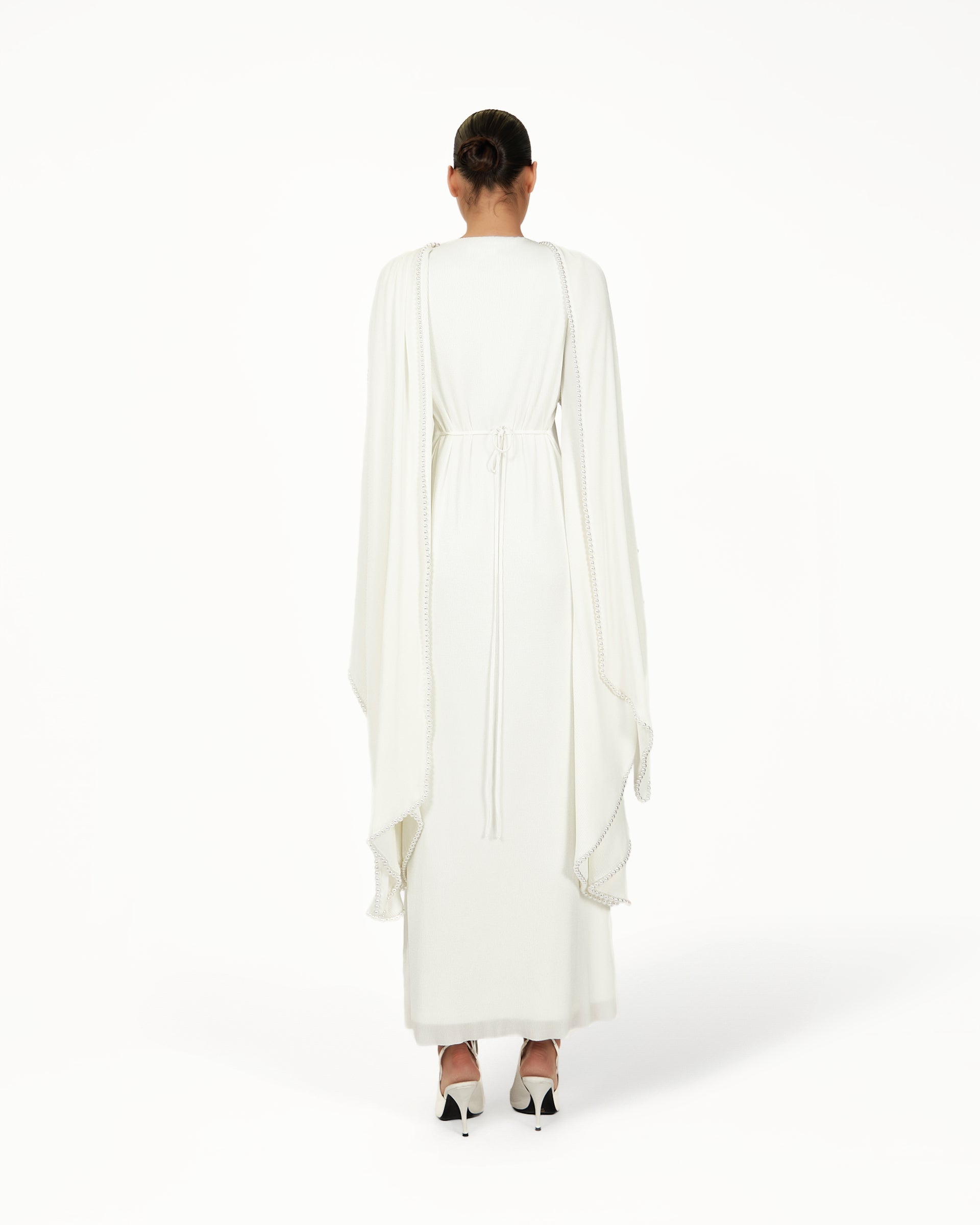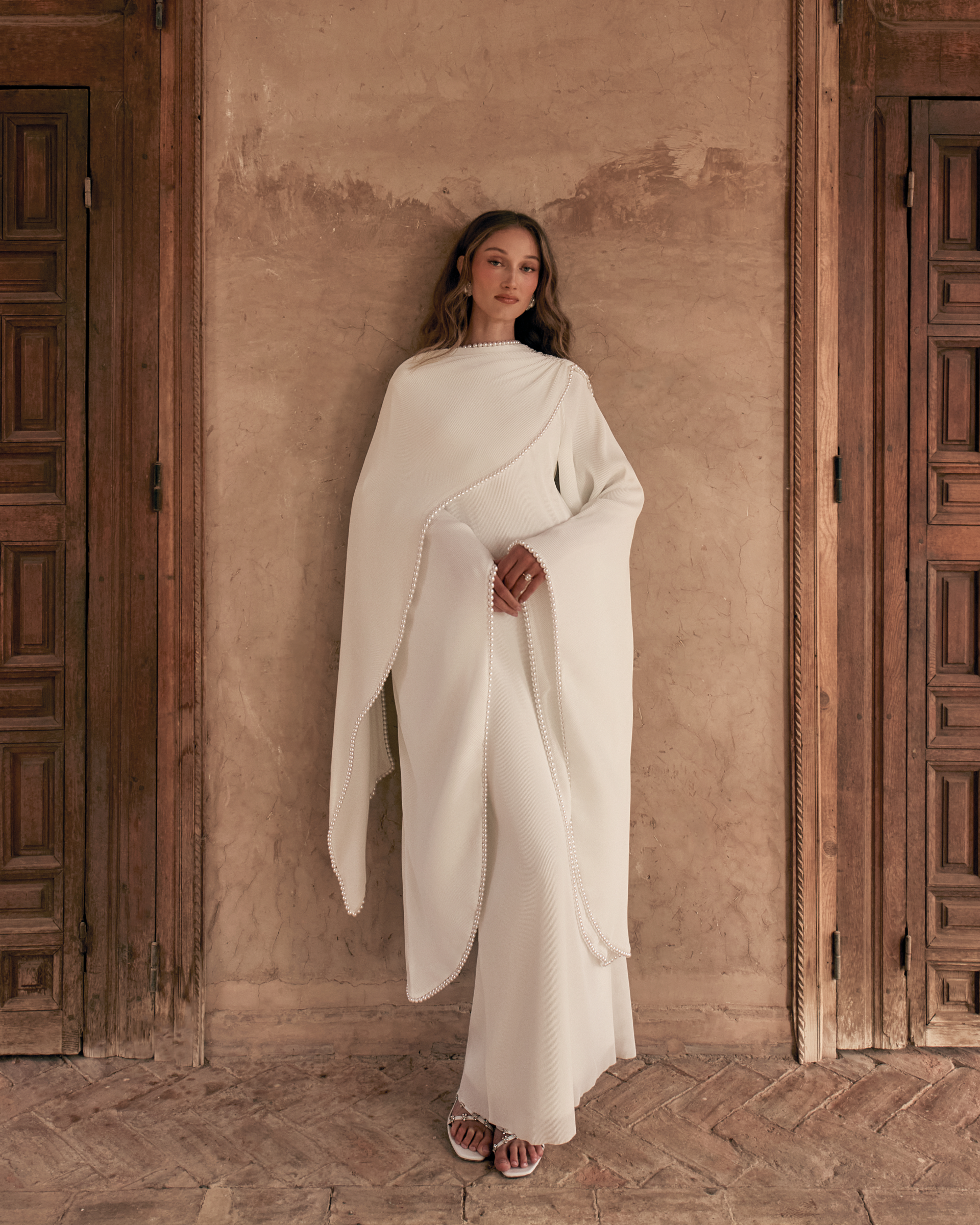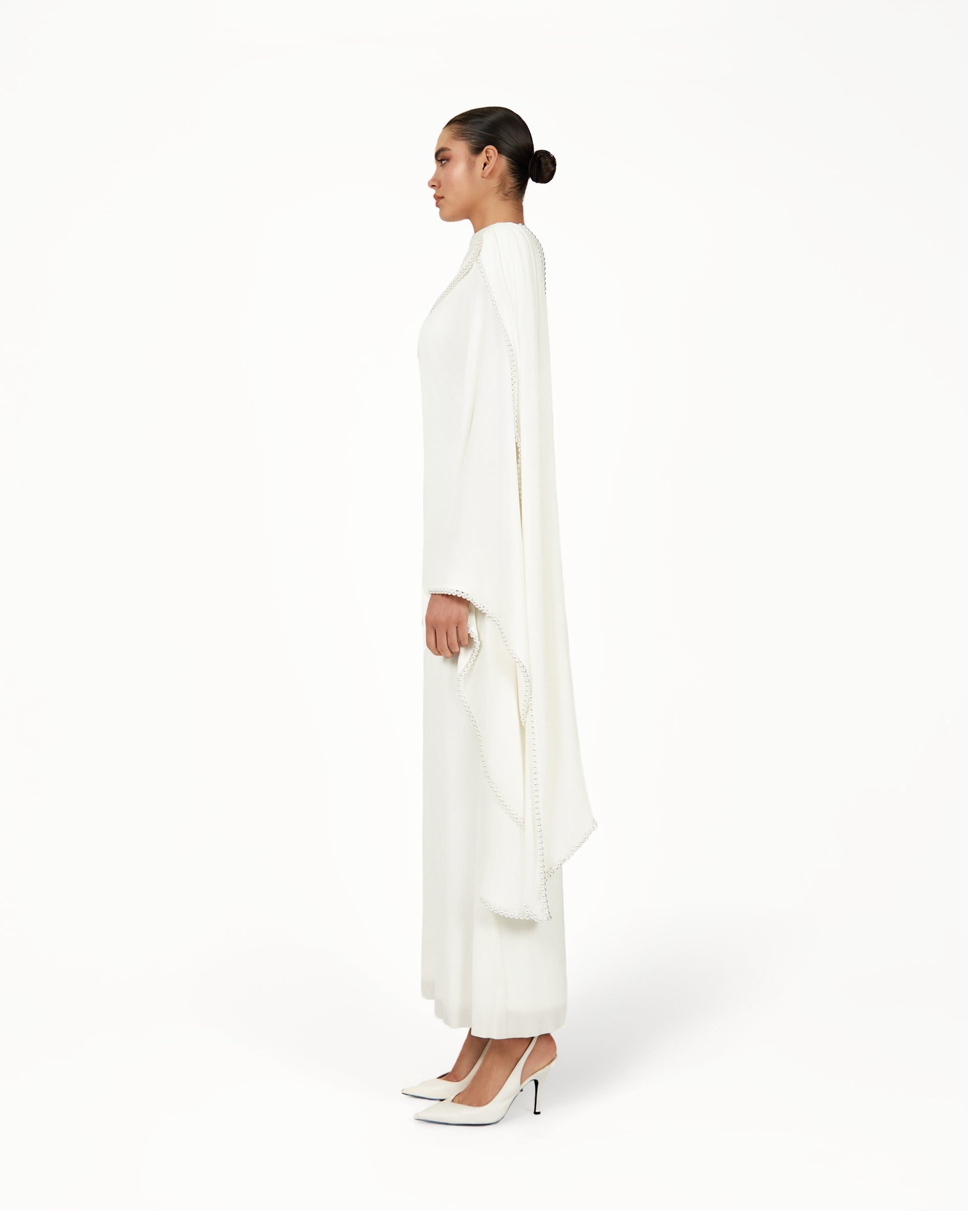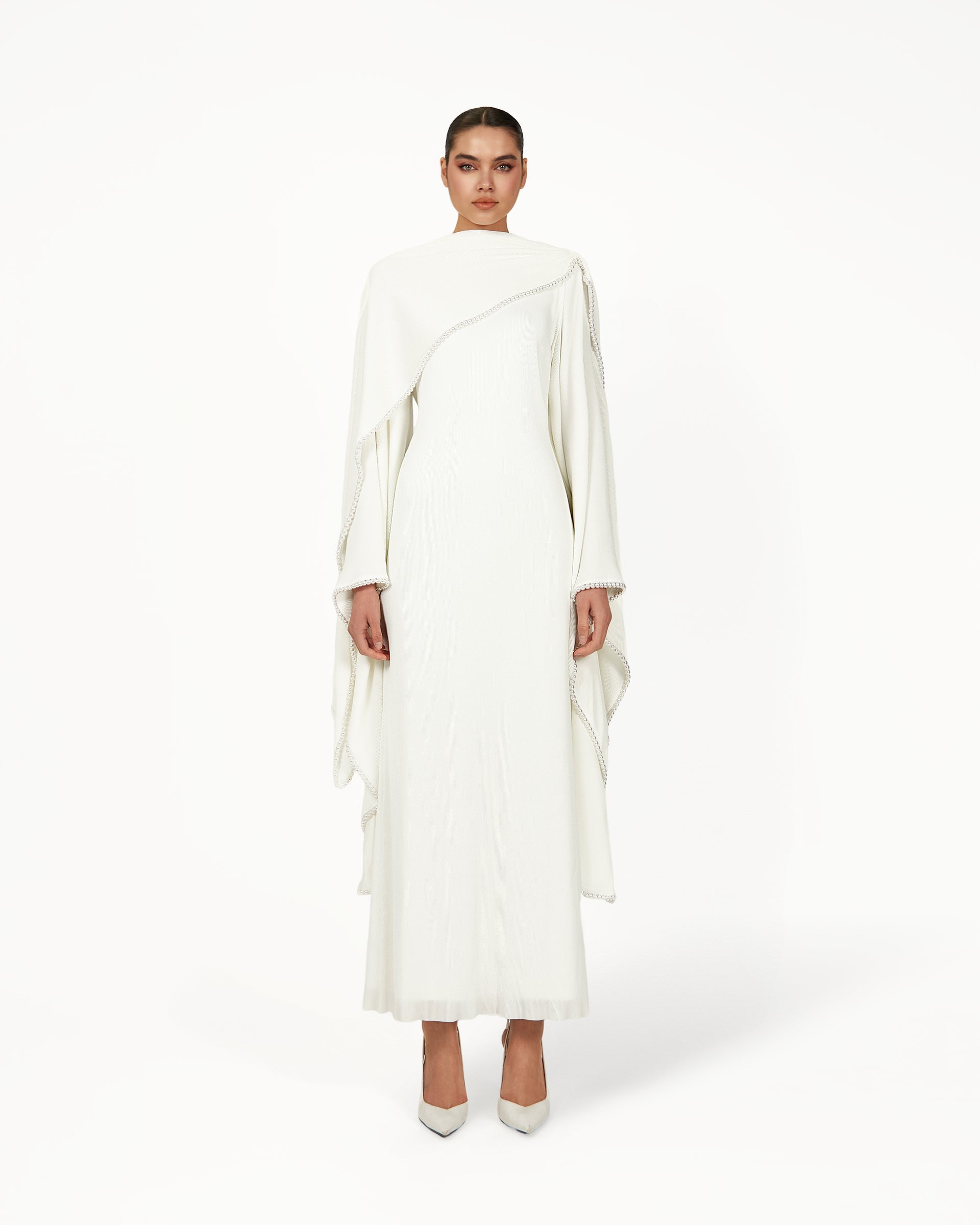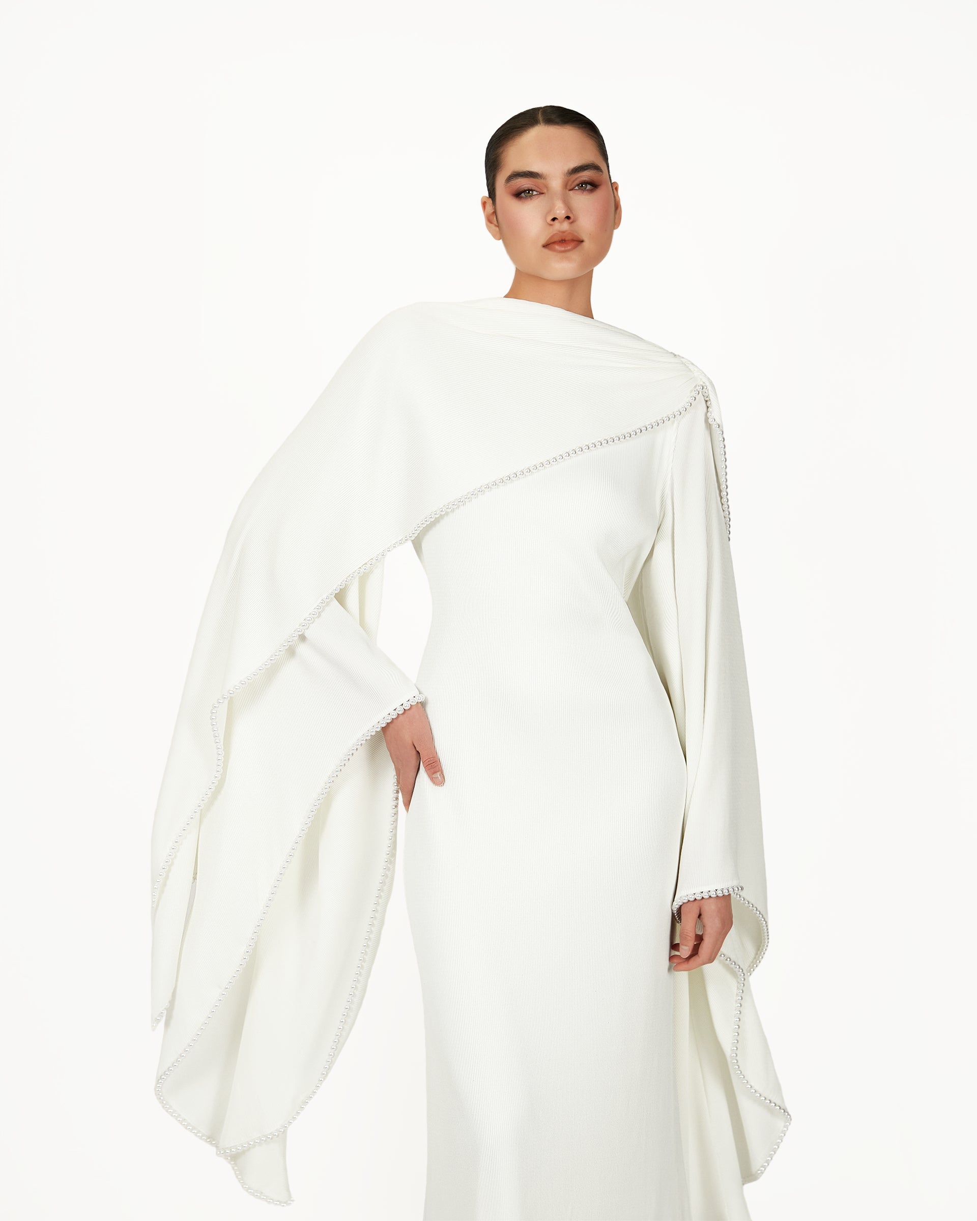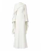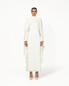 The Keila Dress in white is a flowing modest bridal gown designed for brides seeking elegance without a figure-hugging fit. Featuring a draped overlay, gathered shoulders, flared sleeves, and an adjustable waist, this white bridal dress moves beautifully for weddings, engagement parties, and elegant formal occasions.
