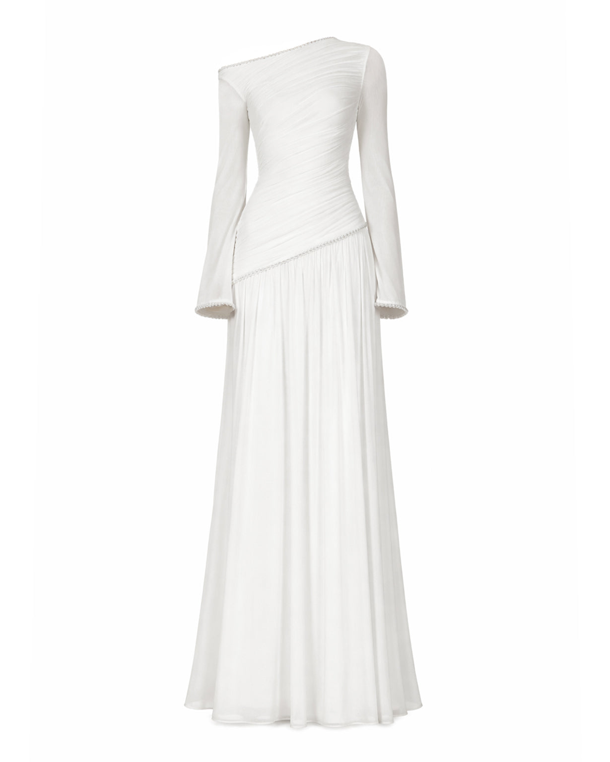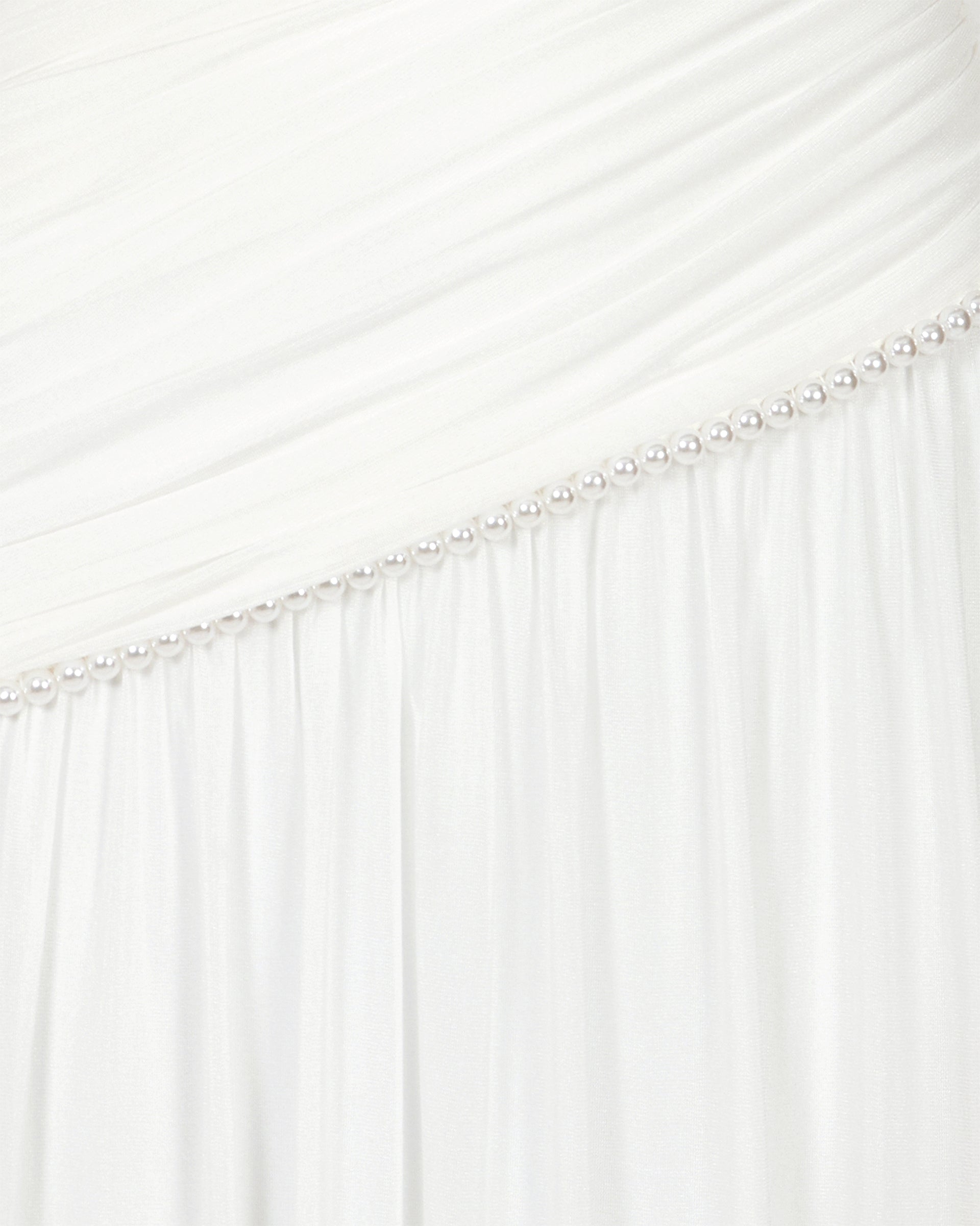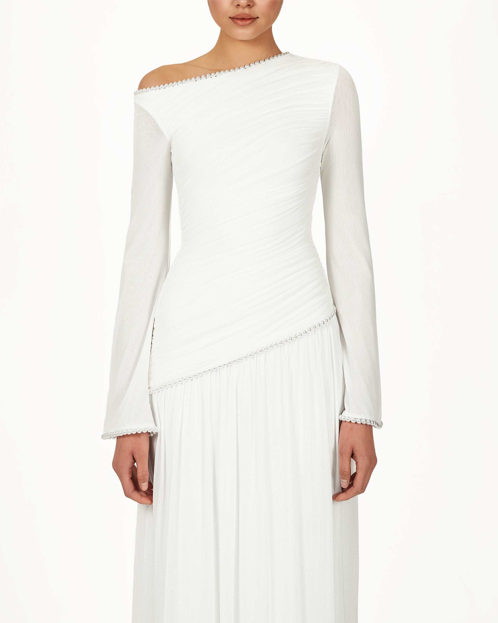 Asymmetric neckline with pearls.