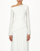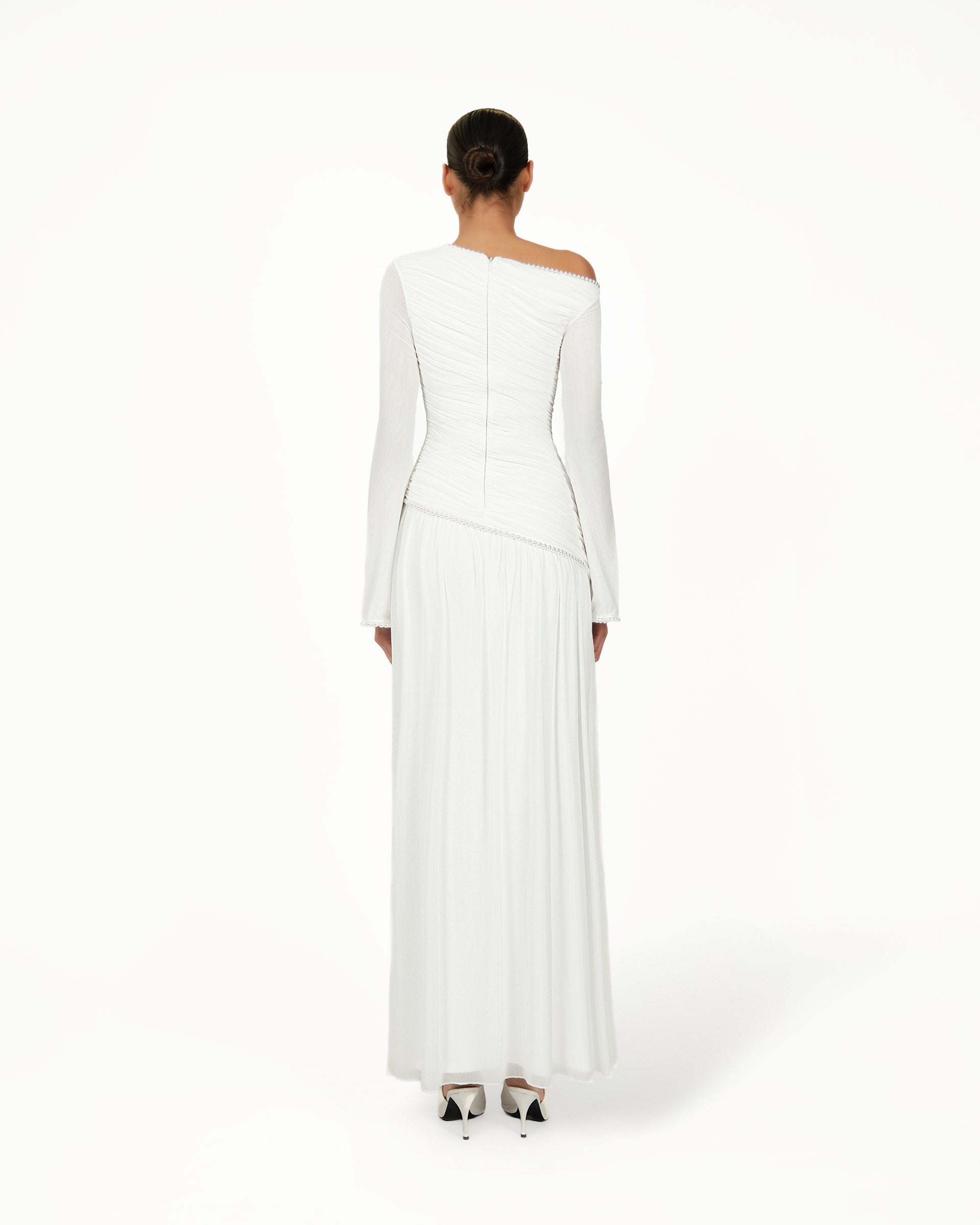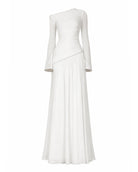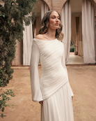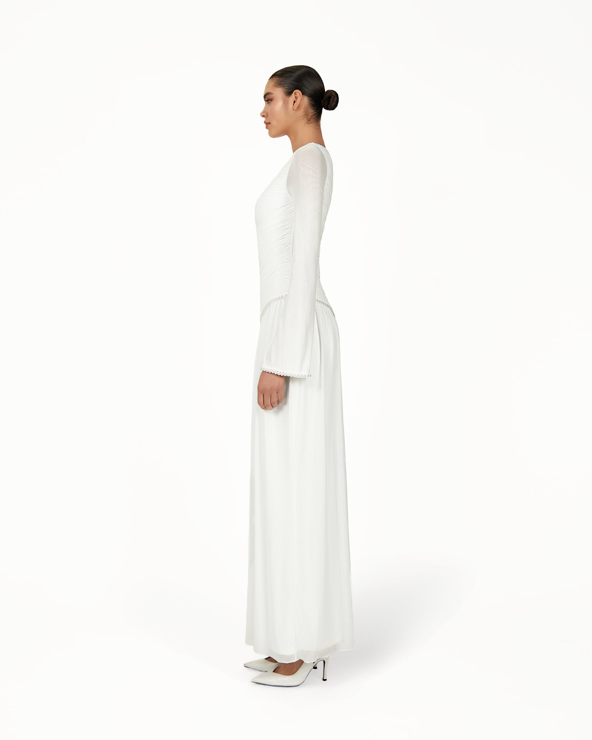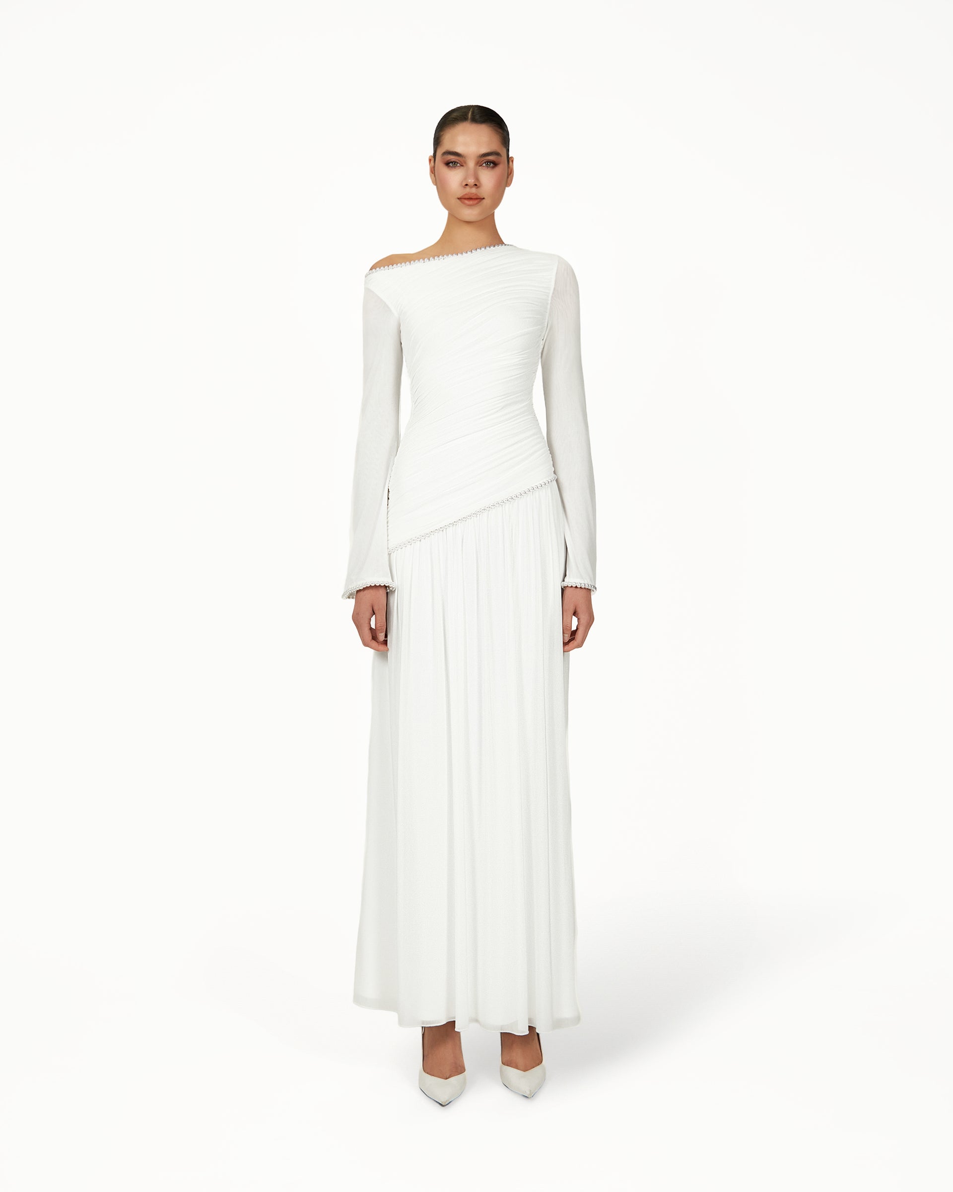The Kimi Dress in white combines asymmetric gathers, a draped hem, and a hand-stitched pearl-trimmed neckline for a flattering, flowy silhouette. Slightly flared sleeves with hand-stitched pearls make this bridal-inspired white dress perfect for weddings, engagement celebrations, bridal showers, civil ceremonies, and elegant daytime or evening occasions.