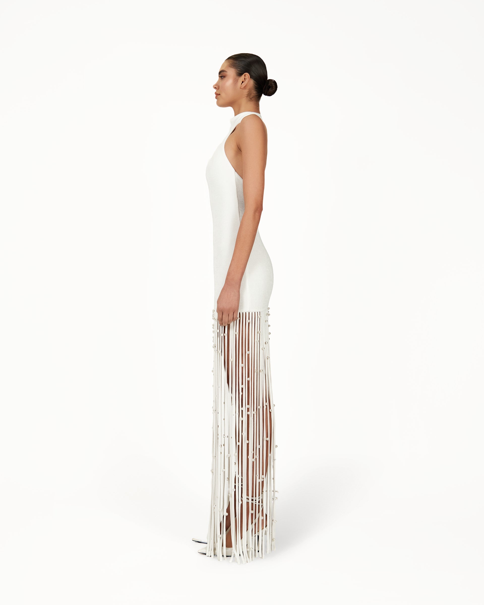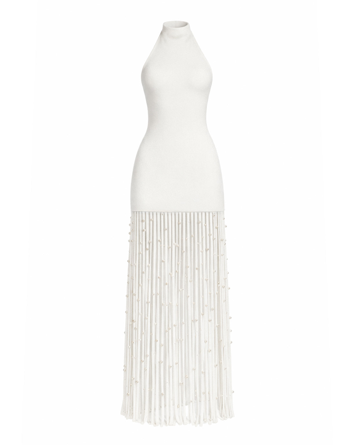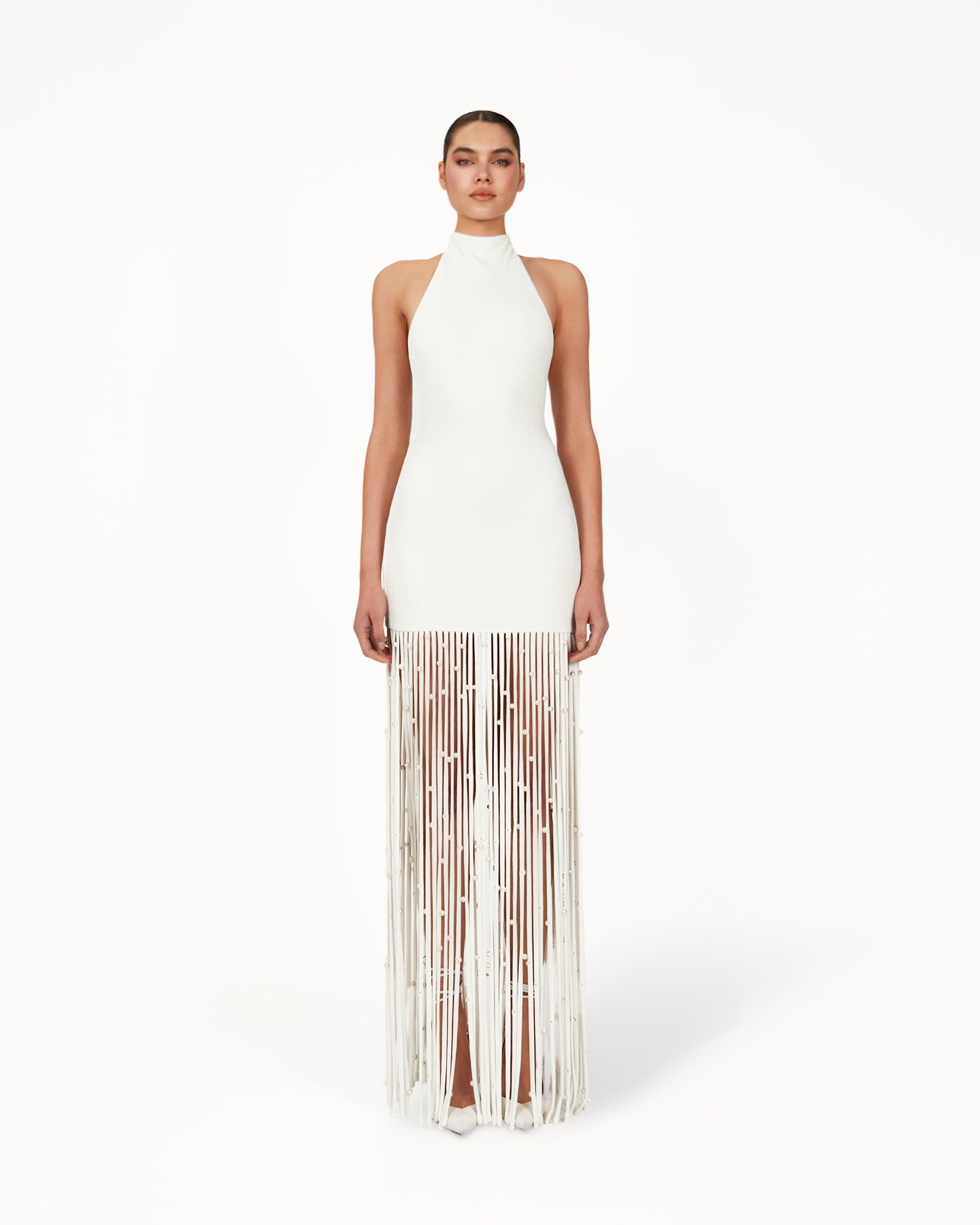 The Kiran Dress in white is a show-stopping bridal dress designed for the modern bride. Crafted from slinky jersey with a high halter neck, open back, and floor-length pearl-adorned fringe. Sculpted yet comfortable, this white wedding gown flows beautifully, perfect for weddings, rehearsal dinners, engagement celebrations, or any refined formal occasion.