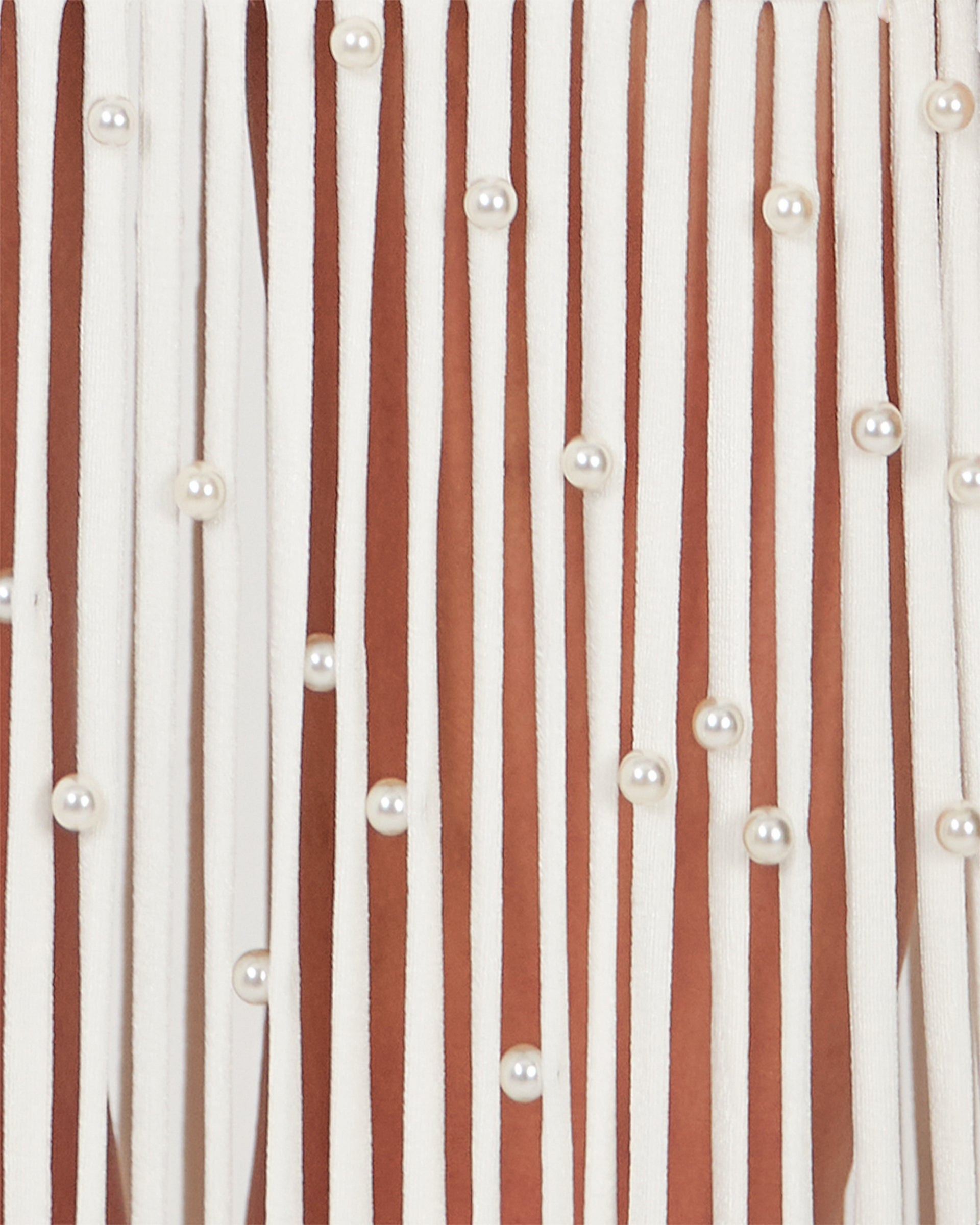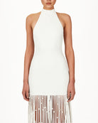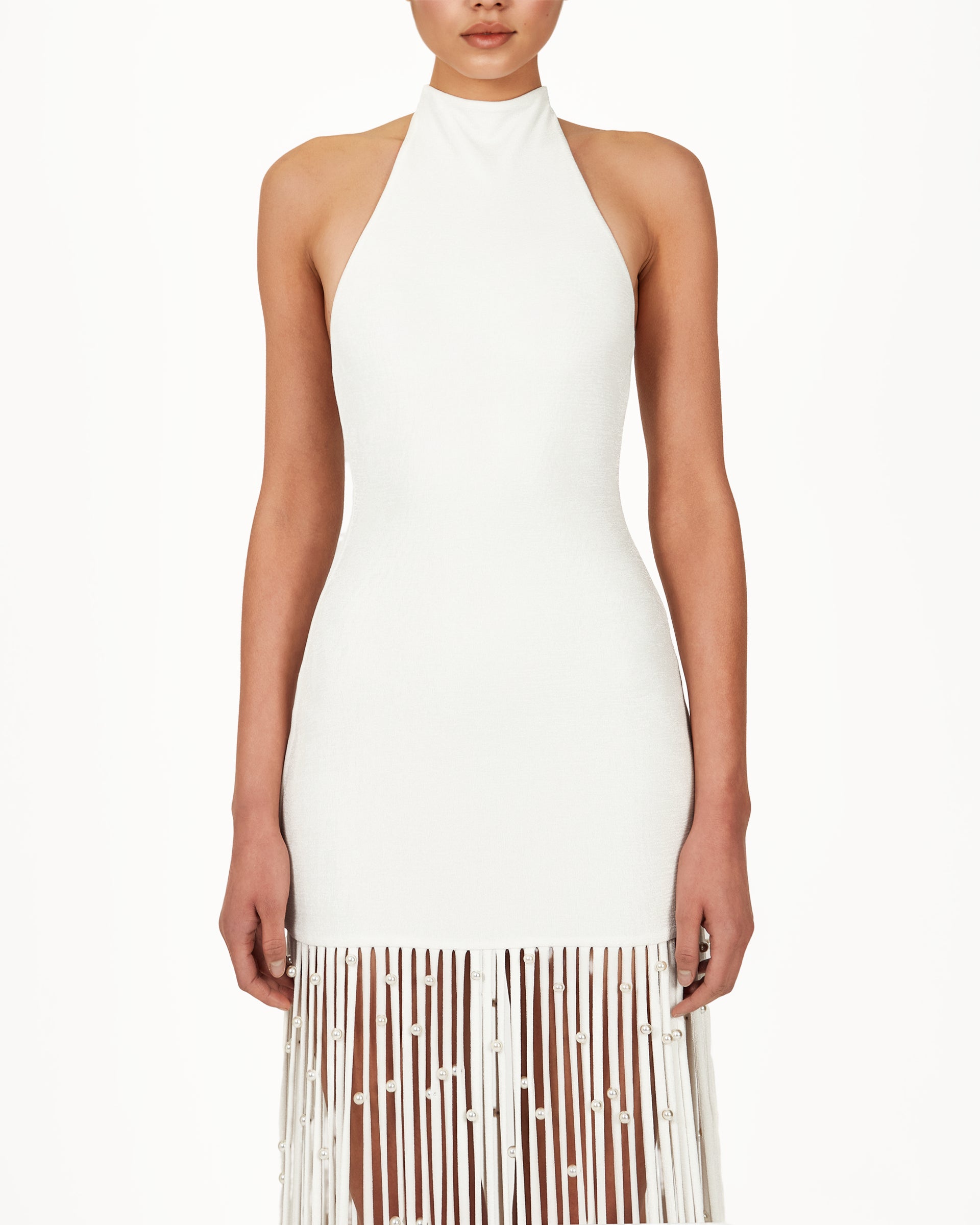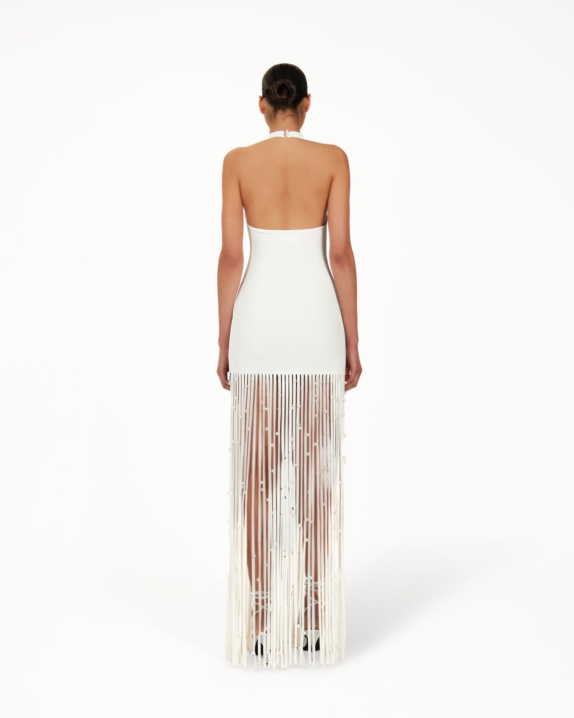 The Kiran Dress in white is a show-stopping bridal dress designed for the modern bride. Crafted from slinky jersey with a high halter neck, open back, and floor-length pearl-adorned fringe. Sculpted yet comfortable, this white wedding gown flows beautifully, perfect for weddings, rehearsal dinners, engagement celebrations, or any refined formal occasion.