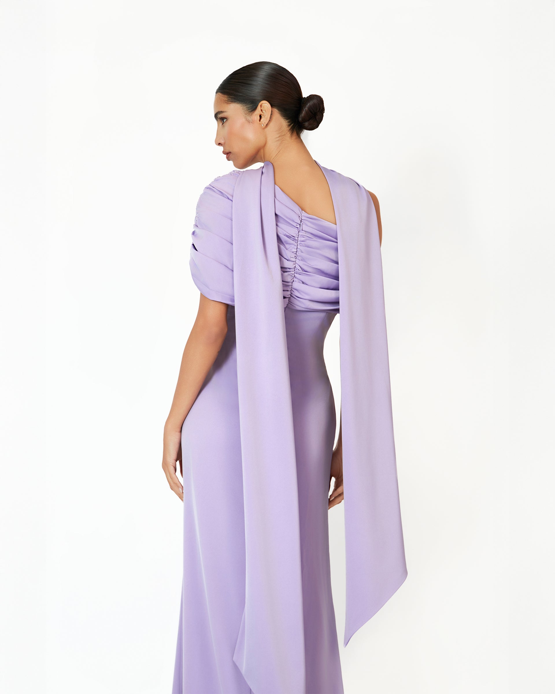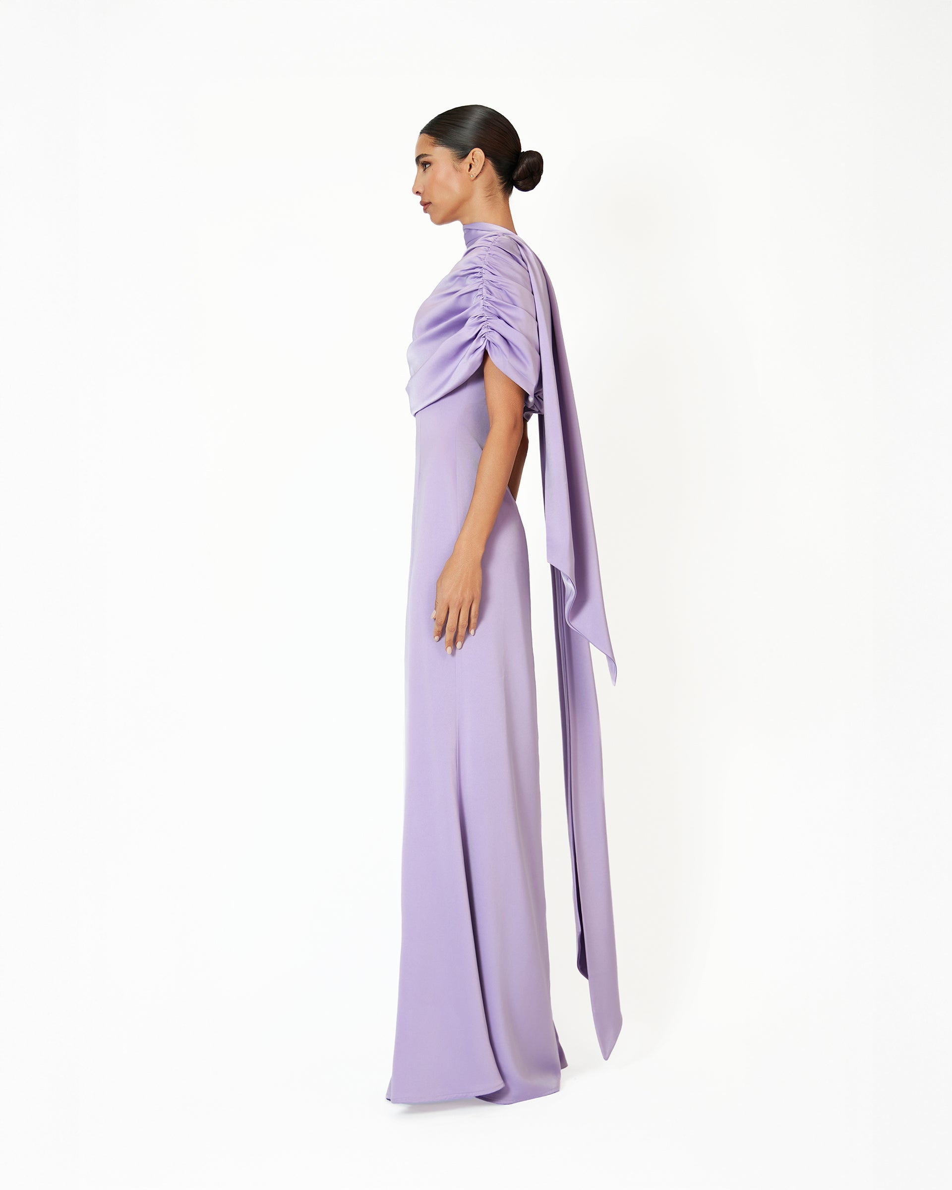 Introducing the Kiris dress in lilac, a perfect fusion of elegance and modern sophistication. Crafted from luxurious satin, this dress features a gathered bardot neckline that effortlessly frames the shoulders, while the soft A-line silhouette flows gracefully, creating a timeless yet contemporary look. The satin fabric drapes beautifully, offering a smooth, flattering fit that contours the body with ease. Ideal for an evening affair or a refined celebration, the Kiris dress embodies understated luxury and chic simplicity, making it a standout piece for any occasion.