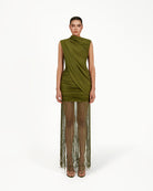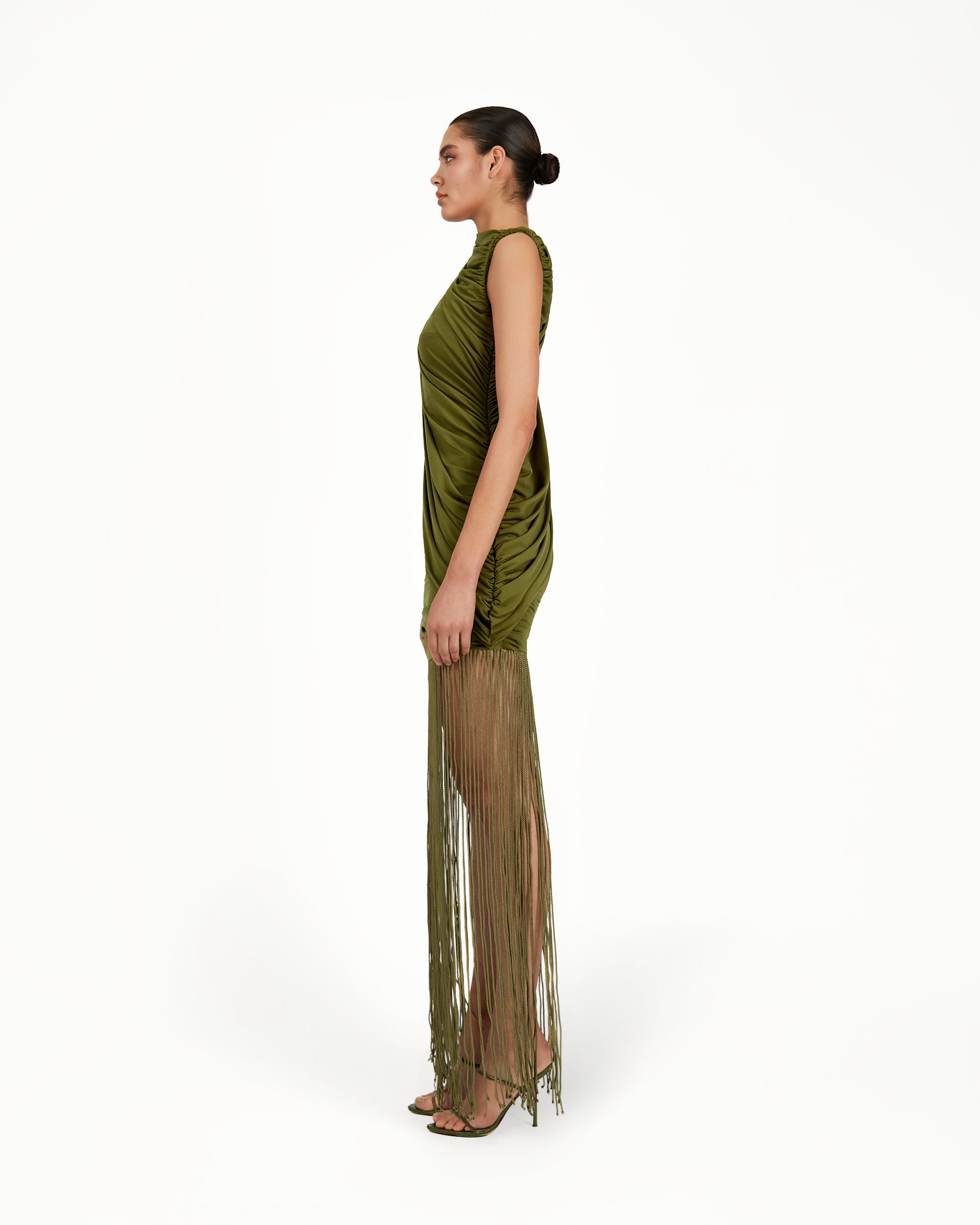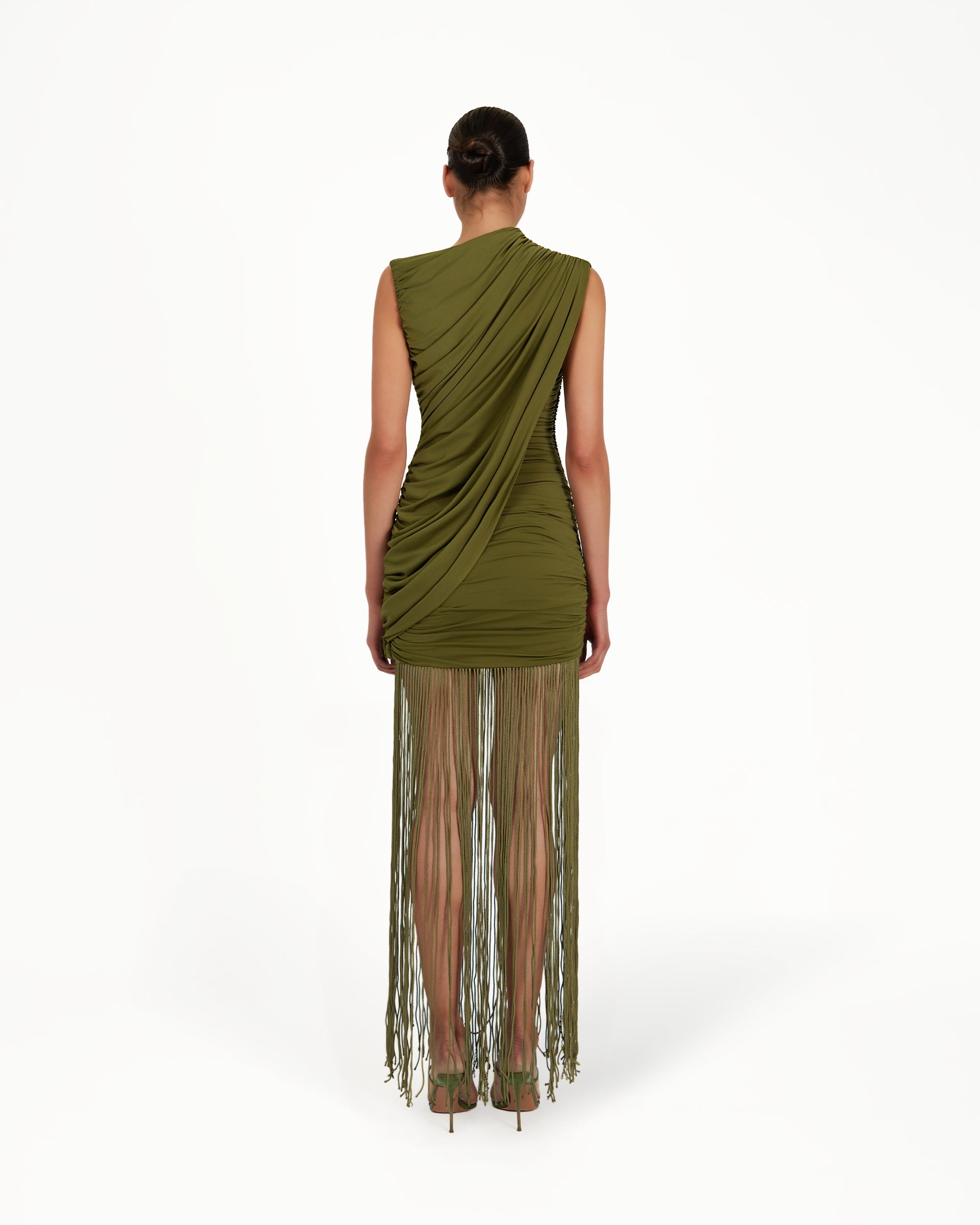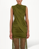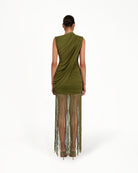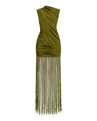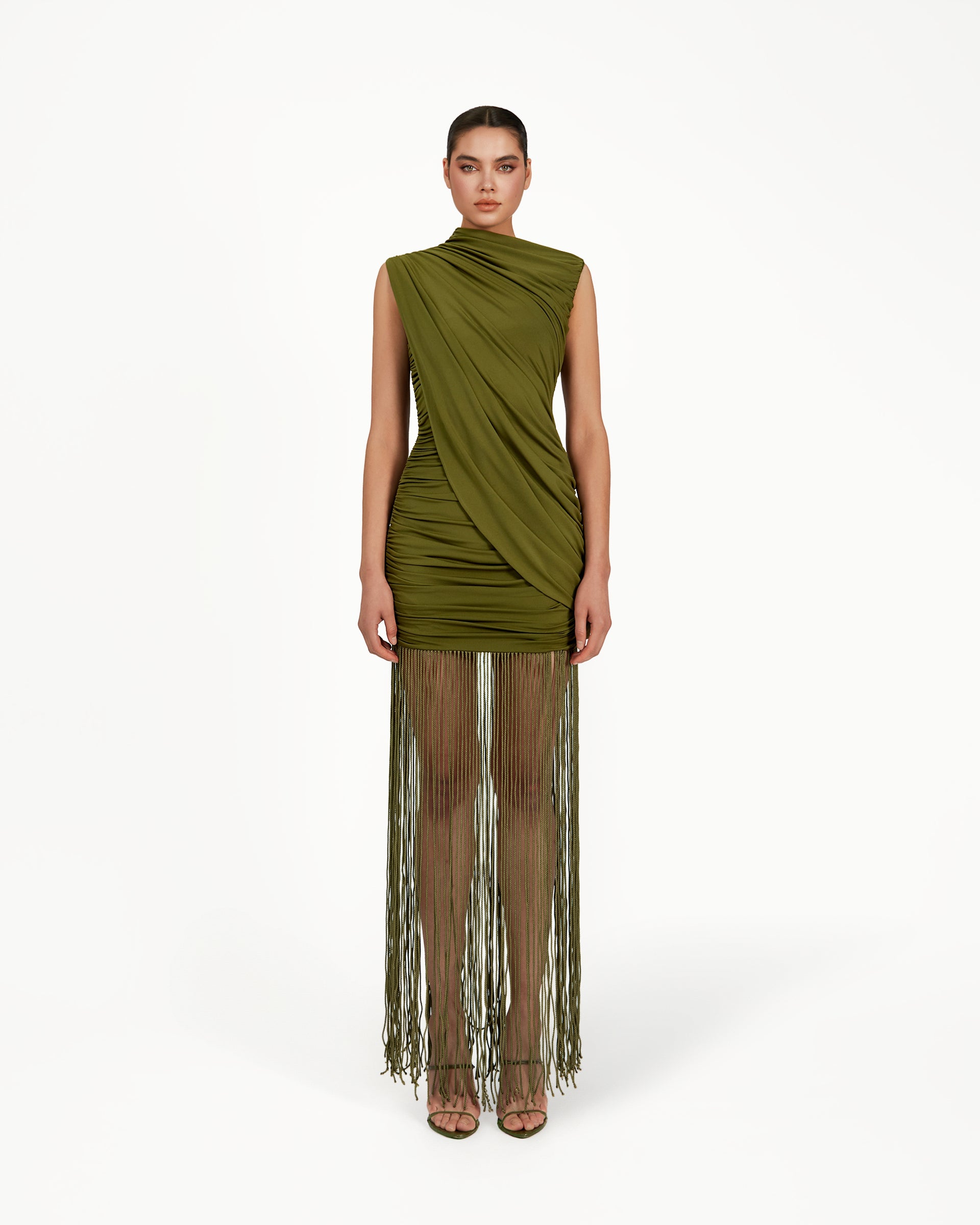 The Kour Mini Dress is an olive green mini dress crafted from sleek Lycra, featuring sculpted gathering and a dramatic fringed hem that moves with every step. Designed for confident, fashion-led styling, it is ideal for summer nights, evening parties, holiday celebrations, and bold occasion dressing.