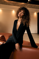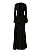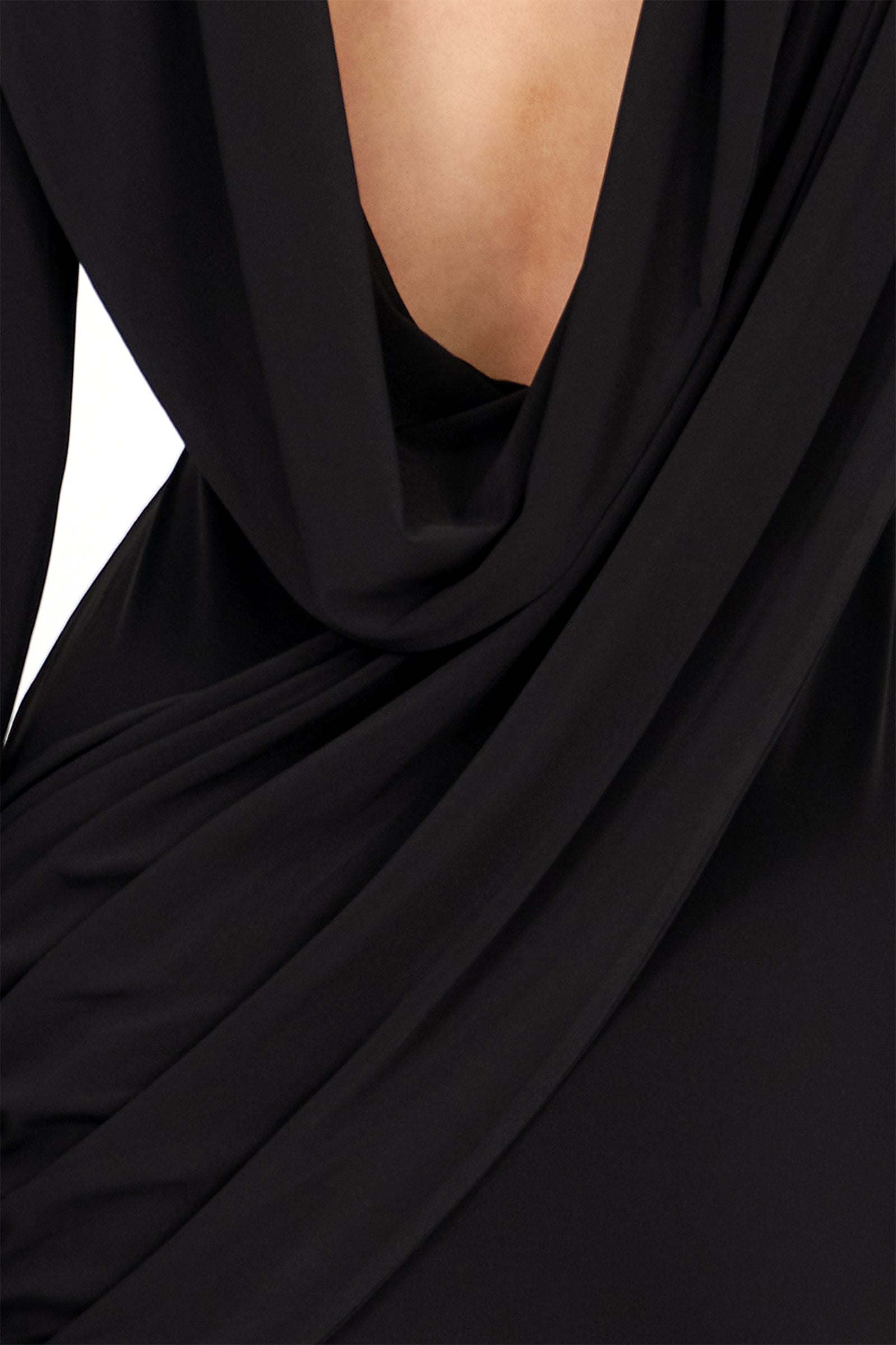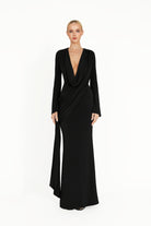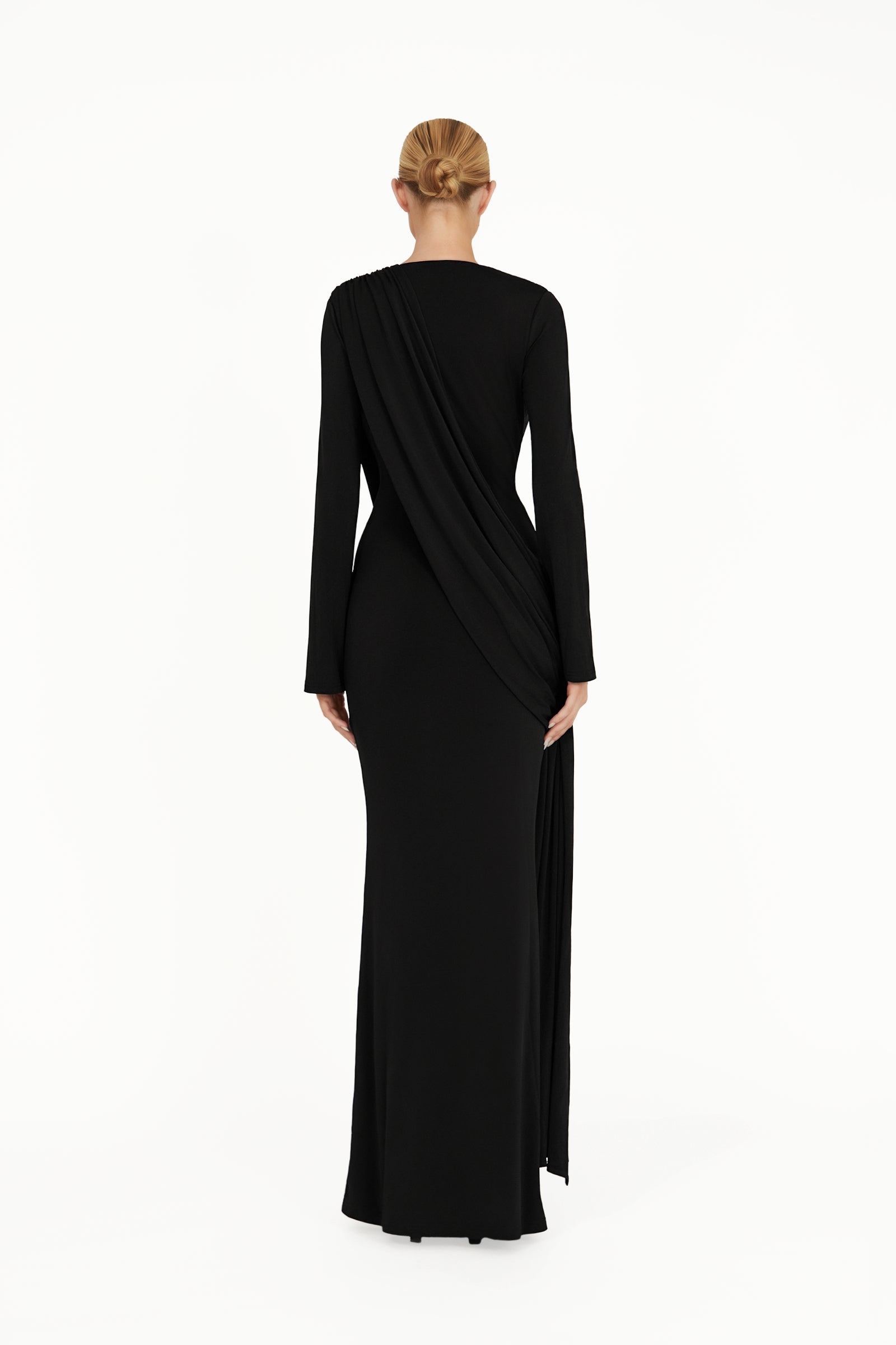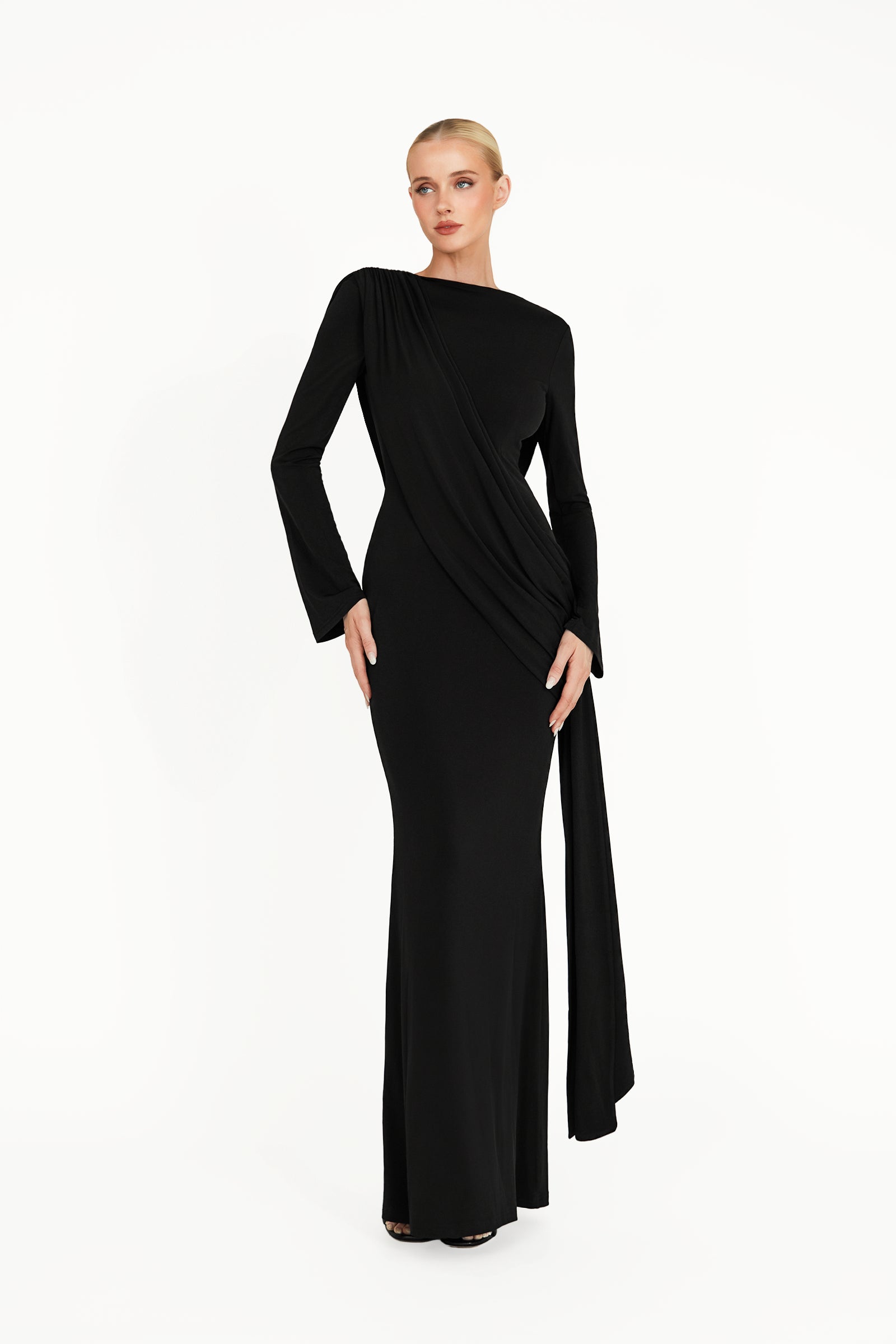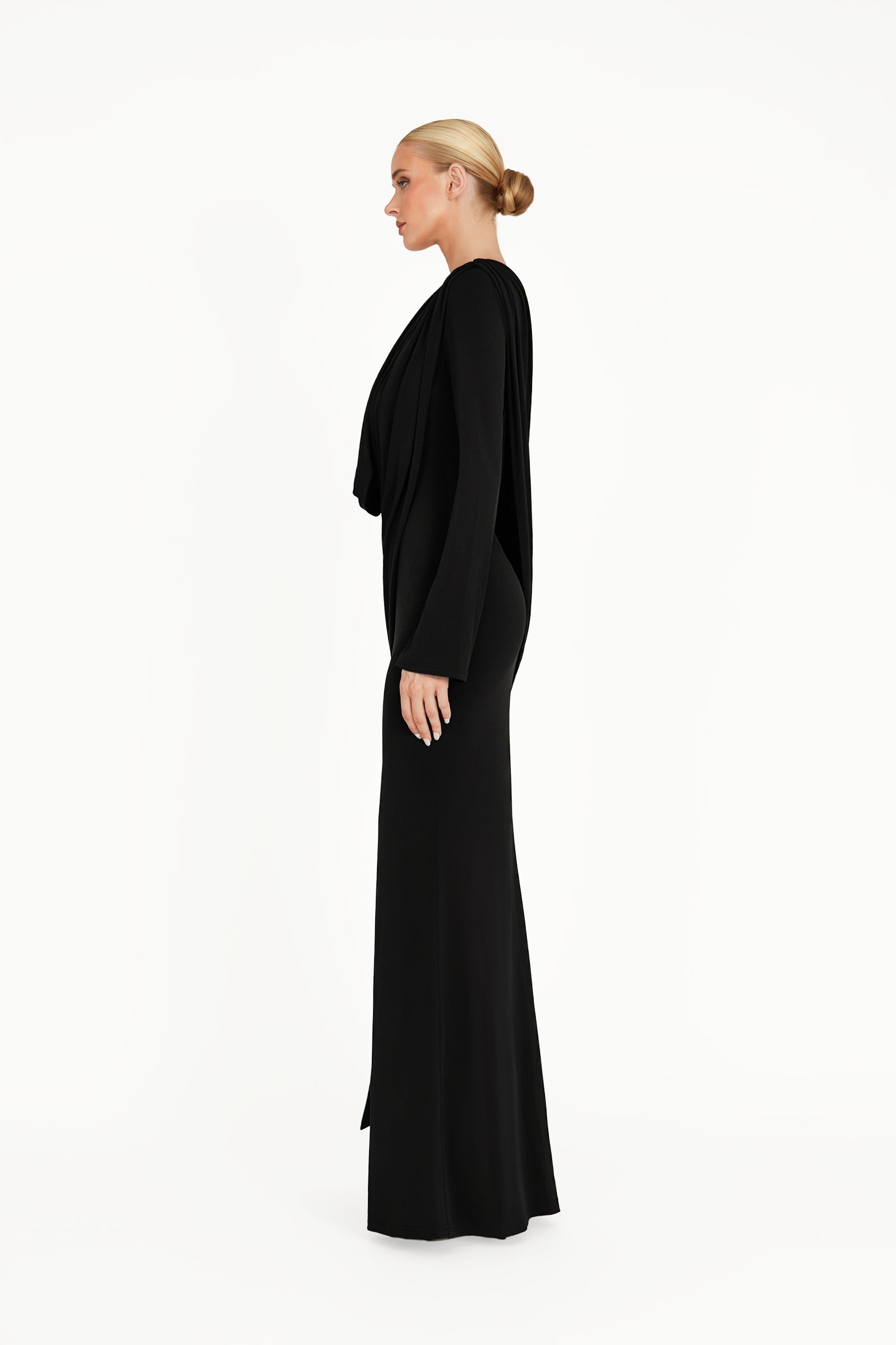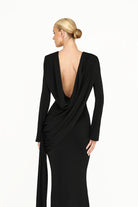 The Kaori Dress is an elegant long-sleeve design crafted from recycled lycra with a softly draped cowl neckline. An overlay gathers gracefully across the body, complemented by subtle sash detailing for a refined, sculpted silhouette. Combining timeless sophistication with contemporary ease, the Kaori Dress exudes understated luxury and modern elegance.