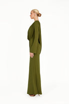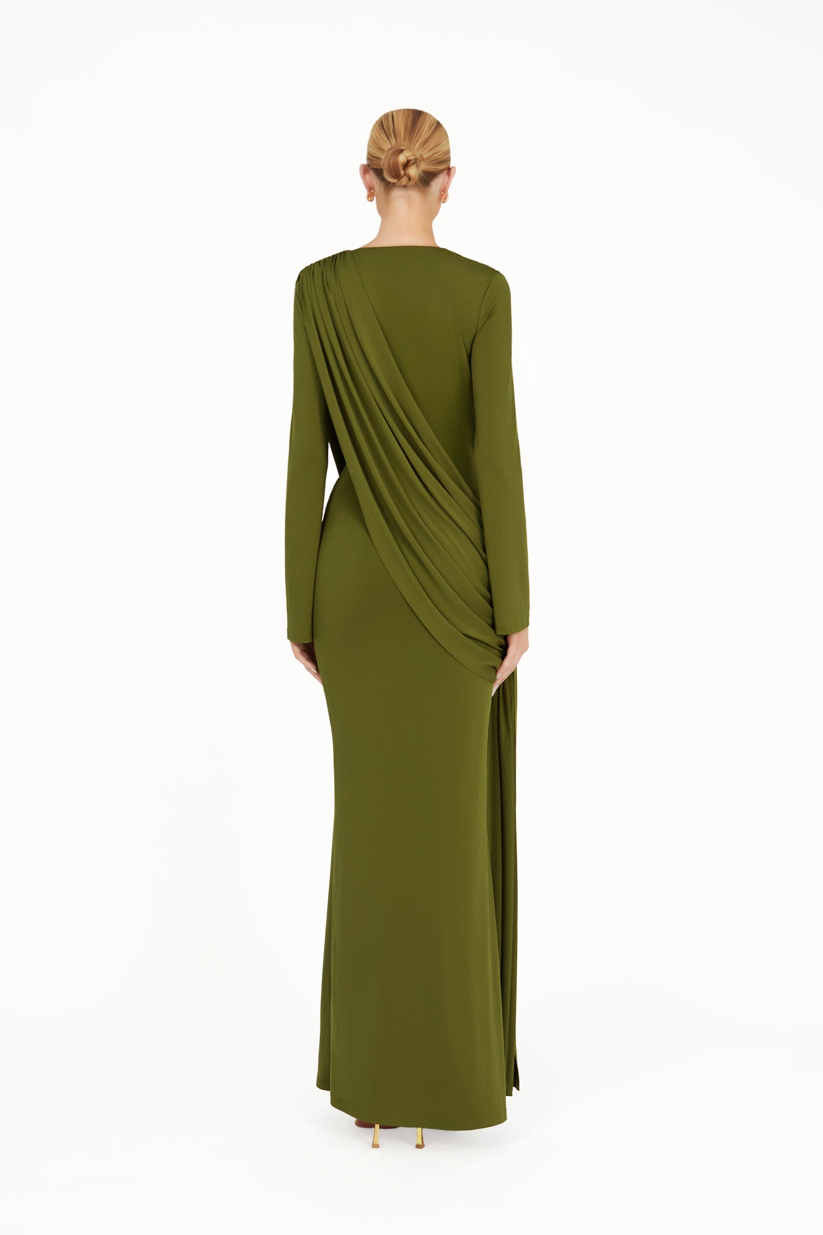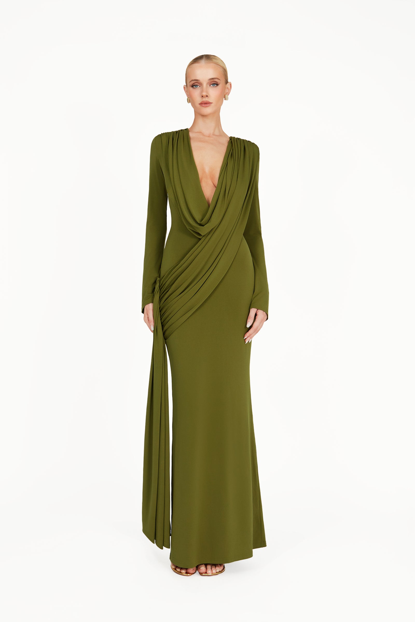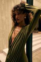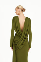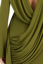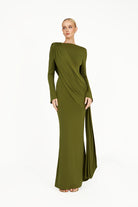 The Kaori Dress in khaki green is an elegant long-sleeve design crafted from recycled lycra with a softly draped cowl neckline. An overlay gathers gracefully across the body, complemented by subtle sash detailing for a refined, sculpted silhouette. Combining timeless sophistication with contemporary ease, the Kaori Dress exudes understated luxury and modern elegance.