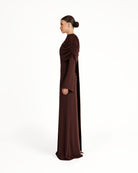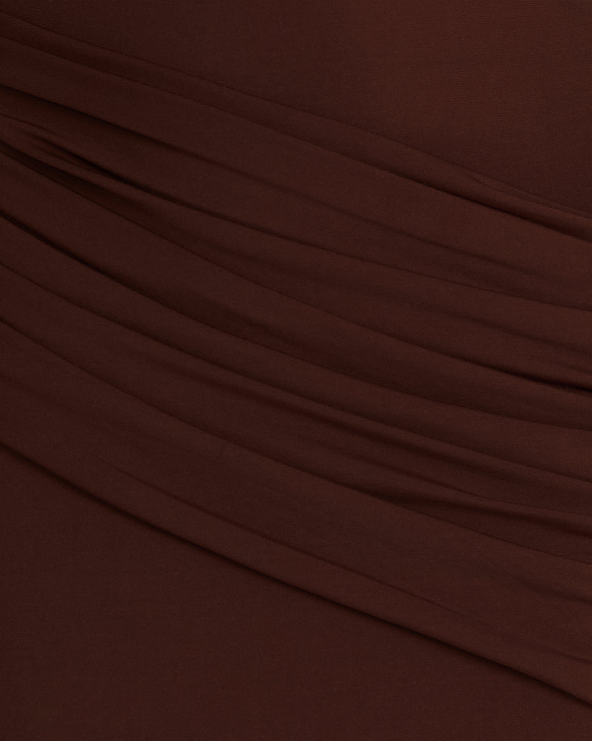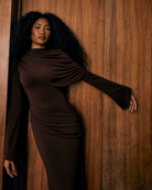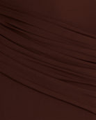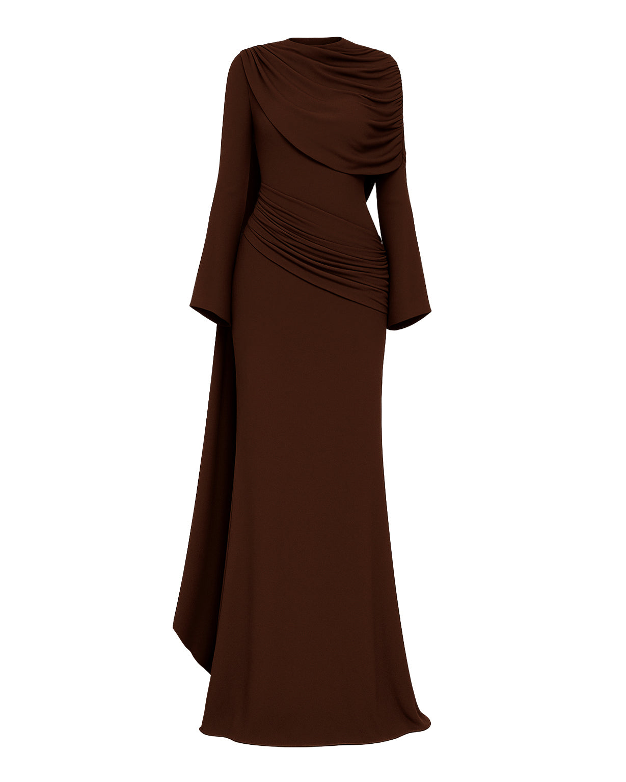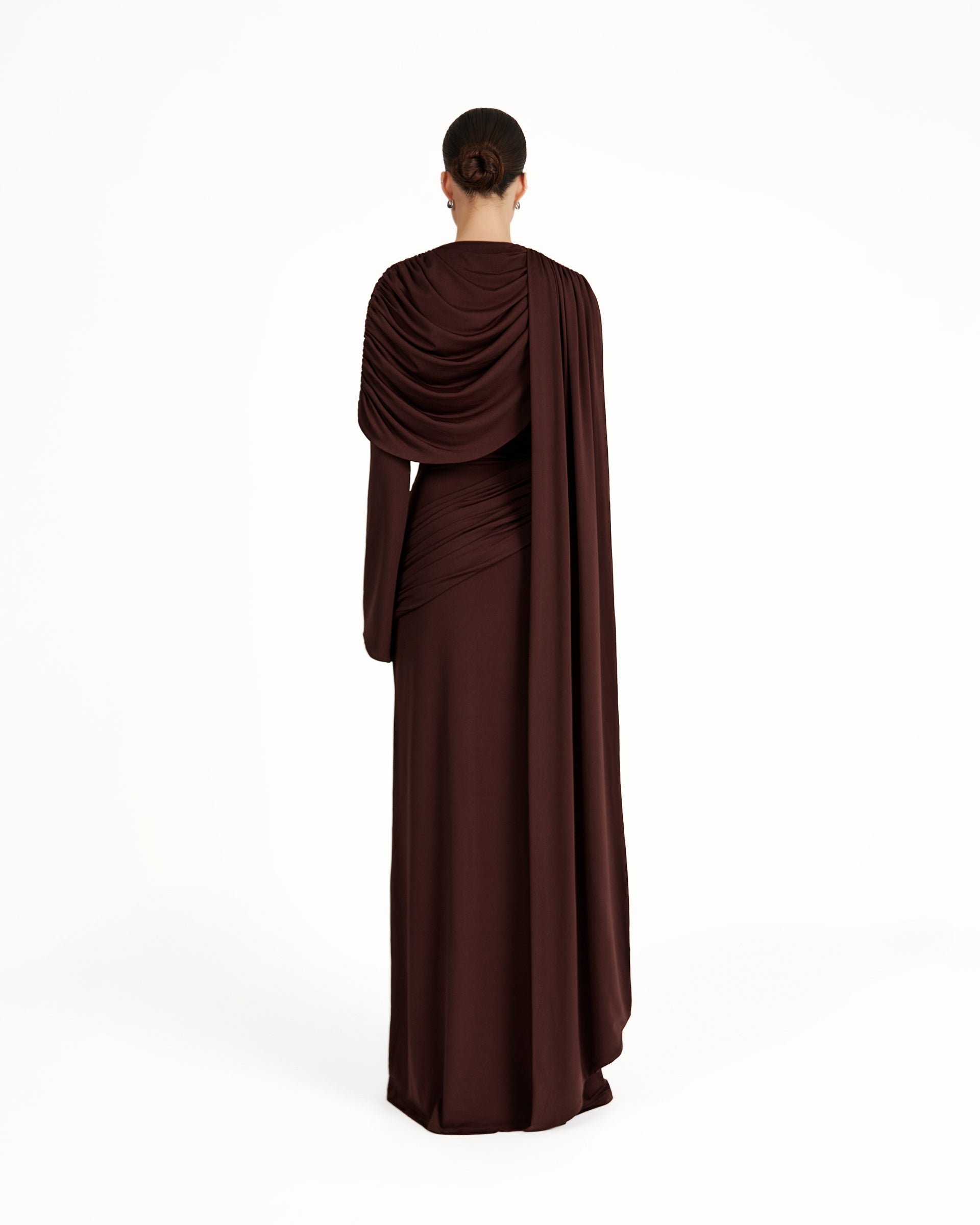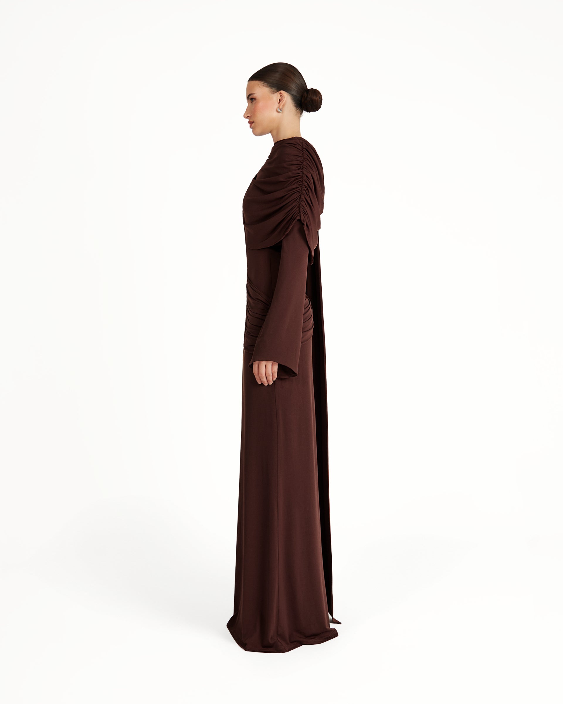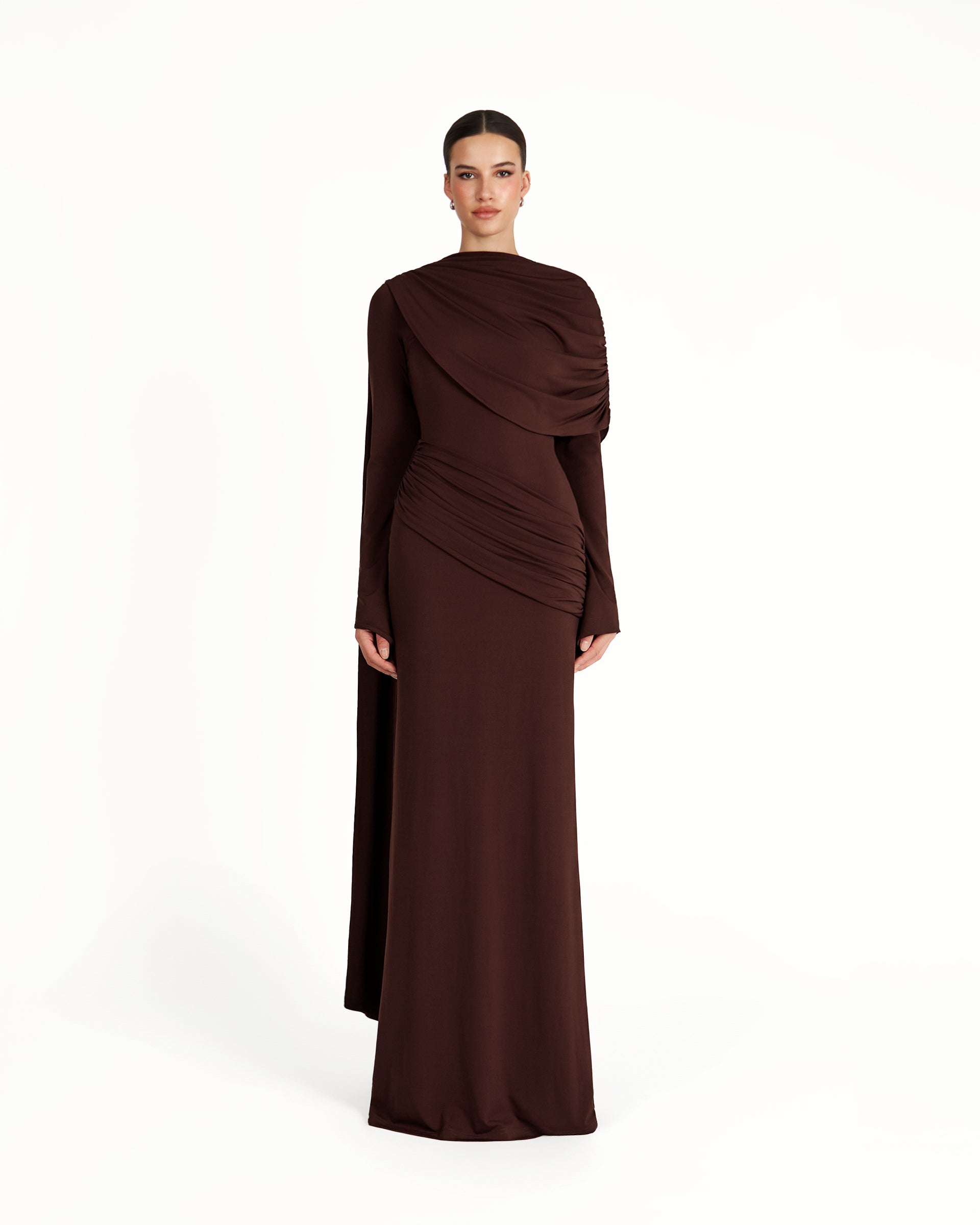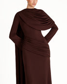 The Karelia Dress in brown is a modest yet elegant design, featuring a gathered sarong detail across the hips that flatters the silhouette. An overlay drapes gracefully across the neckline, complemented by a scarf sash attached at the shoulder for a sophisticated finish. Crafted from recycled lycra fabric, the dress combines timeless elegance with modern refinement, perfect for formal occasions or stylish day-to-evening wear.