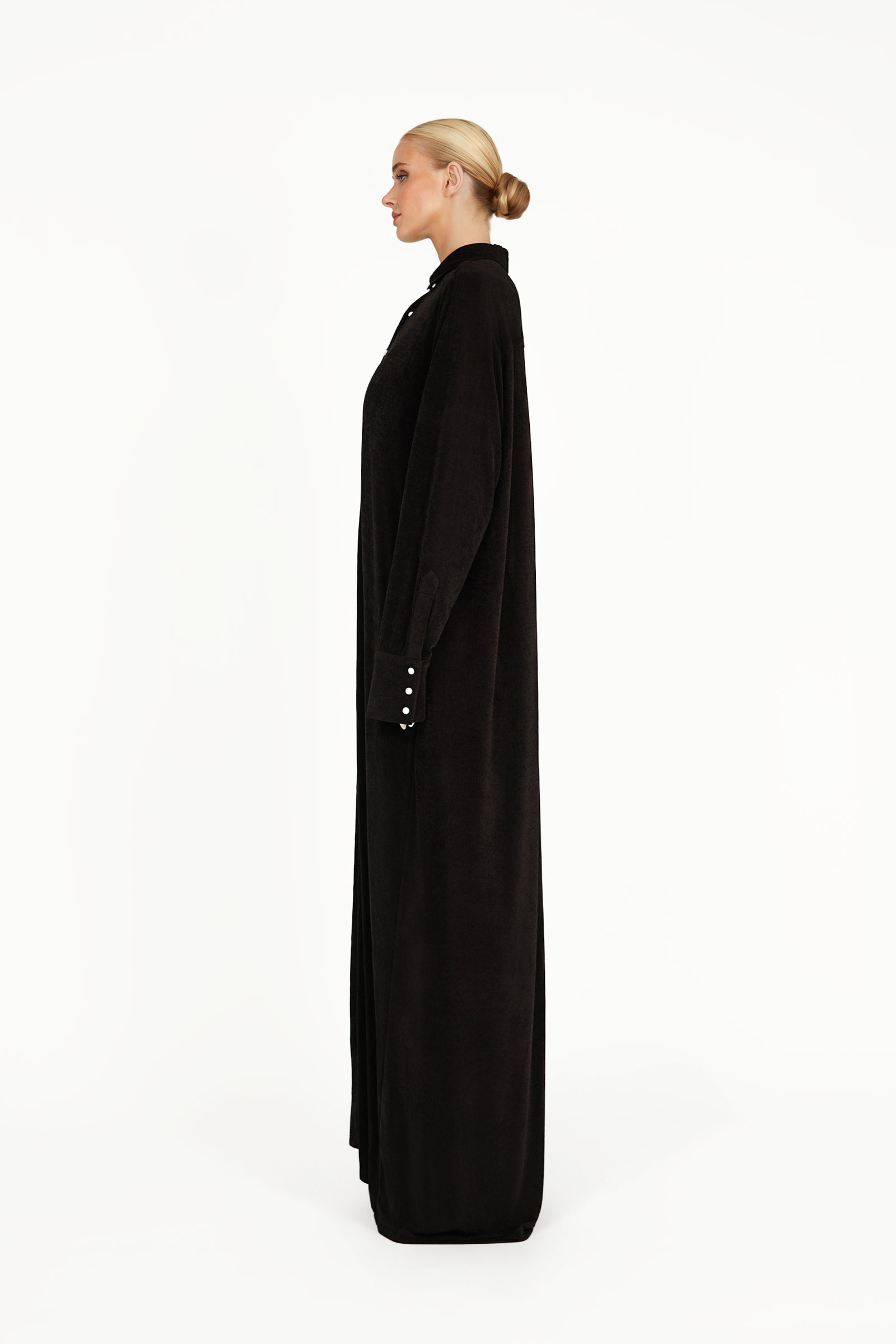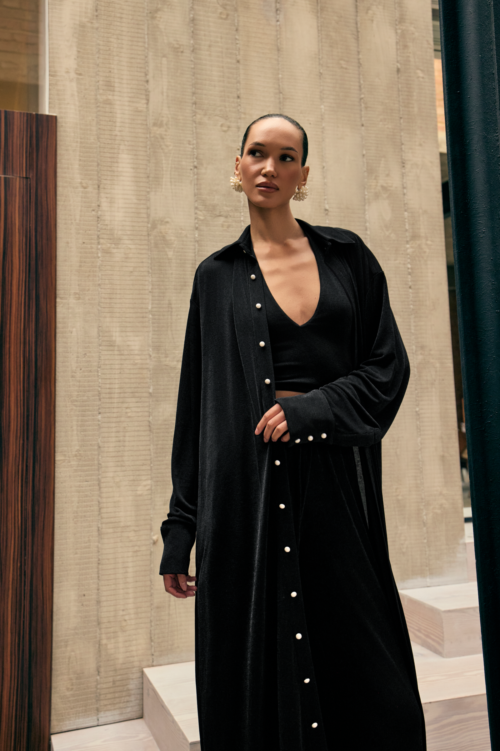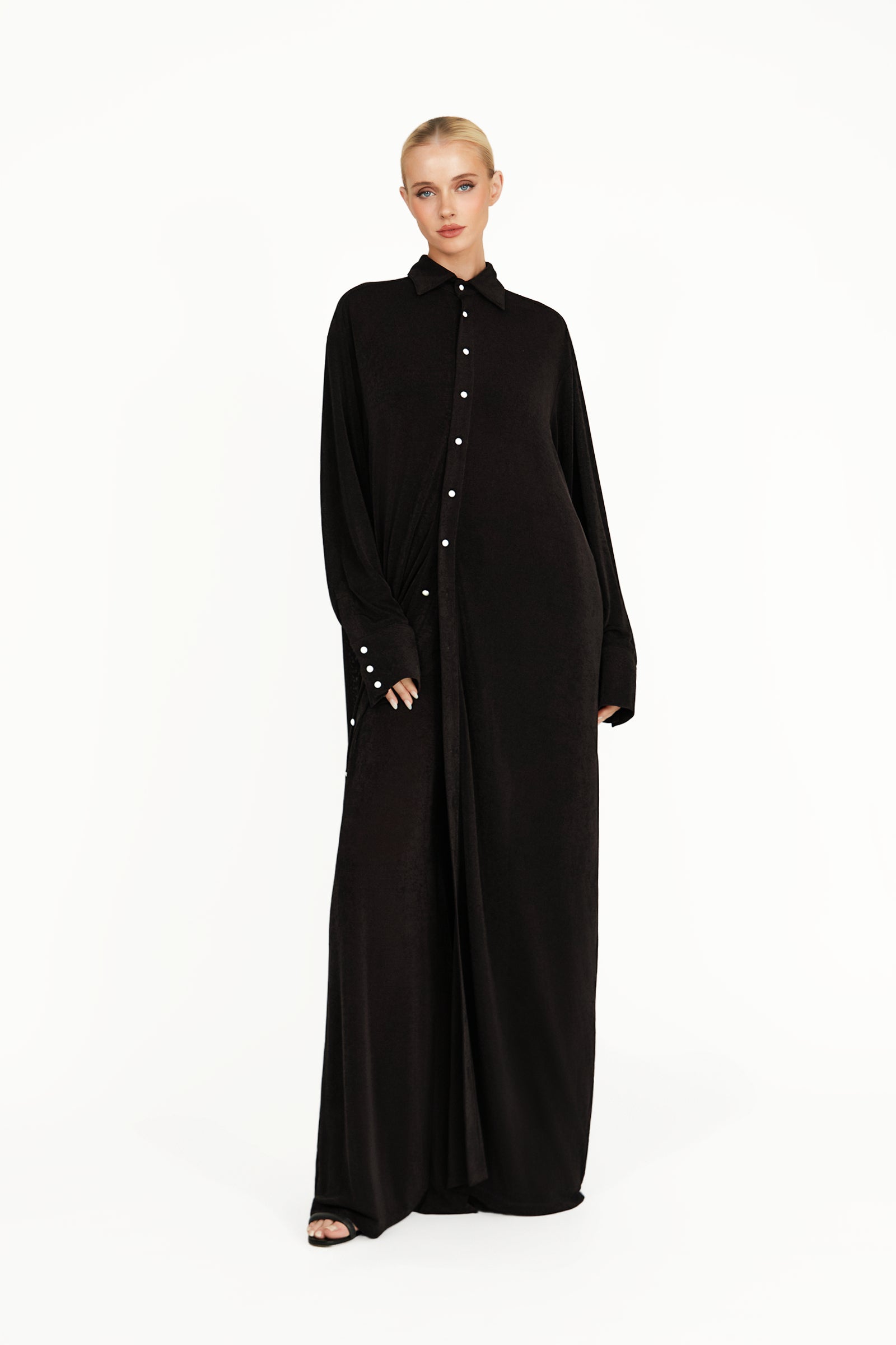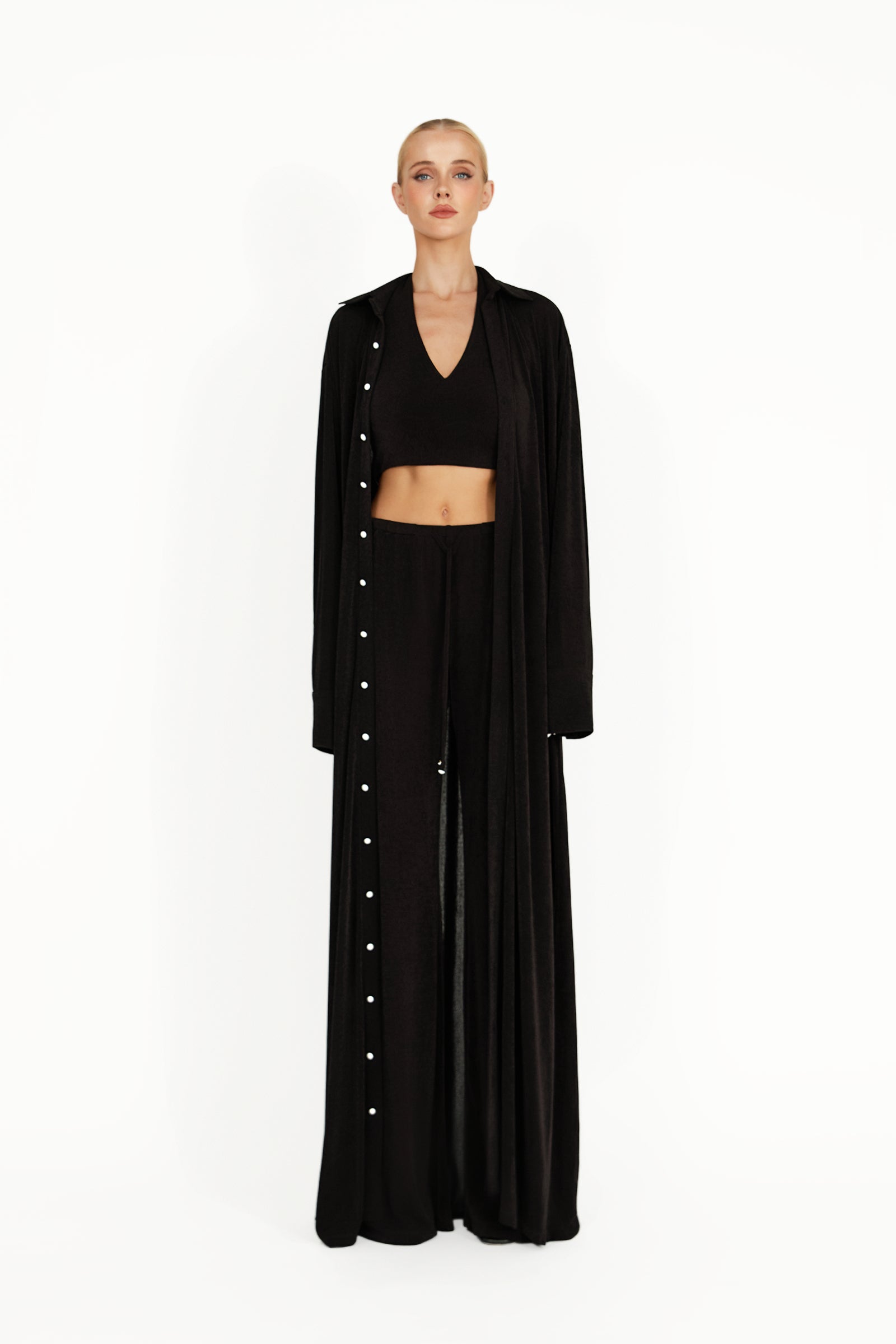 The Kayla Jacket is a floor-length statement piece crafted from sumptuous slinky textured fabric that drapes effortlessly. Featuring Khanum’s signature engraved pearl buttons, it exudes refined elegance and understated luxury. Designed to glide gracefully with every movement, the Kayla Jacket combines modern sophistication with timeless appeal. Pair it with the matching Kayla Coord for a complete, elegant look.