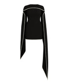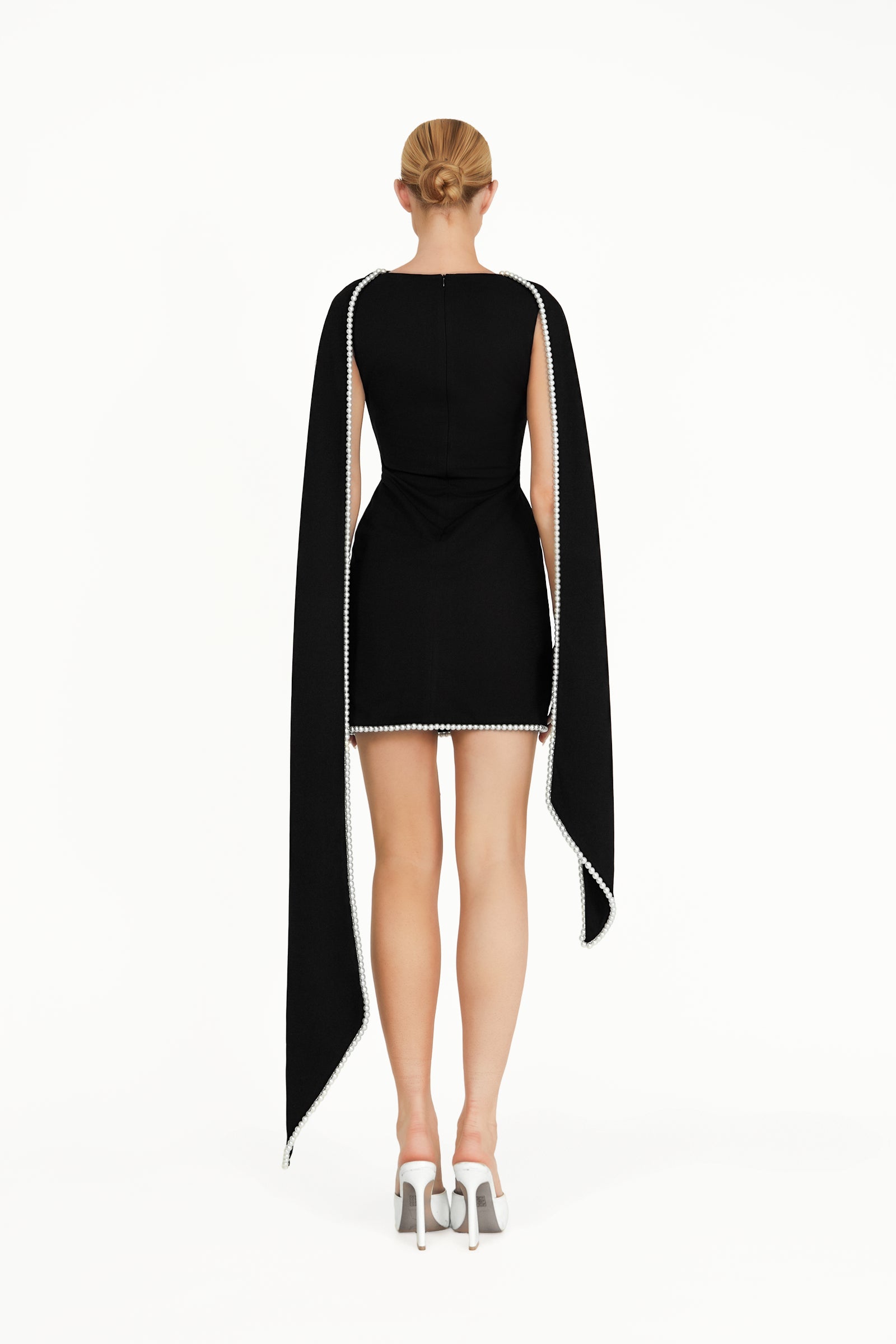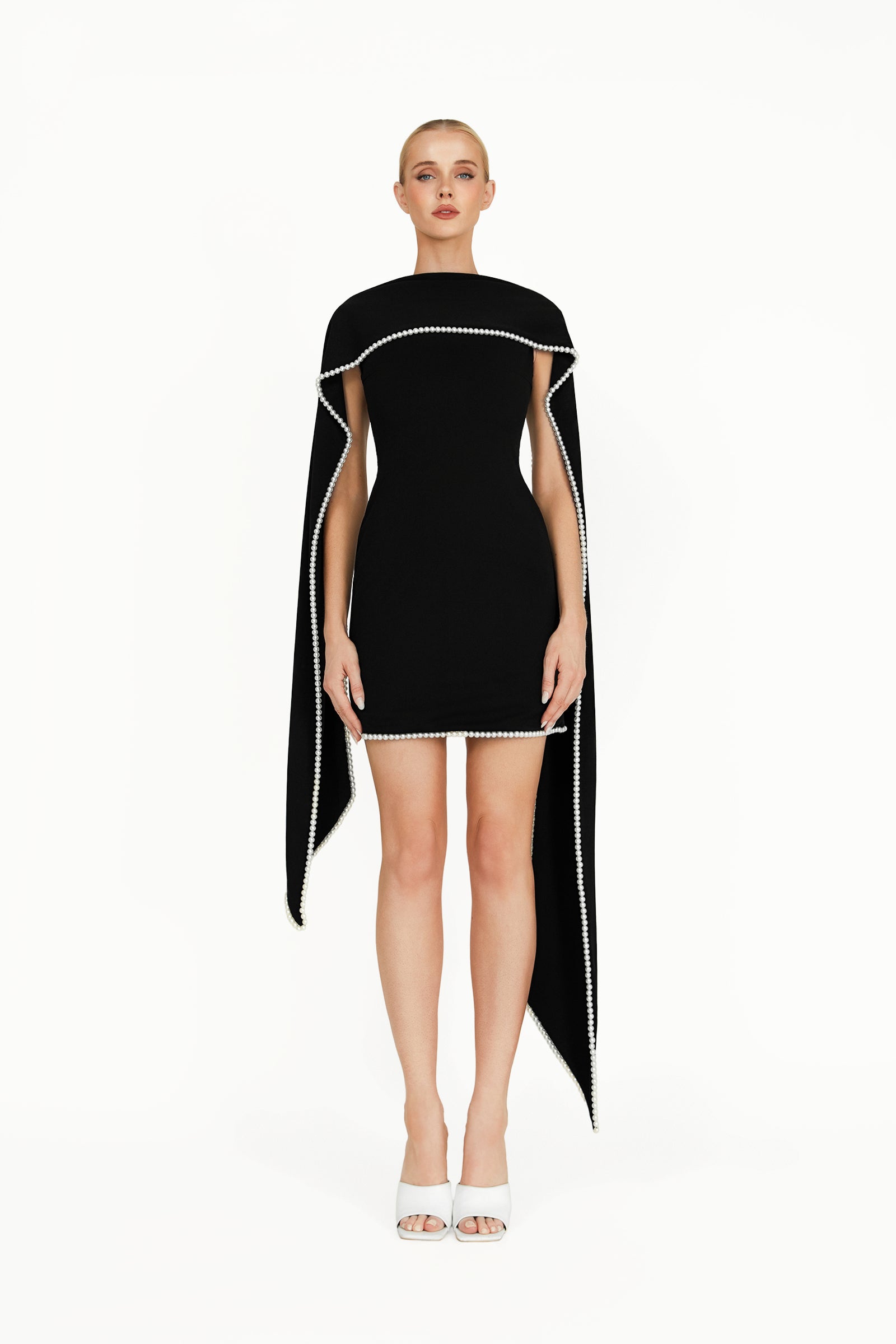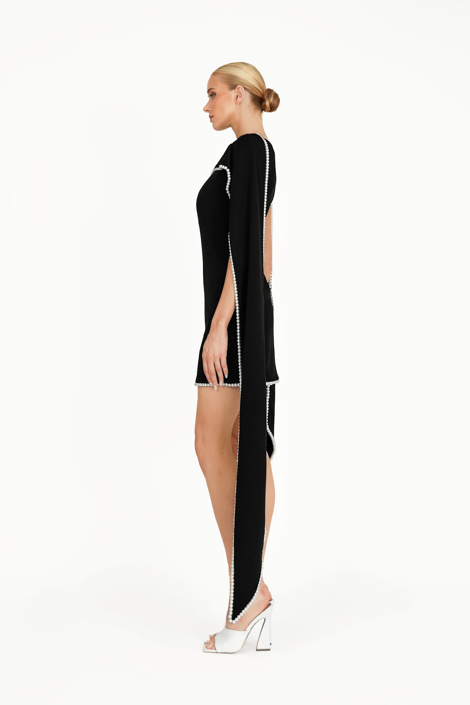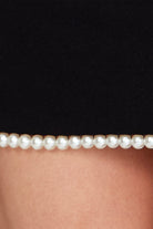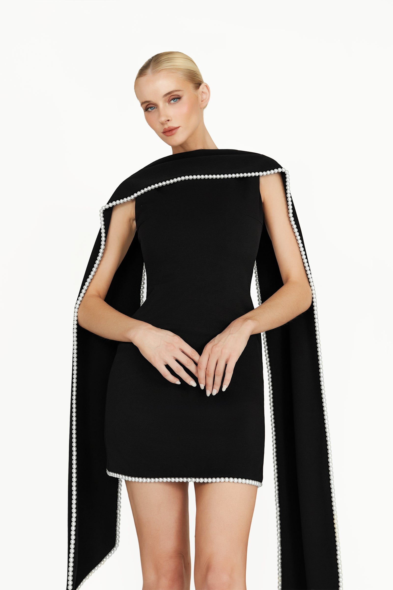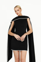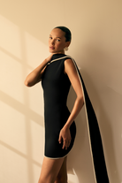The Kerena Mini Dress in black, crafted from luxurious recycled crepe scuba, offers a flattering silhouette with a modern fit. The attached scarf at the neckline, finished with a pearl trim, adds a touch of elegant luxury, making it the perfect choice for any special occasion.