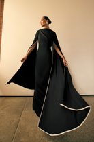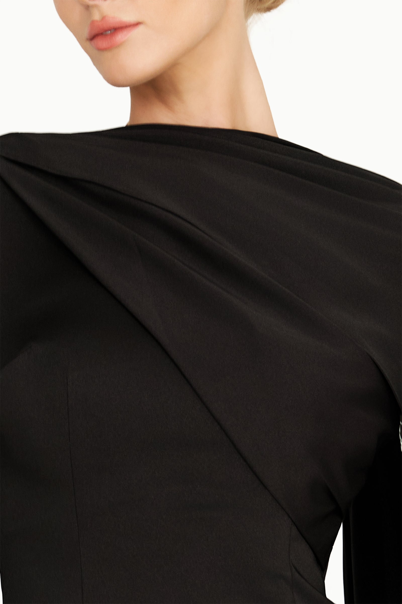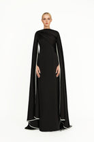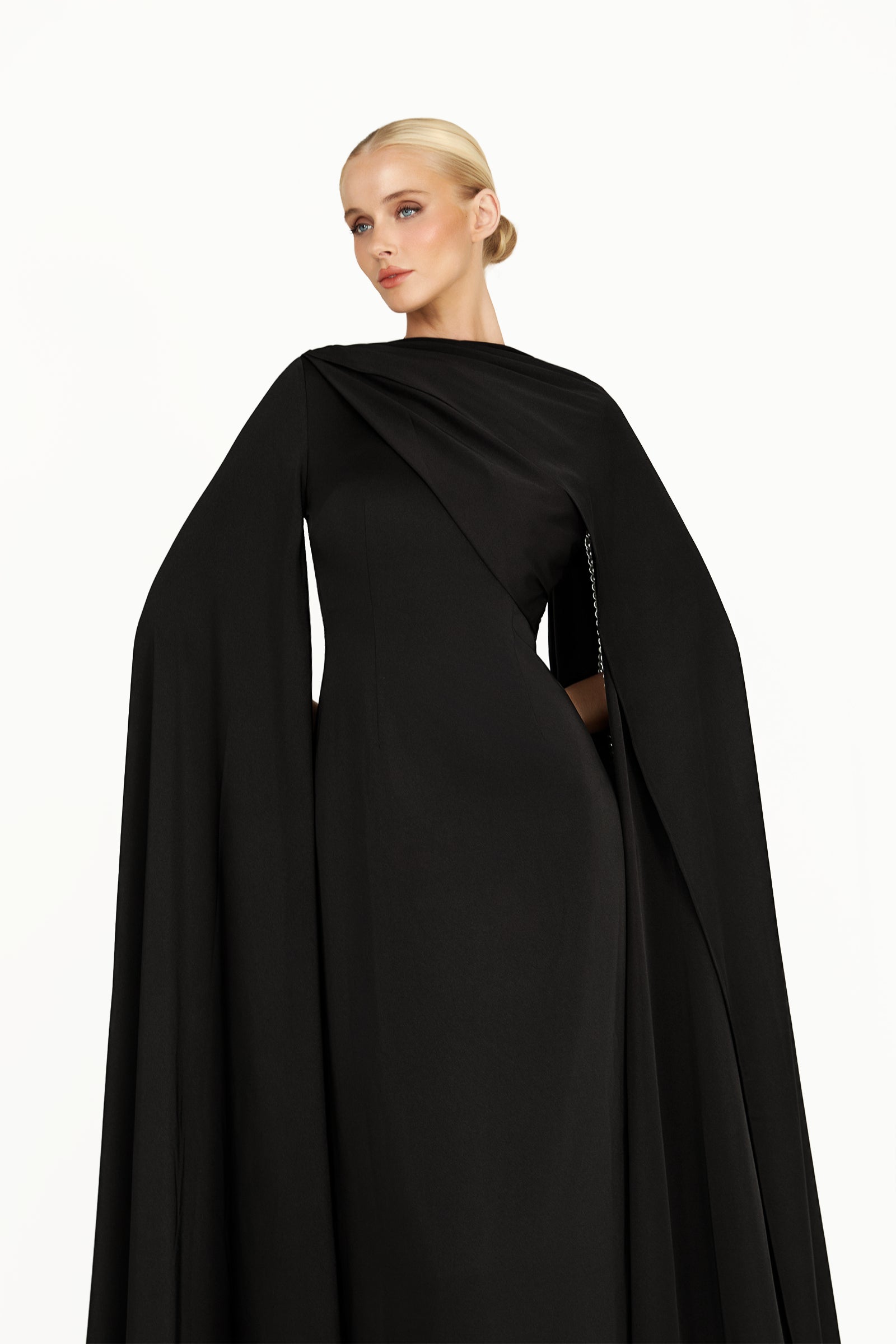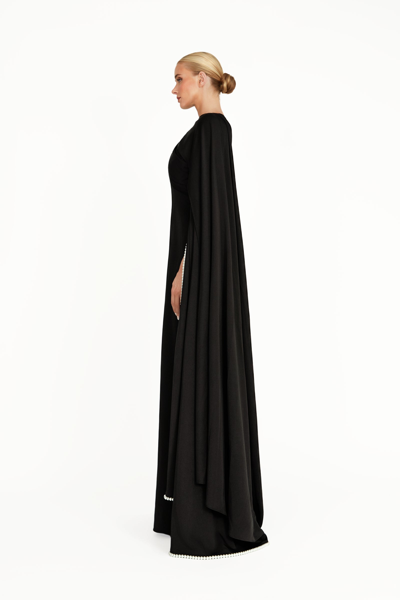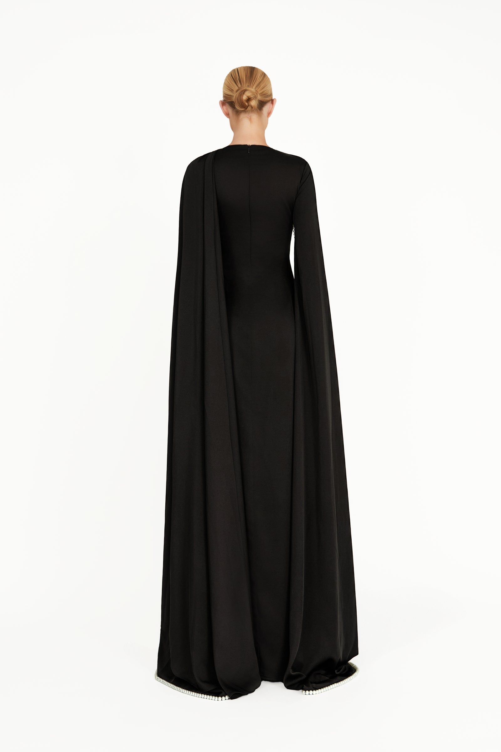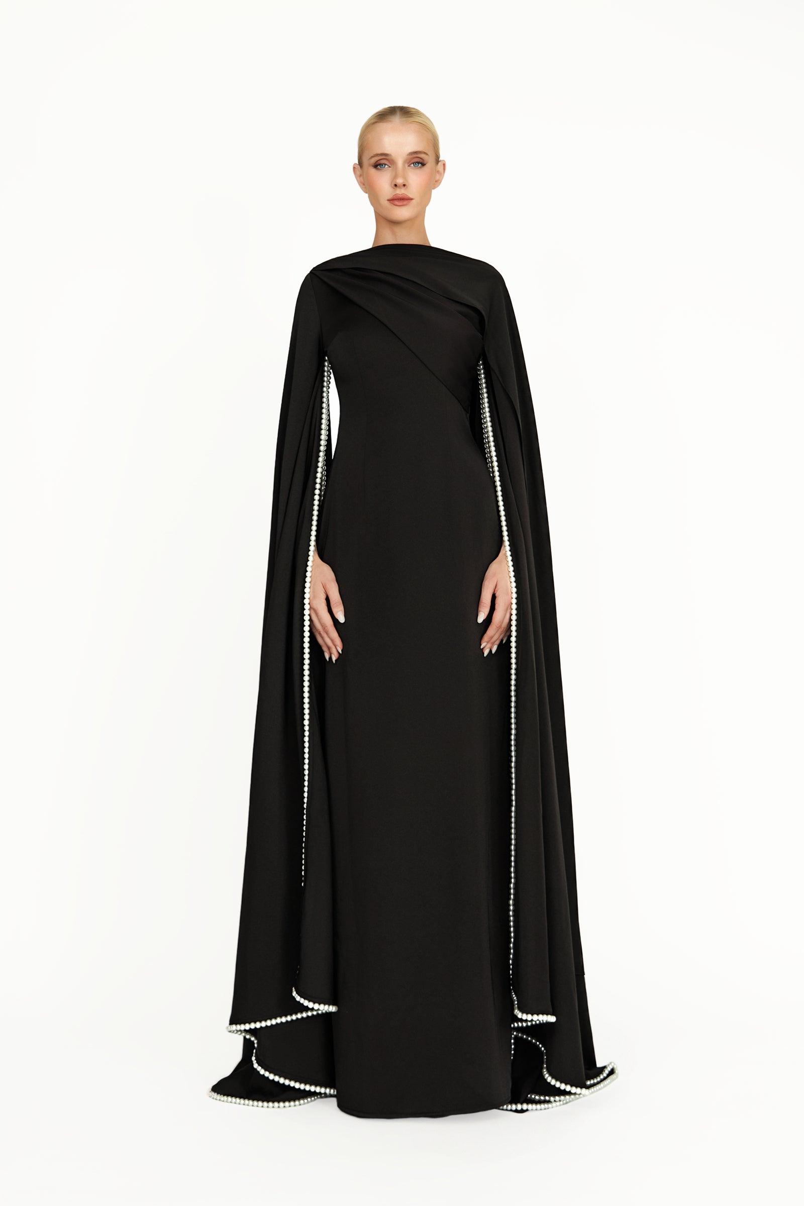 Introducing the Korello Dress in black, a graceful balance of refinement and modern sophistication. Crafted from luxurious satin, this dress features long, flowing sleeves, a softly gathered neckline, and delicate pearls on the trim, offering elegant coverage while beautifully framing the shoulders. The gentle A-line silhouette falls fluidly, creating a timeless shape that feels both contemporary and classic. Designed to flatter with its smooth, flowing fabric, the Korello Dress embodies understated luxury and chic simplicity.
