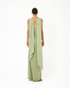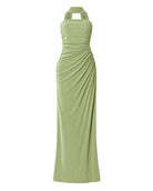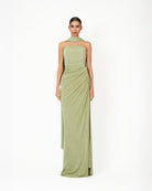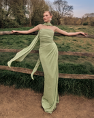 The Kahlia dress in sage green exudes understated luxury, crafted from a slinky textured lycra that glides effortlessly over the body. Featuring a bandeau neckline and gathering throughout. A hidden internal corset structure provides added support and shape, enhancing the fit while maintaining a seamless finish. The softly draped, sarong-inspired detail at the waist adds dimension and elegance, complemented by a thigh-grazing slit that offers a subtle touch of allure. The Kahlia dress is a refined statement piece perfect for both elevated day events and evening occasions.