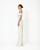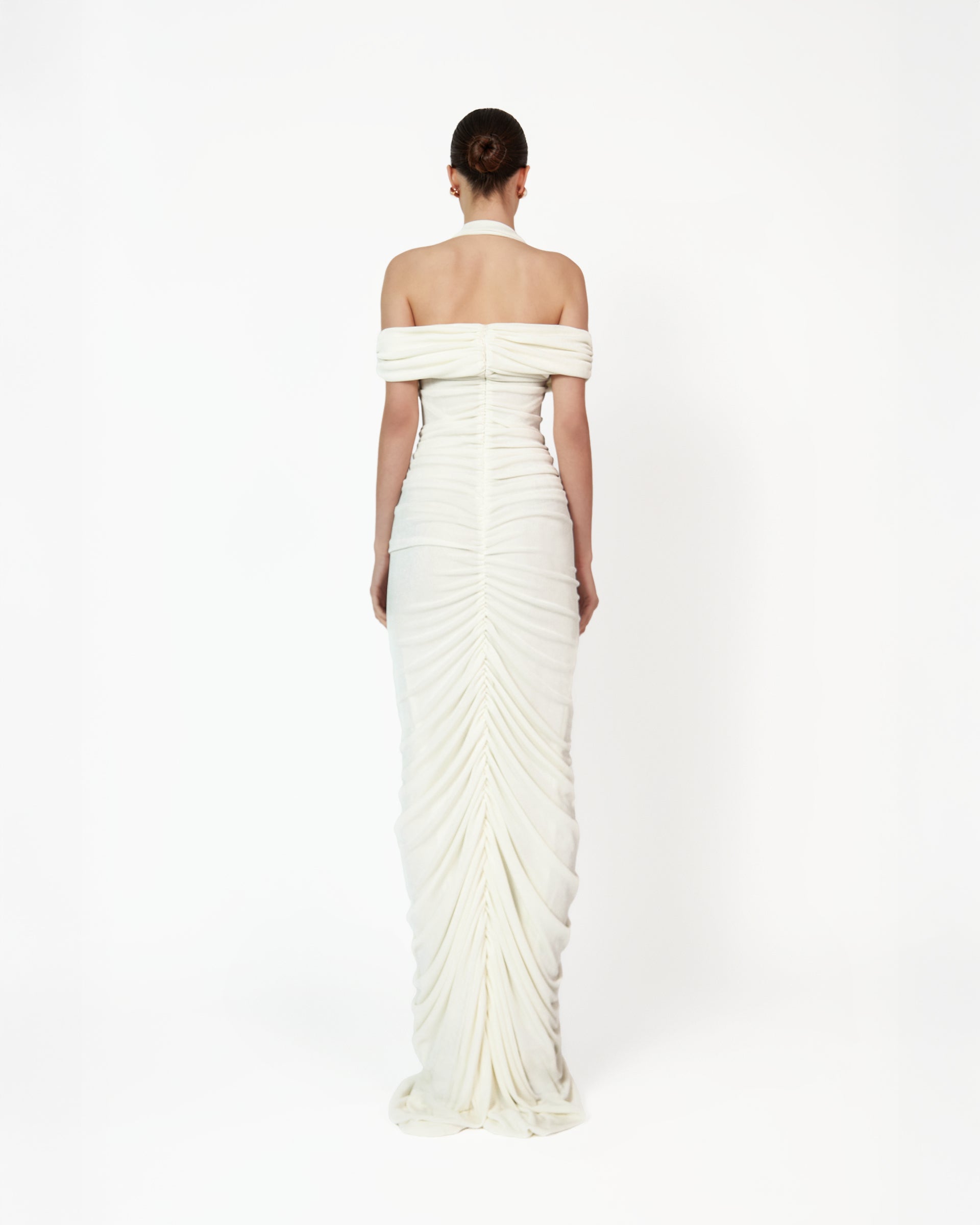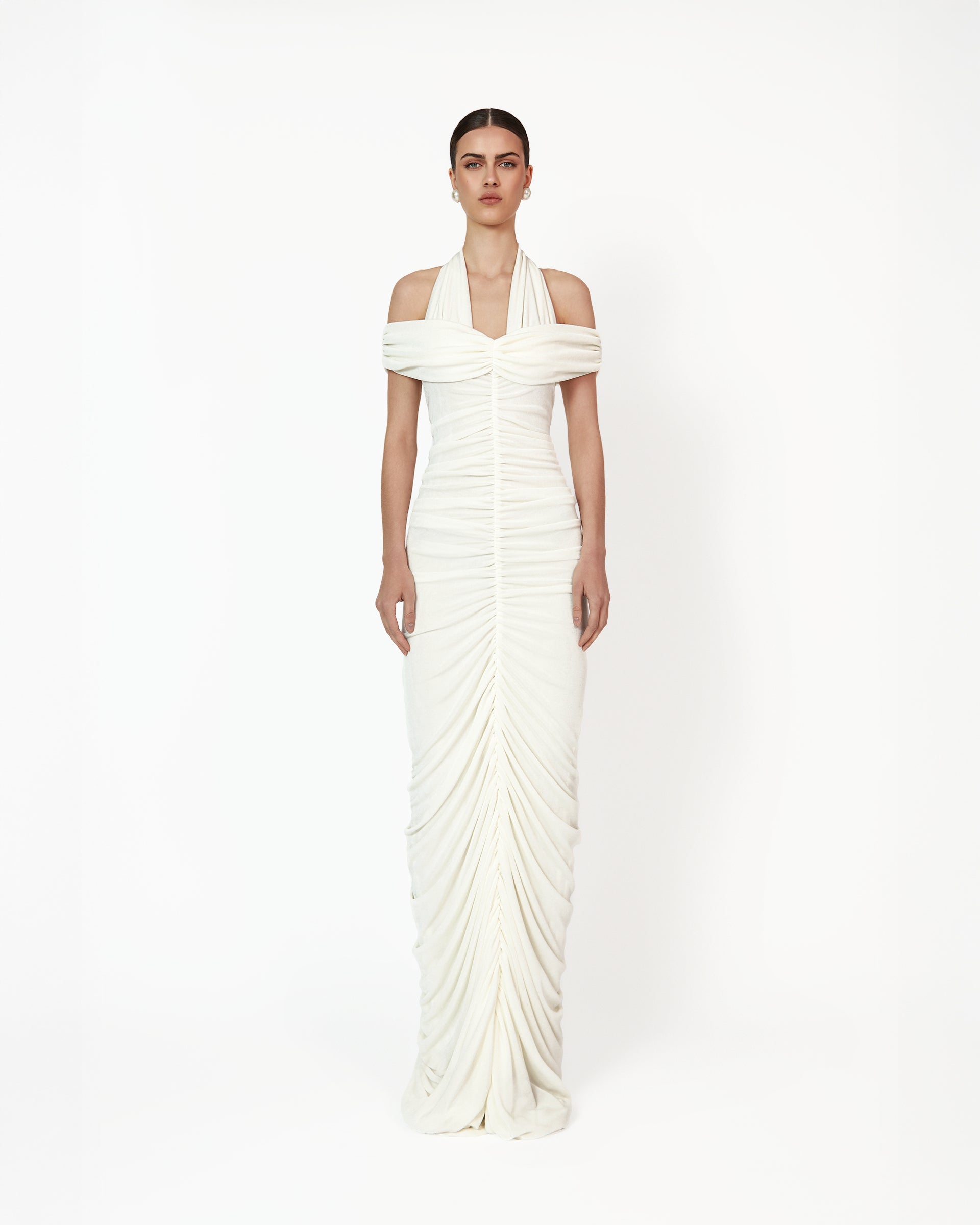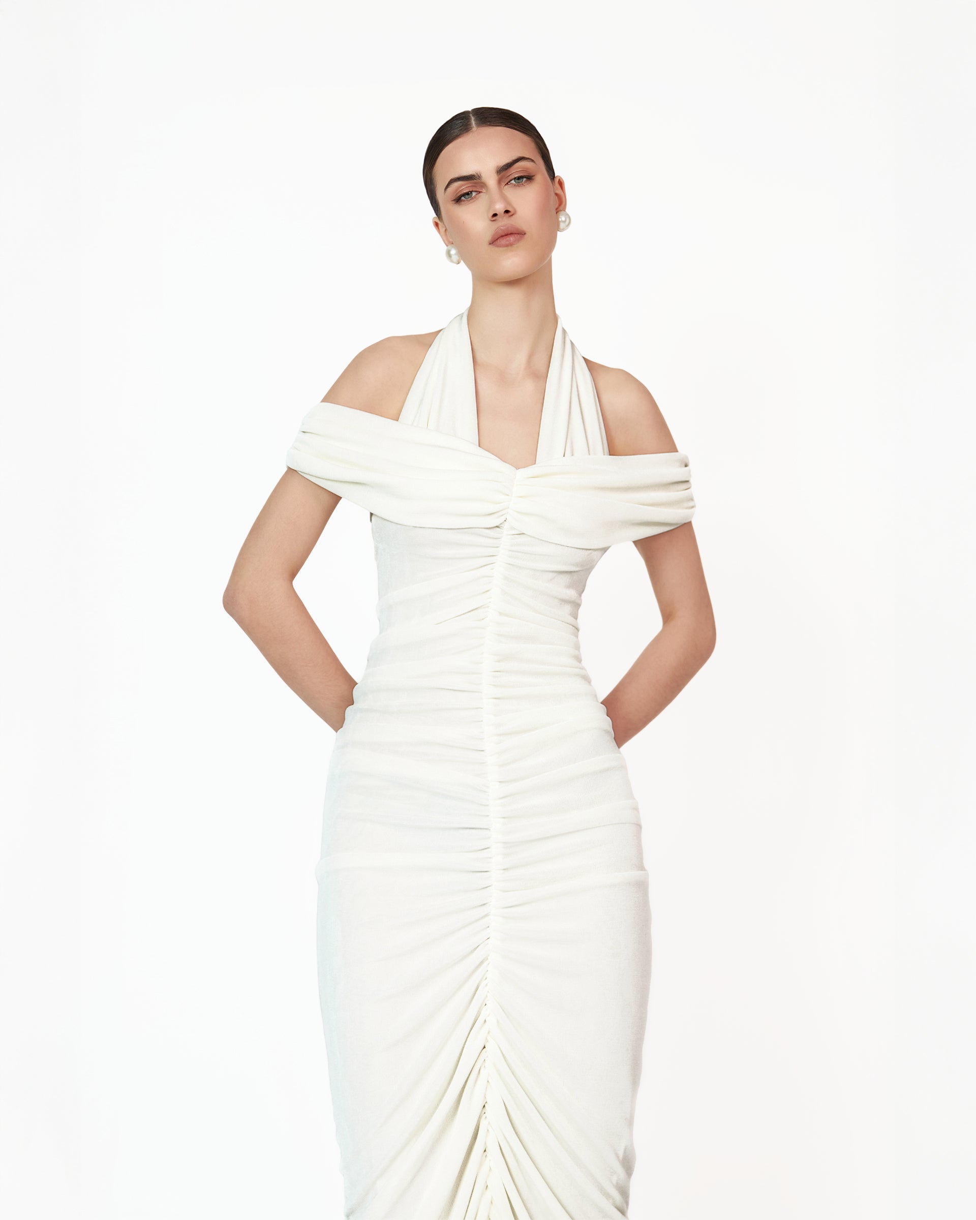 The Kaleya dress is inspired by our best-selling Korro dress, reimagined for a truly special day. Featuring ruched gathering throughout, the dress contours the body with a flattering, sculpted fit. The halter bralette adds a touch of elegance, while the off-shoulder Bardot overlay enhances the neckline with effortless grace. Ideal for engagements or any occasion that calls for understated sophistication, the Kaleya dress combines modern design with timeless allure.