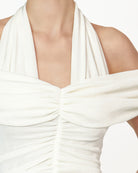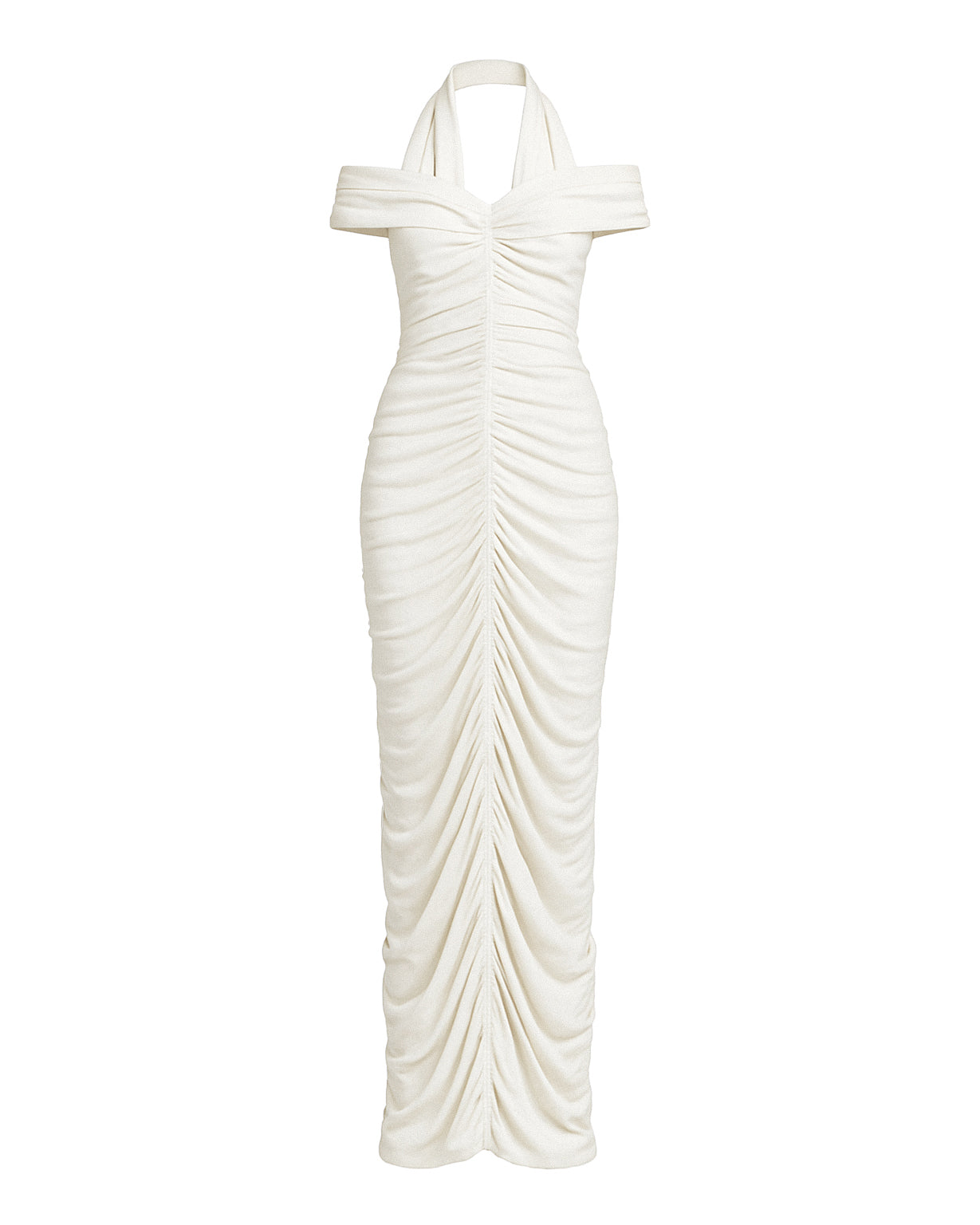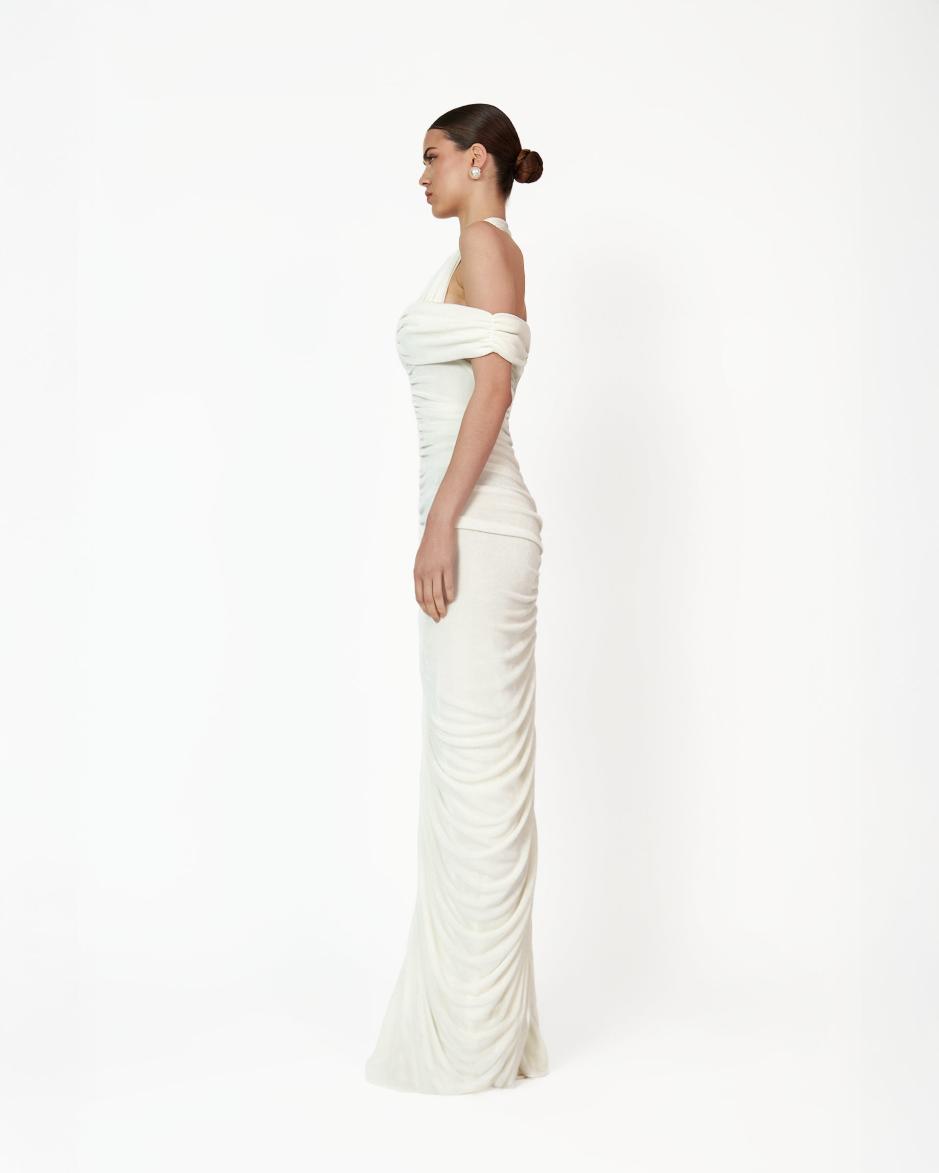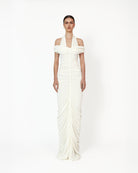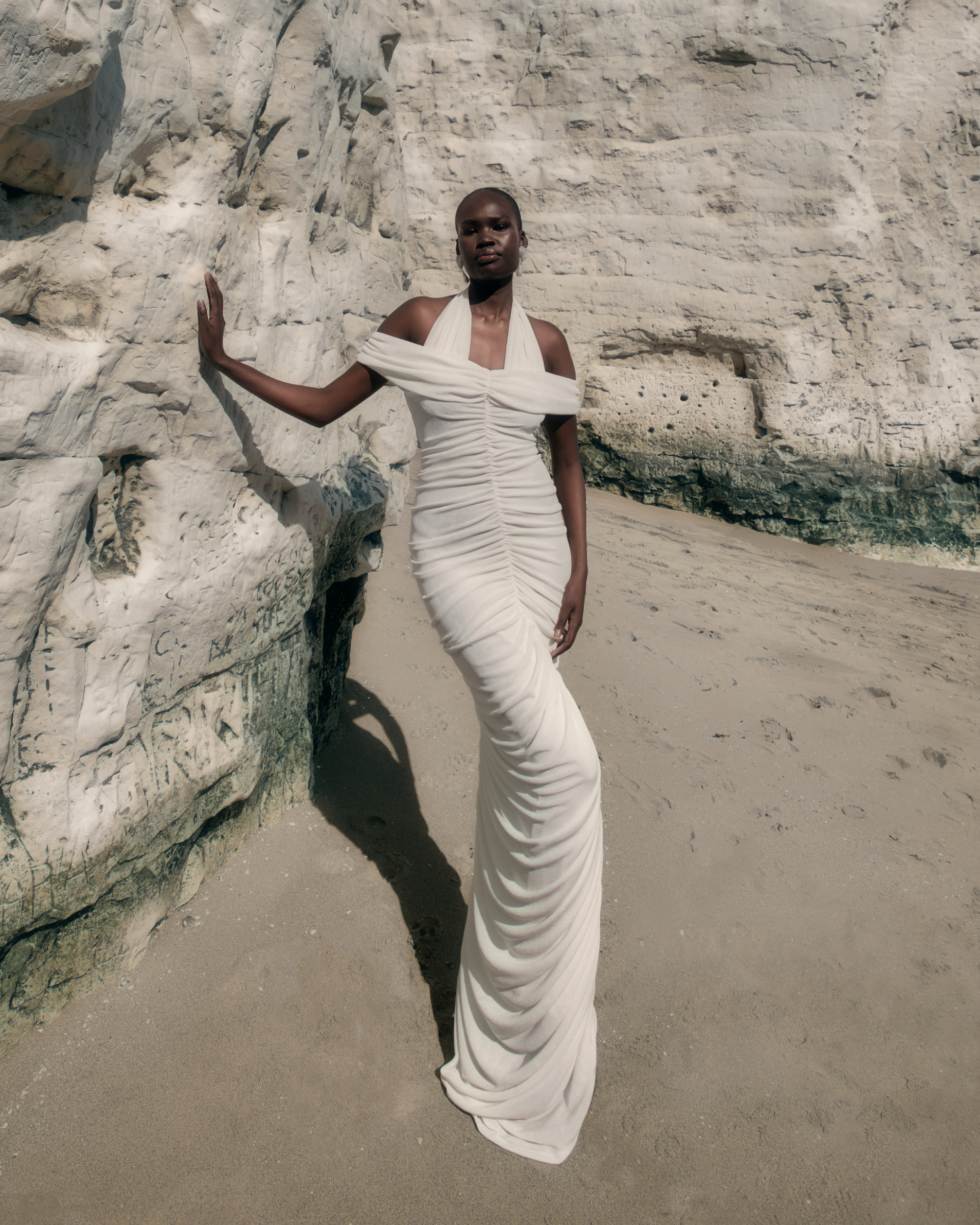 The Kaleya dress is inspired by our best-selling Korro dress, reimagined for a truly special day. Featuring ruched gathering throughout, the dress contours the body with a flattering, sculpted fit. The halter bralette adds a touch of elegance, while the off-shoulder Bardot overlay enhances the neckline with effortless grace. Ideal for engagements or any occasion that calls for understated sophistication, the Kaleya dress combines modern design with timeless allure.