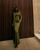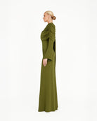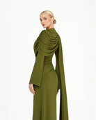 The Karelia Dress in khaki green is a modest yet elegant design, featuring a gathered sarong detail across the hips that flatters the silhouette. An overlay drapes gracefully across the neckline, complemented by a scarf sash attached at the shoulder for a sophisticated finish. Crafted from recycled lycra fabric, the dress combines timeless elegance with modern refinement, perfect for formal occasions or stylish day-to-evening wear.